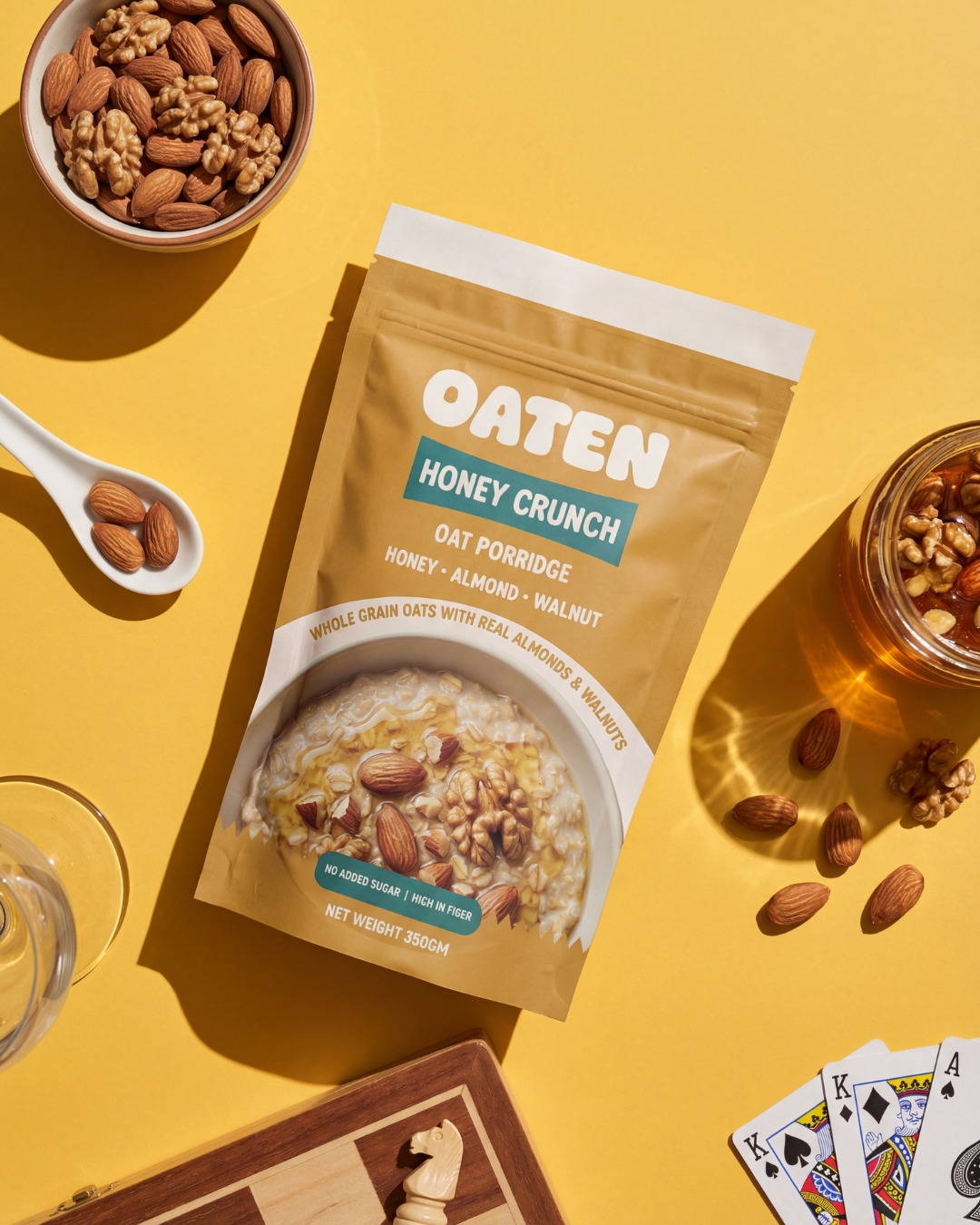 Oaten is a modern oat porridge brand created to simplify everyday breakfasts while maintaining a strong visual identity. The goal of this project was to design a packaging system that feels clean, approachable, and retail-ready, while clearly communicating nutrition and flavor at first glance. The brand focuses on honest ingredients, warm mornings, and a balanced lifestyle, avoiding overly complex or cluttered design approaches.