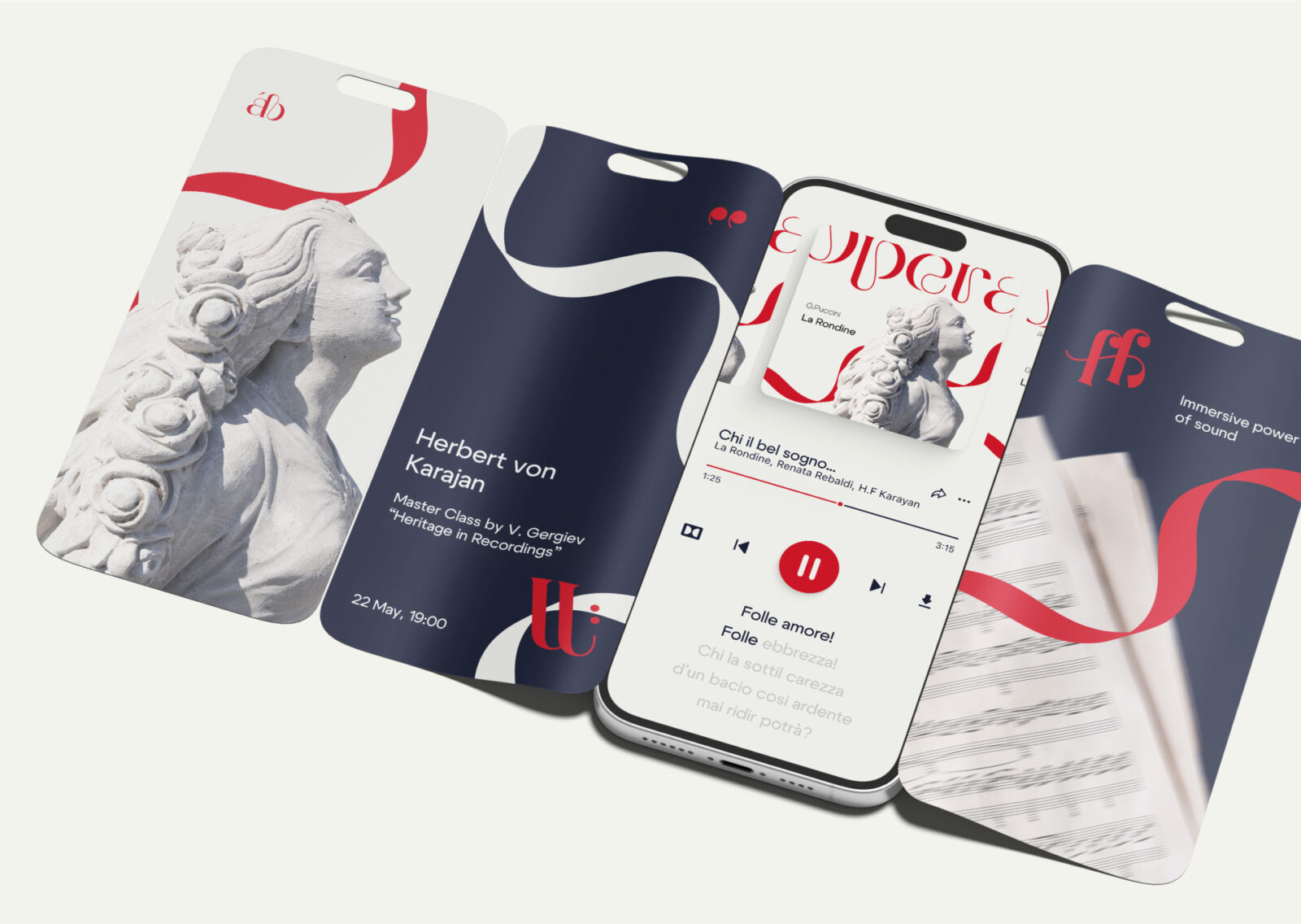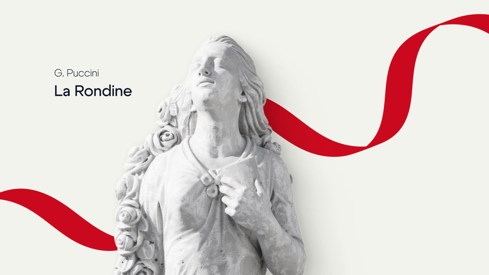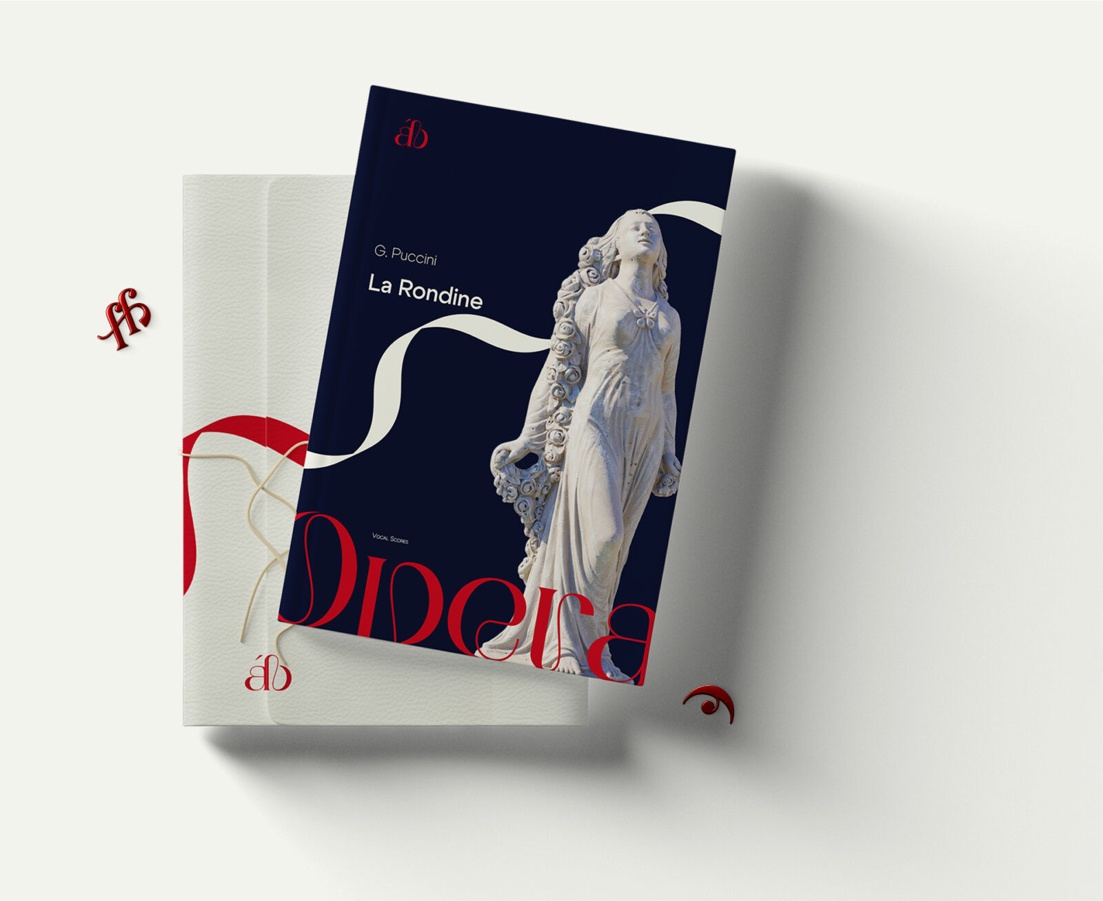 While the central musical work could be any opera or composition, I chose one of Giacomo Puccini’s most exquisite operas, La Rondine. The red ribbon, associated with the opera’s heroine Magda — depicted here as a stone statue — also embodies the arpeggio sign, whose shape mirrors that of the ribbon, serving as a key constant of the brand. Magda’s principal aria begins with an abundance of arpeggios, allowing us to almost hear the orchestra simply by looking at the visual form.