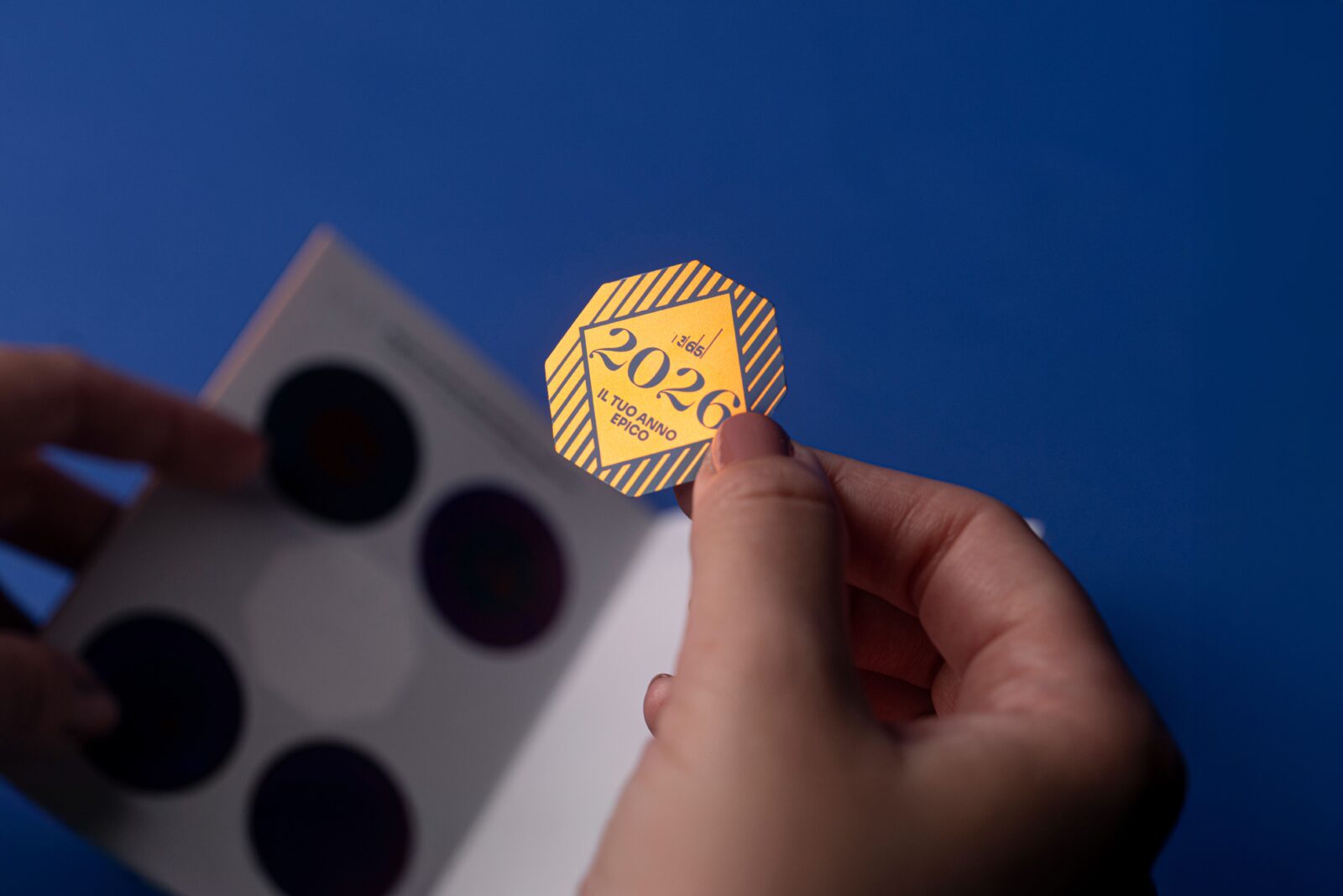 Visual and tactile interaction: a system of stamps, stickers, tear-off layers and graphic progressions that guide the user along the stages of the year.