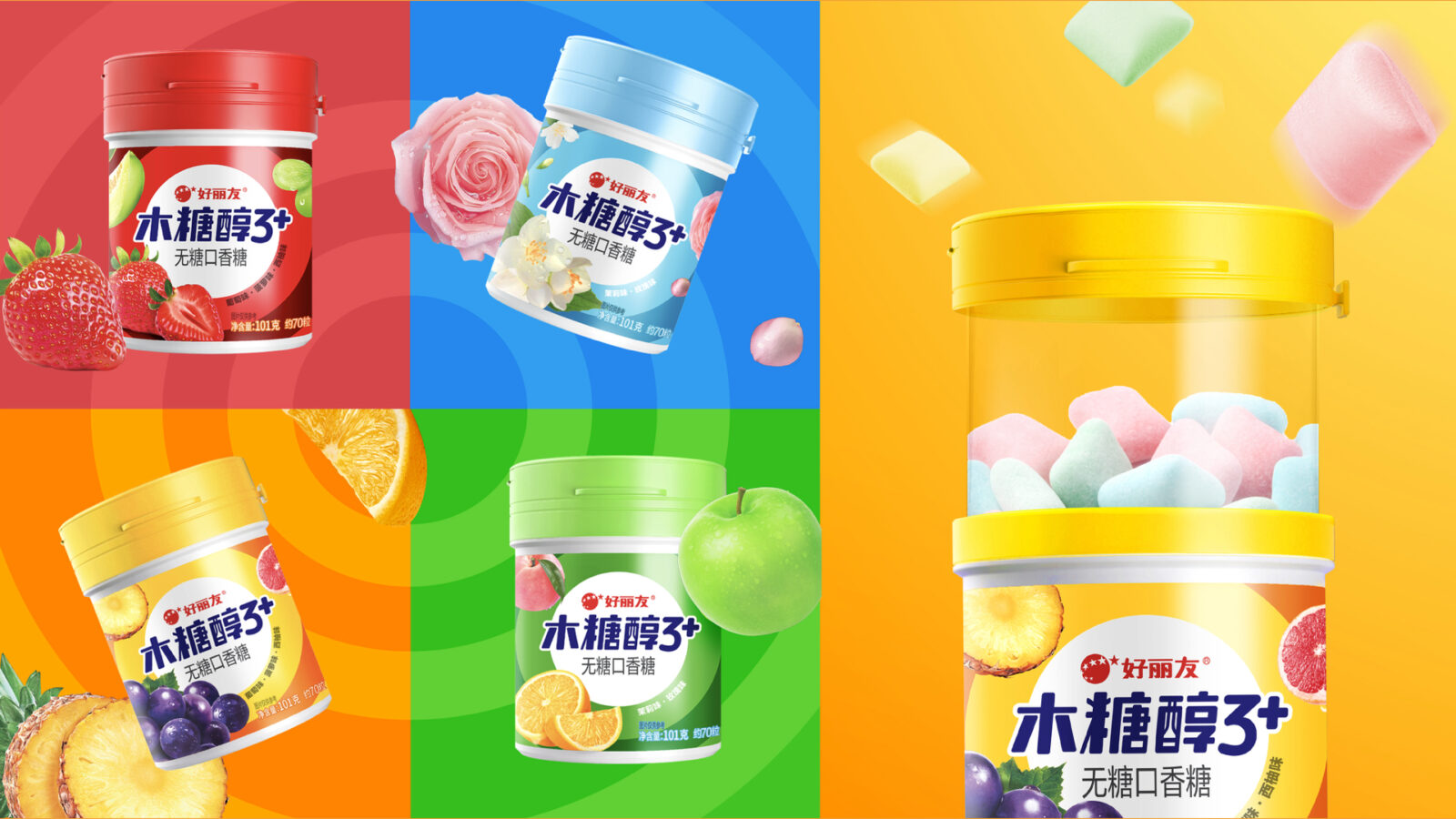Orion (the English name of 好丽友 brand ) Sugar-Free Chewing Gum, a classic health-focused oral care product, with another great advantage of “diverse fruit flavors,” which hasn’t been intuitively perceived or remembered by consumers. To address this, Orion partnered with ShinyBay to give this fruit gum packaging a fresh new look. The goal was to maintain brand recognition while infusing the new packaging with a sense of deliciousness and using youthful visual language to enhance the product’s appeal.