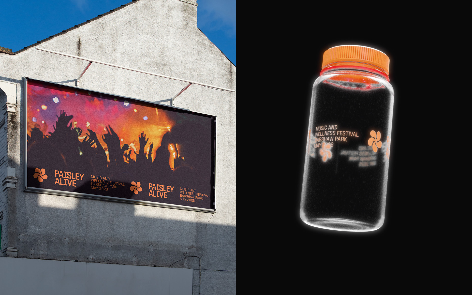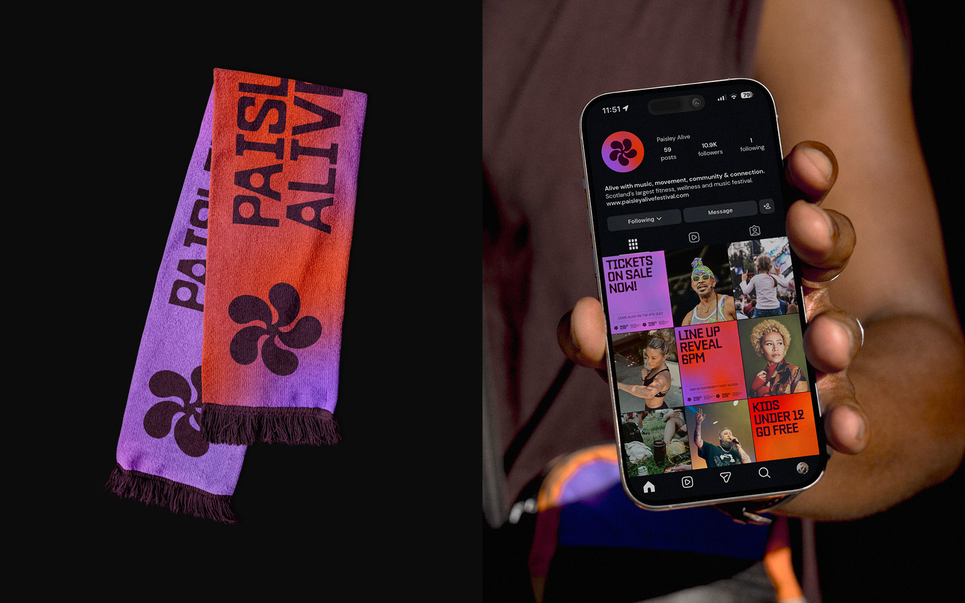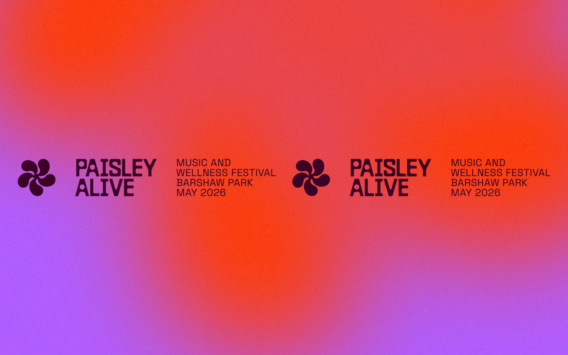 The brand marque is a minimal nod to the famous Paisley pattern, directly linking the identity to the heritage of the town in a contemporary way. Inspired by the energy of sound, the marque pulses with movement, creating an eye catching element that embodies the spirit of the festival.