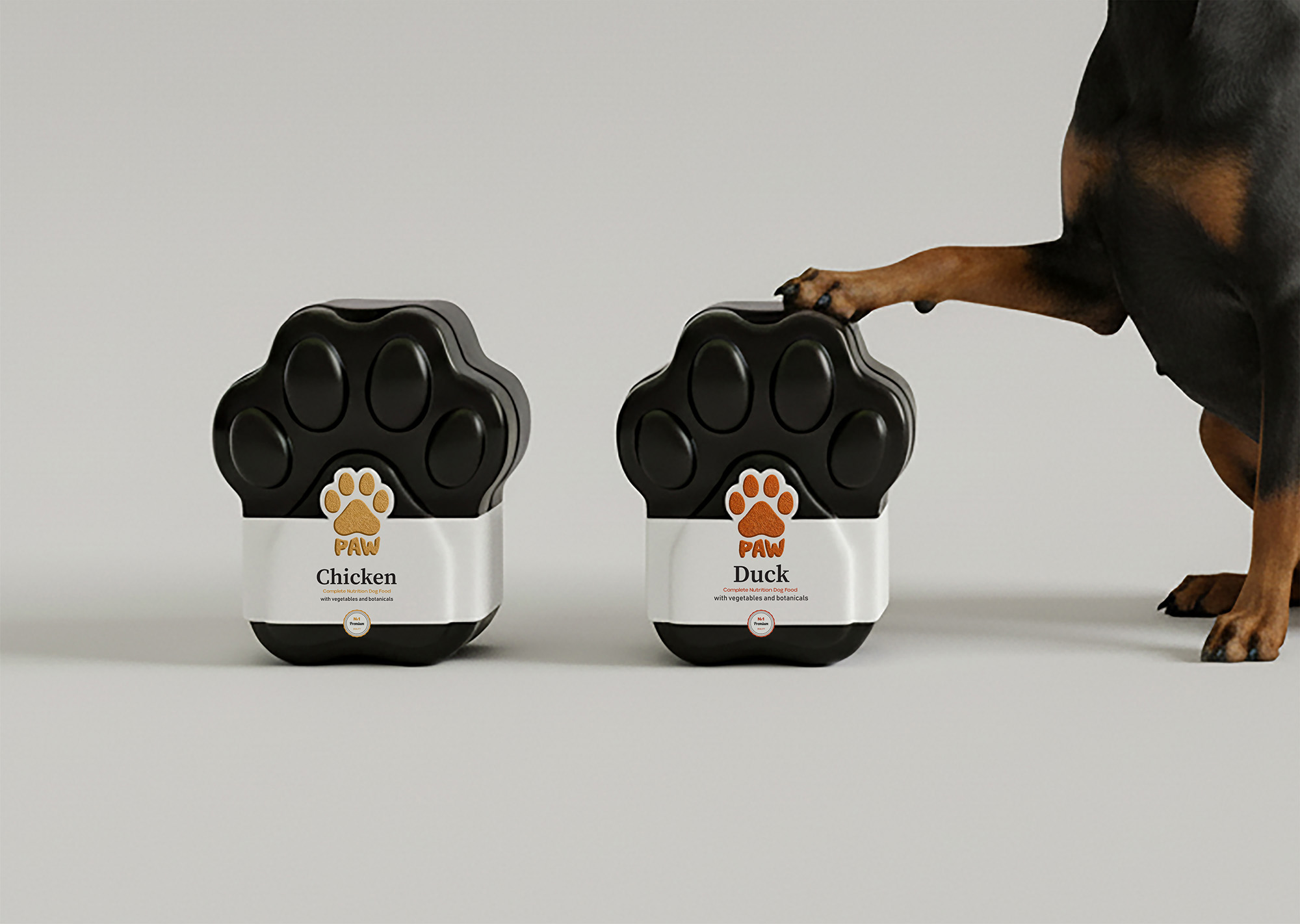 I received an order to create a creative packaging design for a box of dog and cat food. Starting from the choice of the name, everything was on my shoulders. And I started doing research. It all started with the name. I thought for a long time about what name to give the brand, which would fully characterize dogs and cats, and I realized that the name PAW was the ideal option in this case. And I decided that I would characterize the logo with a dog’s paw. I used a dog’s paw icon in the logo, and wrote the text part in a bubble font, which is more typical for animals and would be better typical for this product. After doing all this work, I moved on to thinking about the packaging design. I conducted a market study and realized that no matter how many creative solutions there are, there is no box in the shape of a dog’s or cat’s paw. And in this case, my choice fell on a dog’s paw – what if the box is also a dog’s paw, I thought and started working on the box. The box should be dark black, metallic, so that it can also be used as a food bowl. This way, I got a pretty elegant and premium box. The food would come in three flavors: chicken, duck, and fish. The chicken and duck flavors are intended for dogs, and the fish flavor is for cats. Therefore, it was necessary to make it so that when looking at the box, it would be immediately clear which food was intended for whom. And I decided to divide the types into colors: chicken food would be yellow, duck food would be orange, and fish food would be blue.