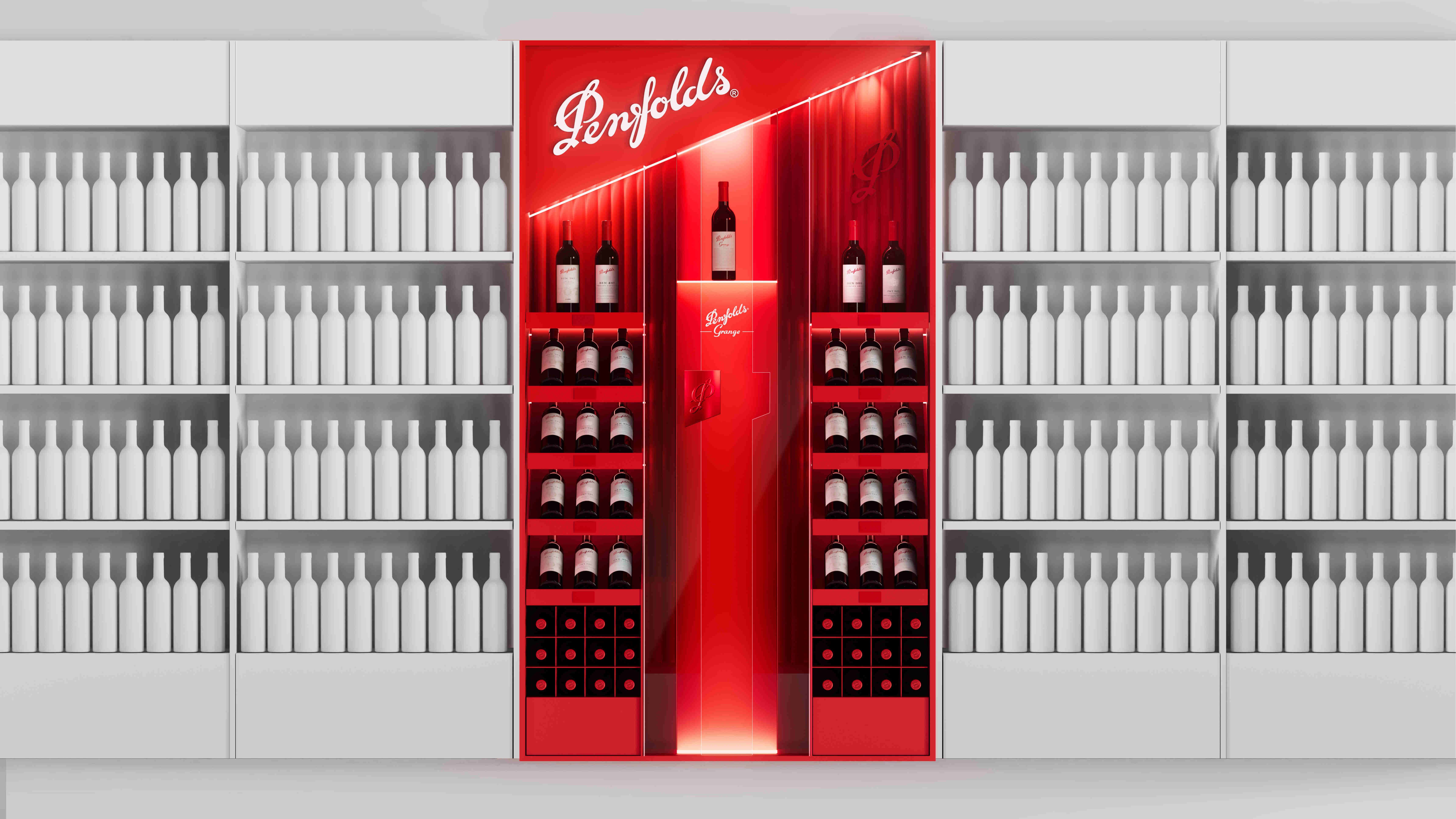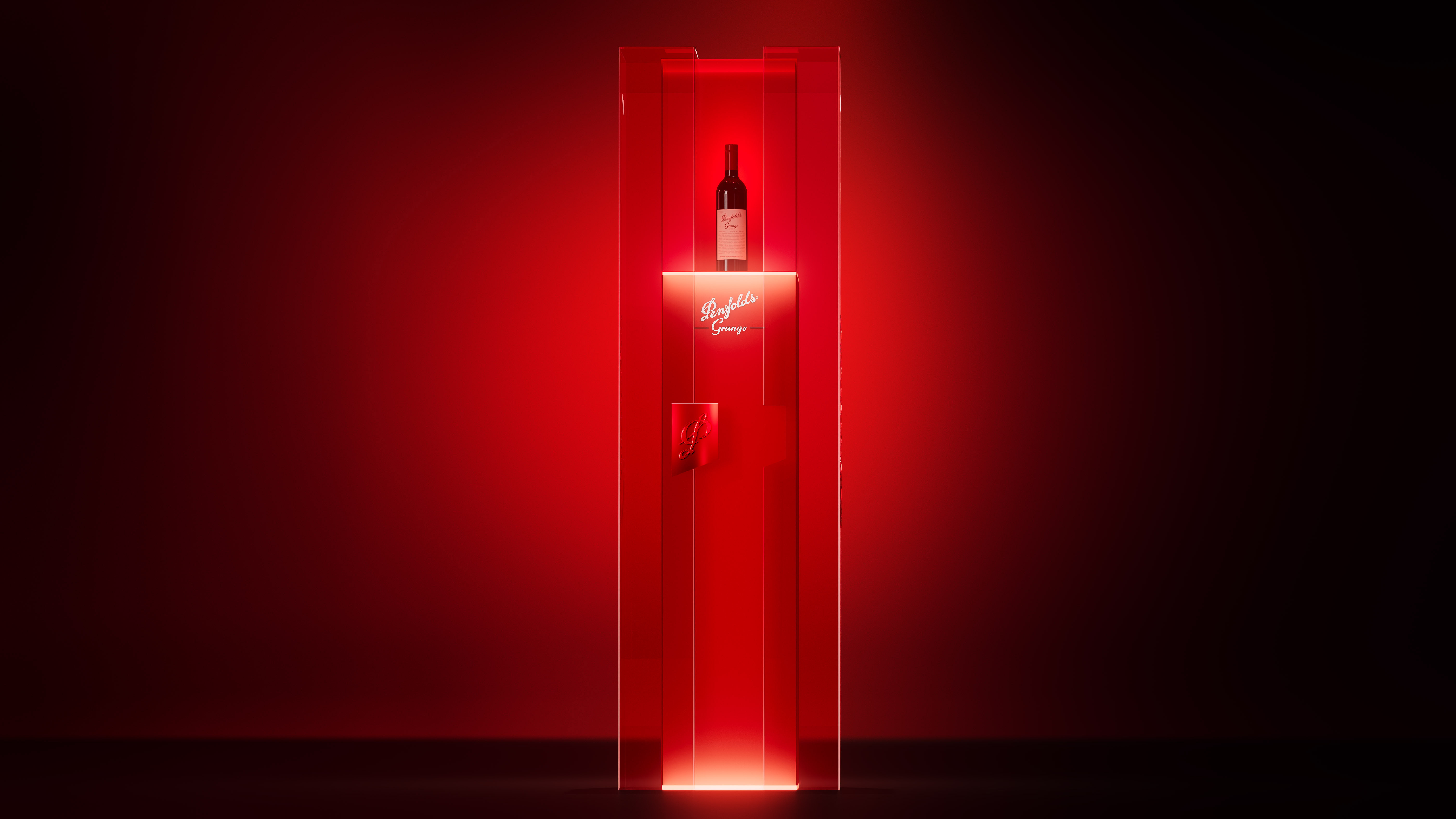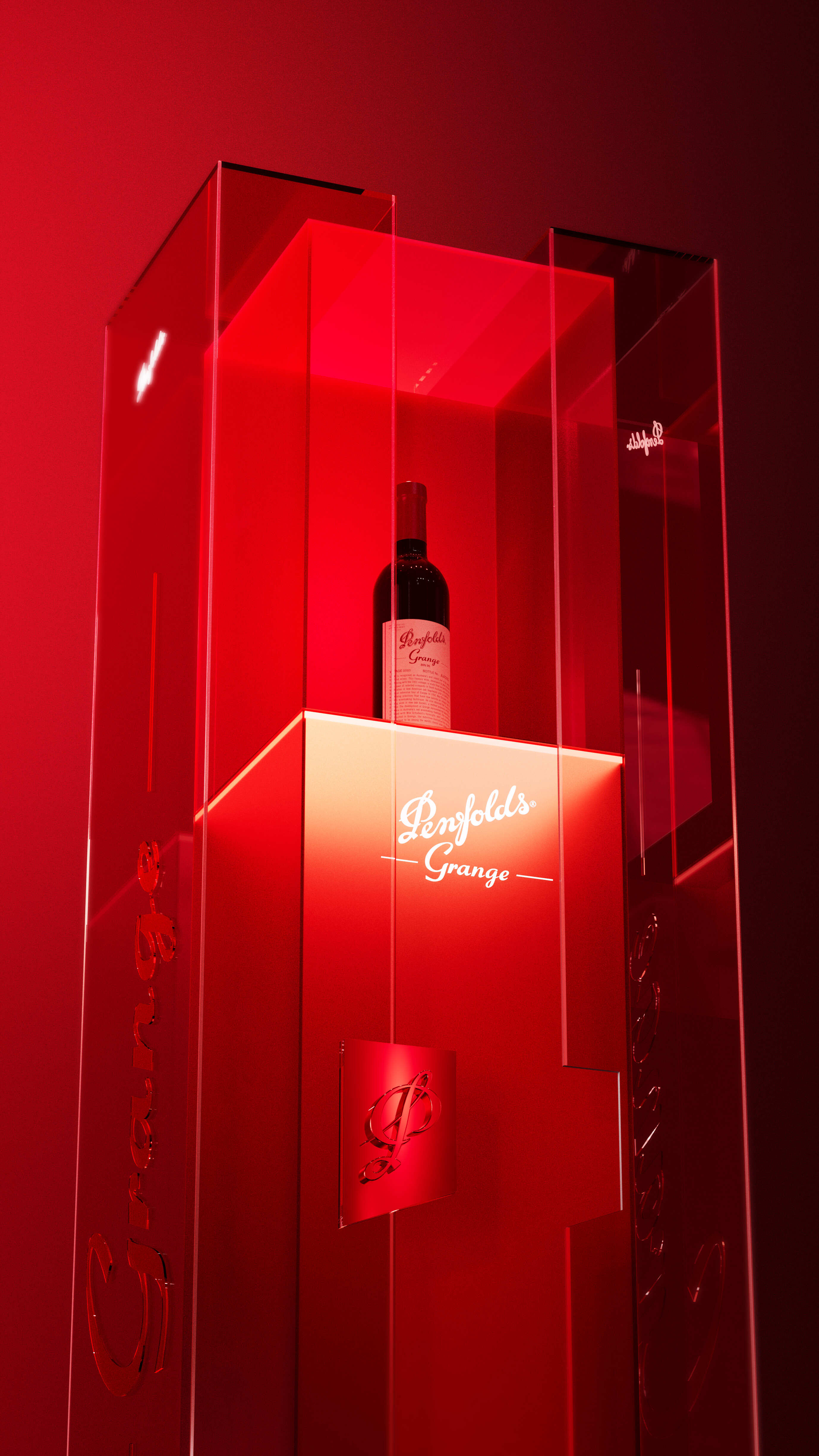 The design places Grange behind glass, framed by an architectural structure, with carefully choreographed lighting and mechanics that enhance the consumer experience, signalling its status as the pinnacle of the Penfolds portfolio.