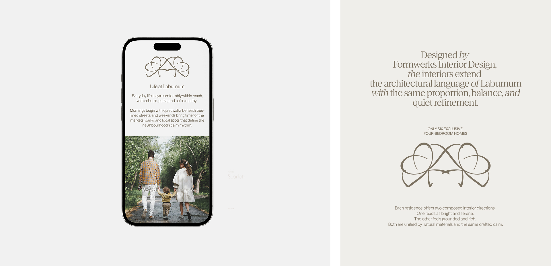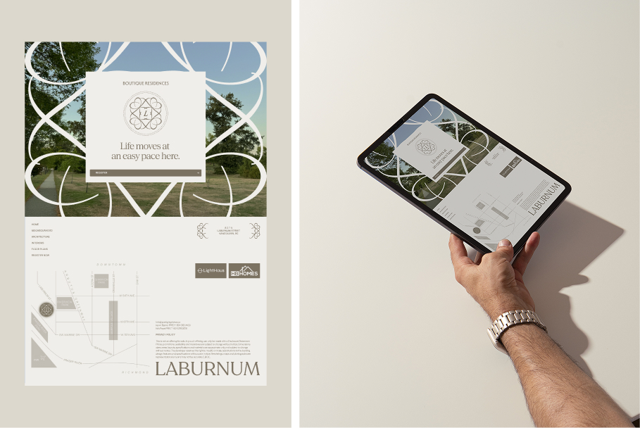 Laburnum is a boutique residential complex in Canada, consisting of six exclusive four-bedroom homes designed for calm, family-focused and multi-generational living. The project explores how quiet luxury can be expressed through a functional identity system that other disciplines can actively use.