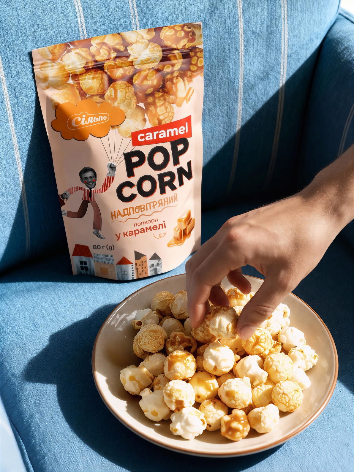 We literally gathered popcorn kernels into large, fluffy forms — airy clusters that visually resemble balloons. As if they were light enough to lift people off the ground. Because this popcorn isn’t meant to feel like a “heavy snack.” Quite the opposite. It’s super airy, light, and easy to take with you — a snack that fits into motion, not one that slows it down.