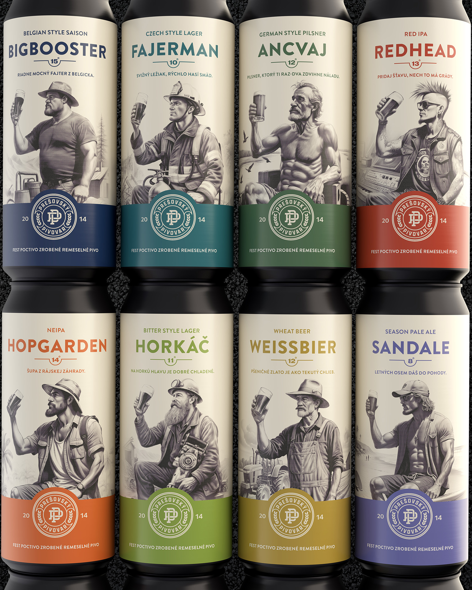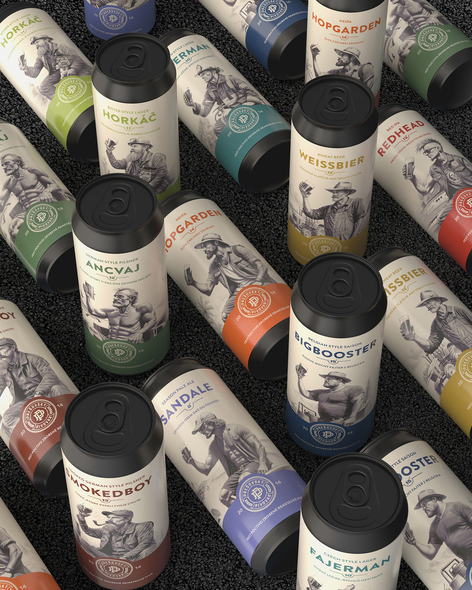 Prešov Brewery Beer Packaging Design by Majkut Works Unifies Nine Beer Varieties Into a Consistent Can Series