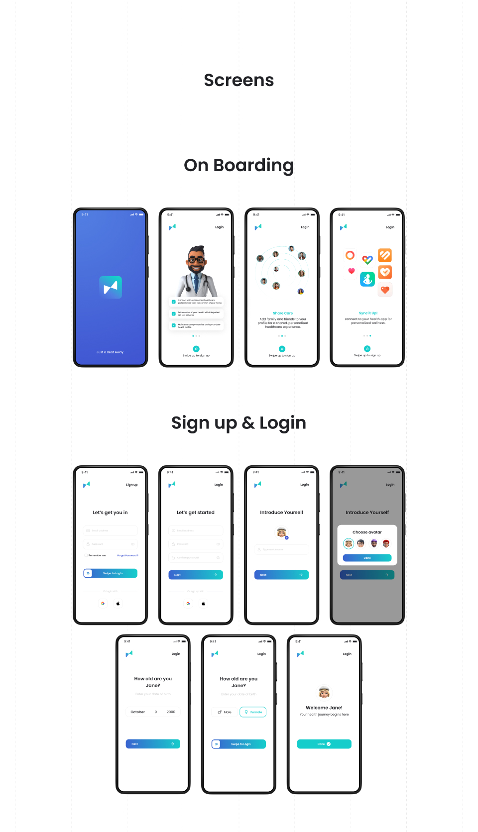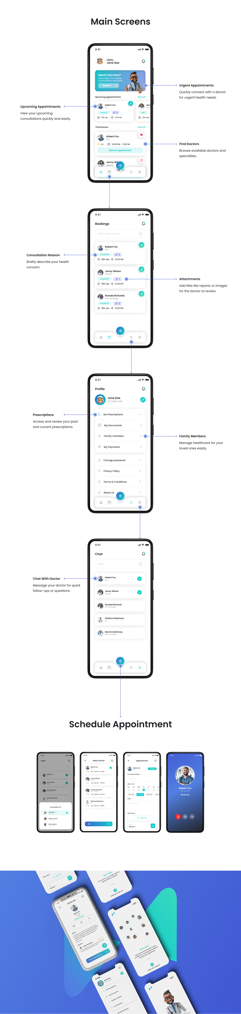 The app allows patients to easily search for doctors across different specialties, book appointments, and choose between video, audio, or chat consultations based on their needs. A clean and minimal design system was adopted to ensure accessibility for users of all ages, including individuals who may not be tech-savvy. The patient flow was carefully mapped to be straightforward: onboarding, profile creation, browsing specialists, and initiating consultations can all be completed in just a few steps.
