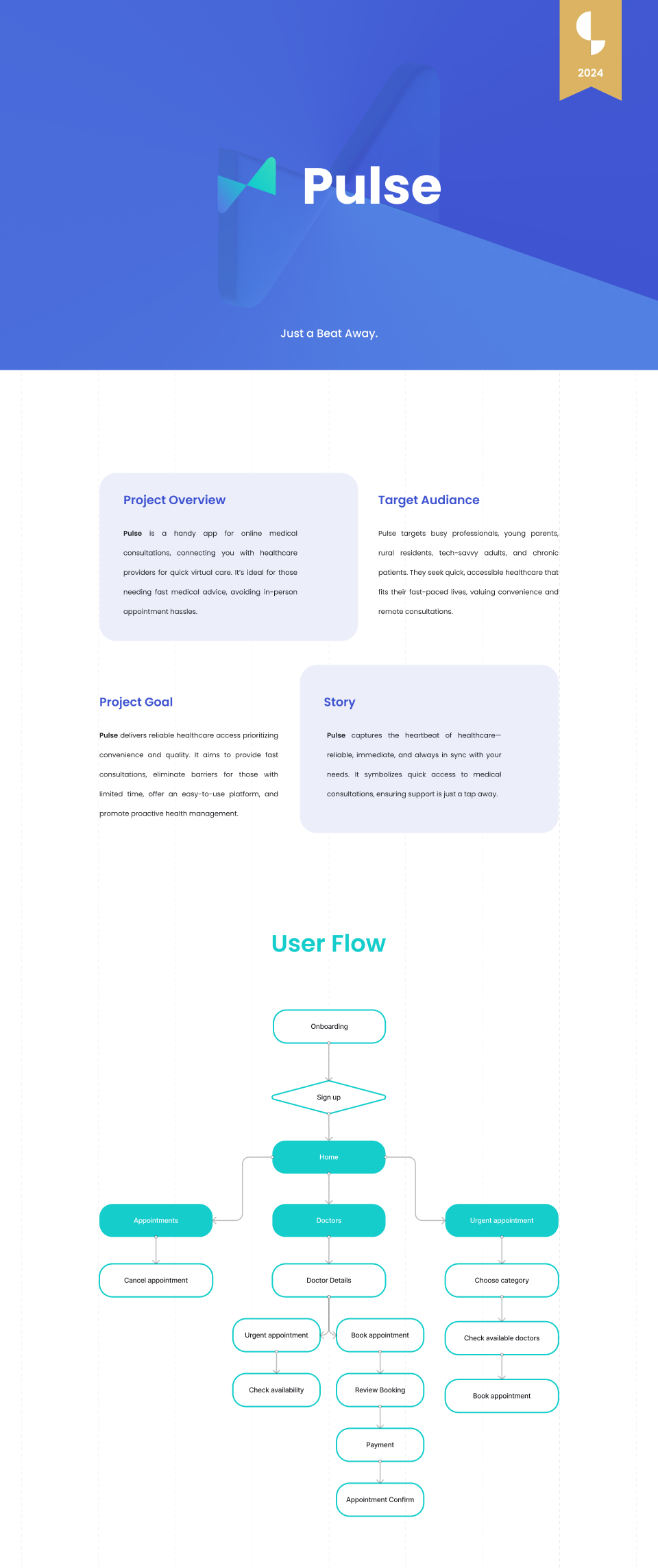 Pulse is a comprehensive medical mobile application created to simplify and modernize the way patients access healthcare services. The project was centered on designing an intuitive platform that connects patients with licensed healthcare professionals through secure online consultations. The aim was to design not just an app, but a dependable digital healthcare experience where trust, clarity, and usability come first.
