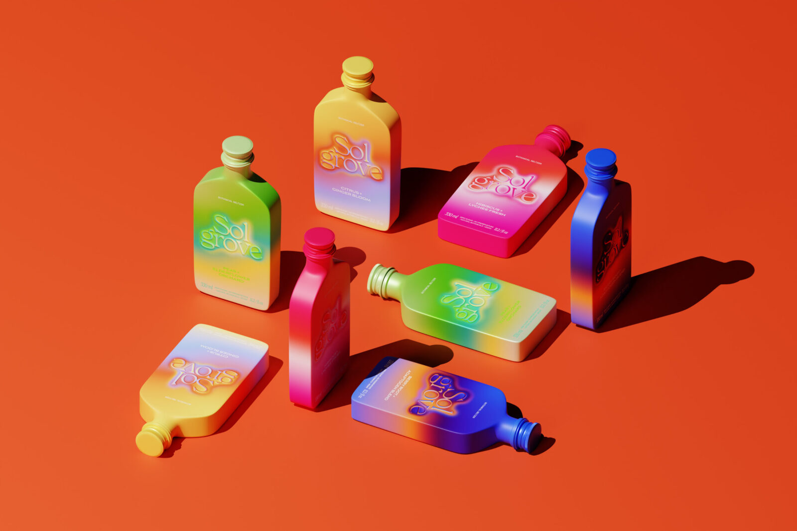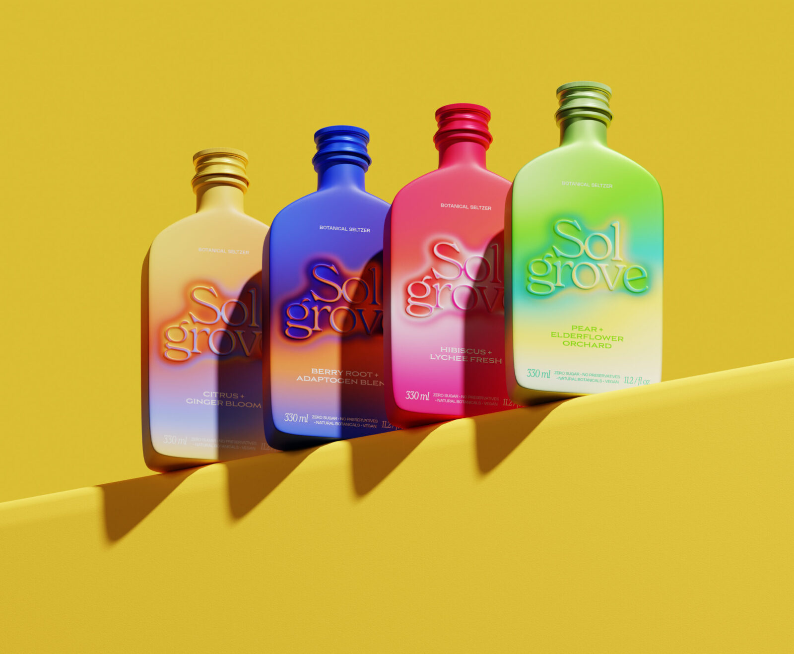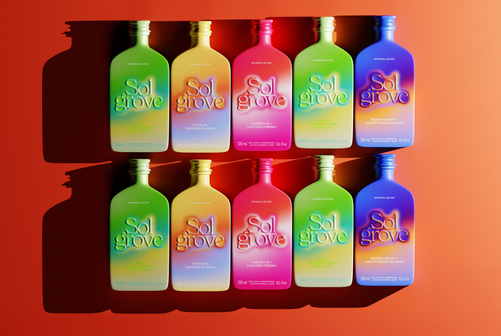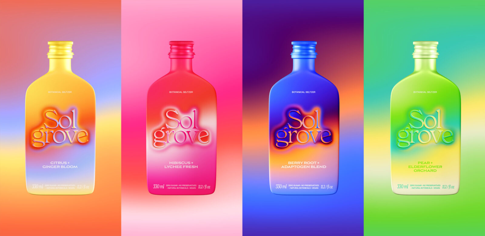 Sol Grove departs from the standard aluminum can or PET bottle seen across the seltzer category. Instead, it adopts a custom, sculpted bottle form that reinforces its sensory and energetic positioning.