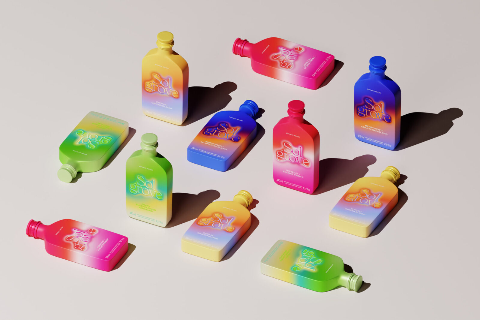 The design concept, Energy Flow, uses biomimicry to express how each flavor feels inside the body. Instead of traditional fruit illustrations, Sol Grove uses atmospheric gradients that mimic the diffusion of warmth, coolness, and vibrancy. Each bottle becomes a color-mapped expression of a botanical effect: