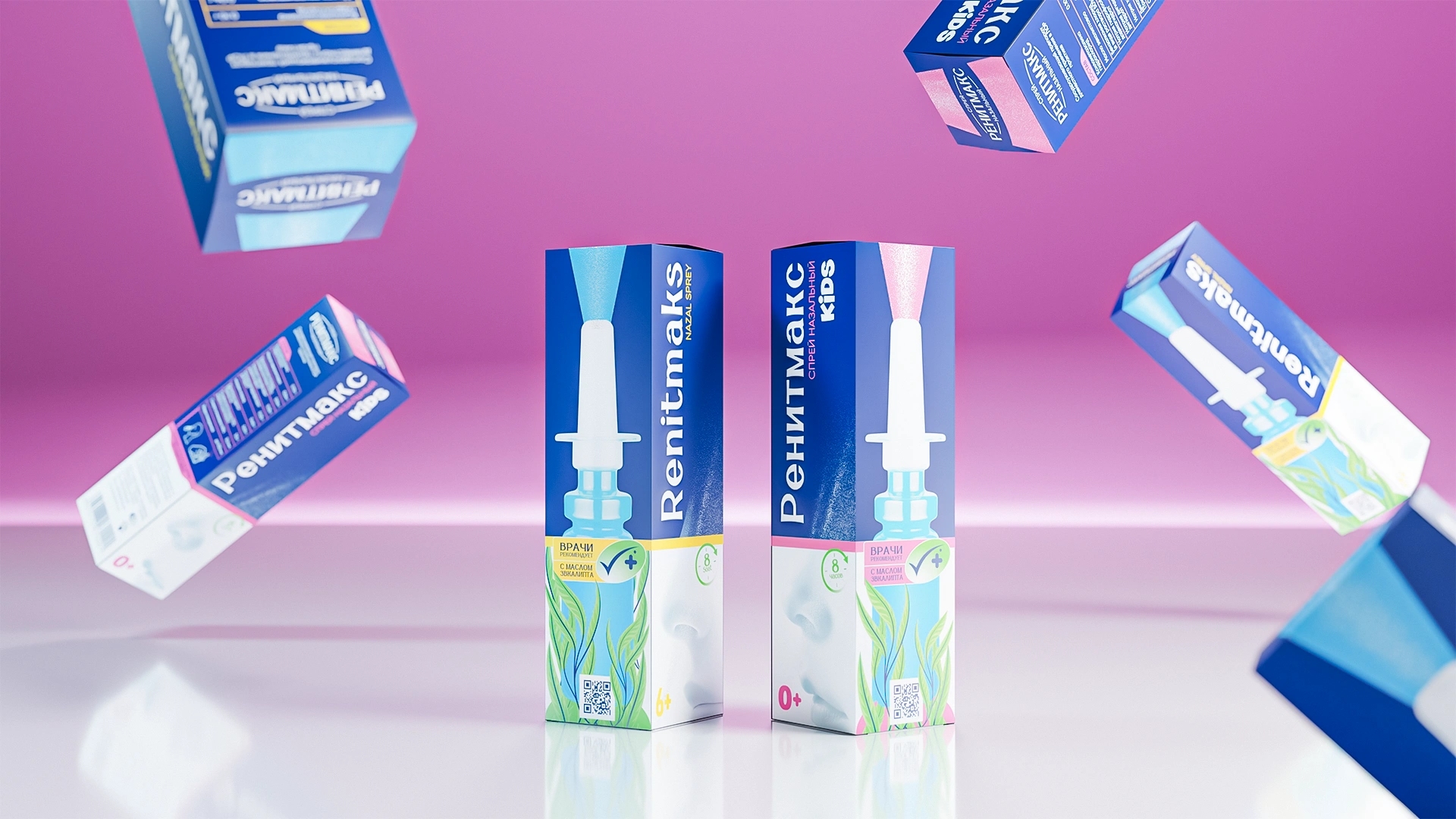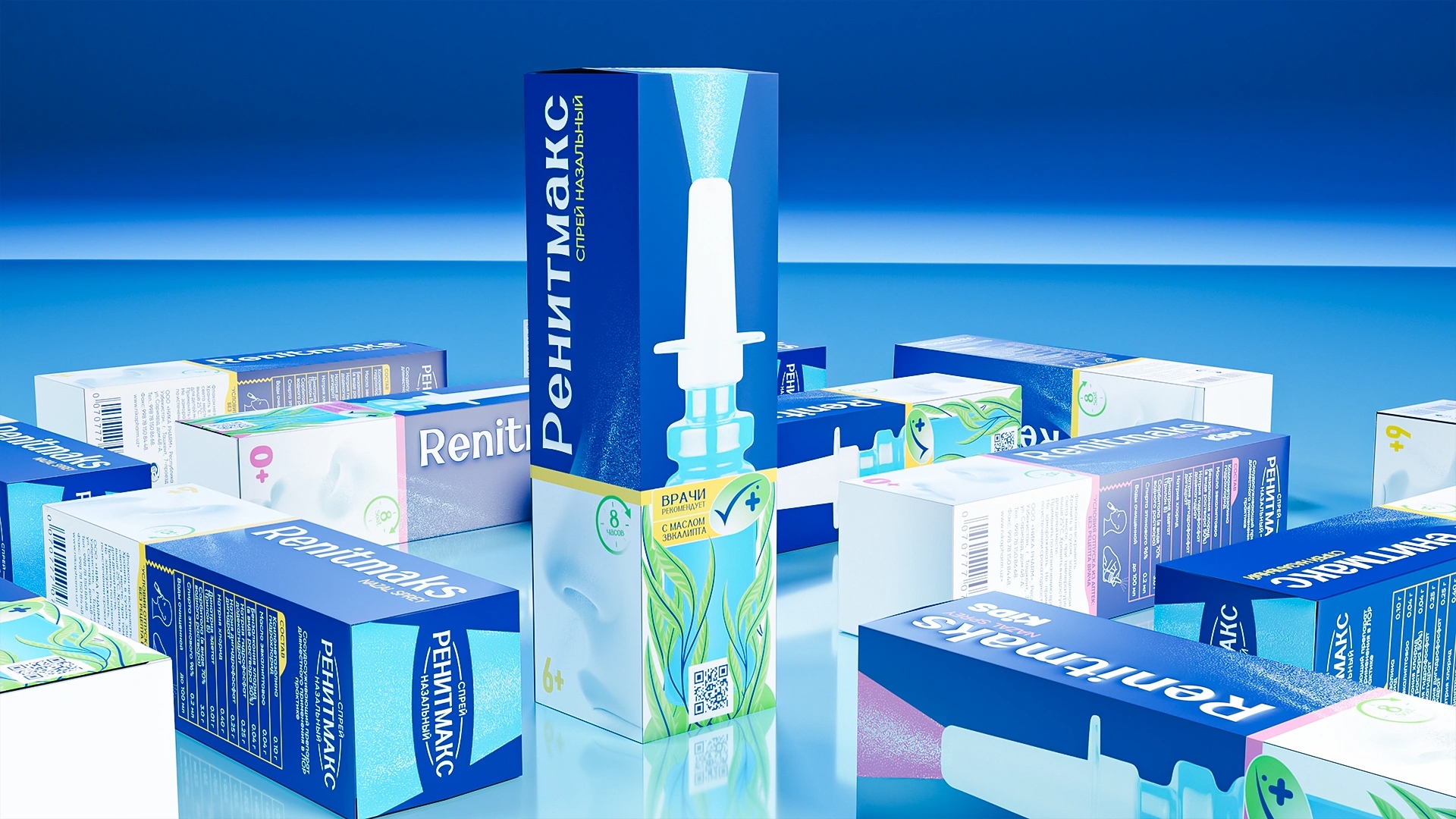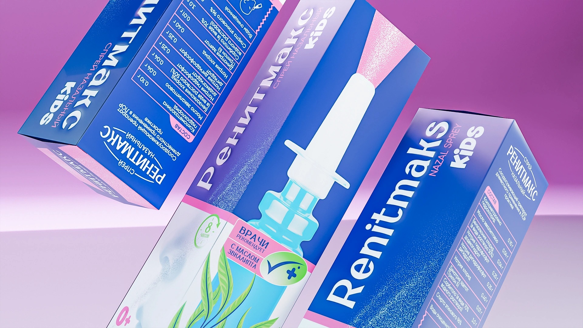 RenitMaks became a visual benchmark for clarity, purity, and contemporary pharmaceutical design Primary Color: Deep medical blue, symbolizing air, freshness, and respiratory ease. Visual Composition: Centered product image surrounded by eucalyptus leaves — a metaphor for natural relief and gentle action. Typography: Vertical and structured for easy readability on pharmacy shelves. Line Differentiation: The RenitMaks Kids range uses soft pink and blue tones, introducing warmth, care, and child-friendly associations. Design Philosophy: “Less, but clear” — minimal visual noise, maximum meaning.