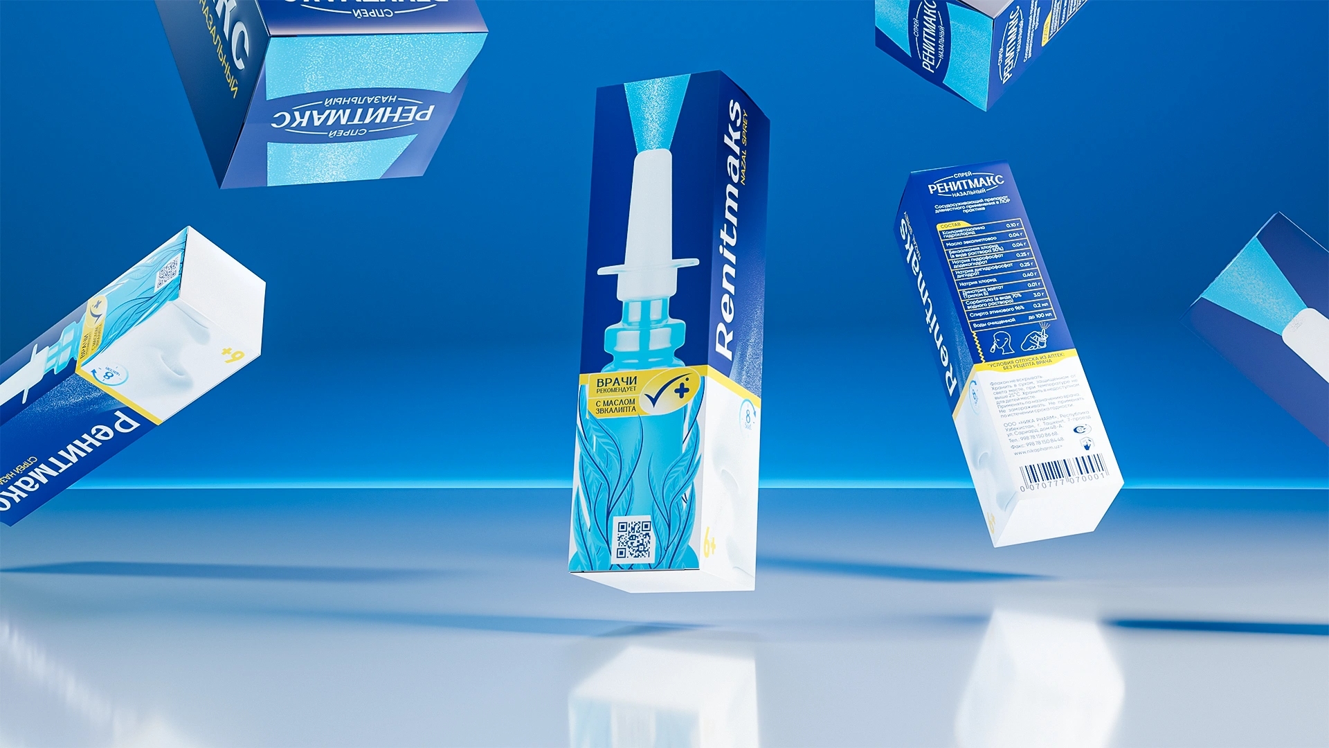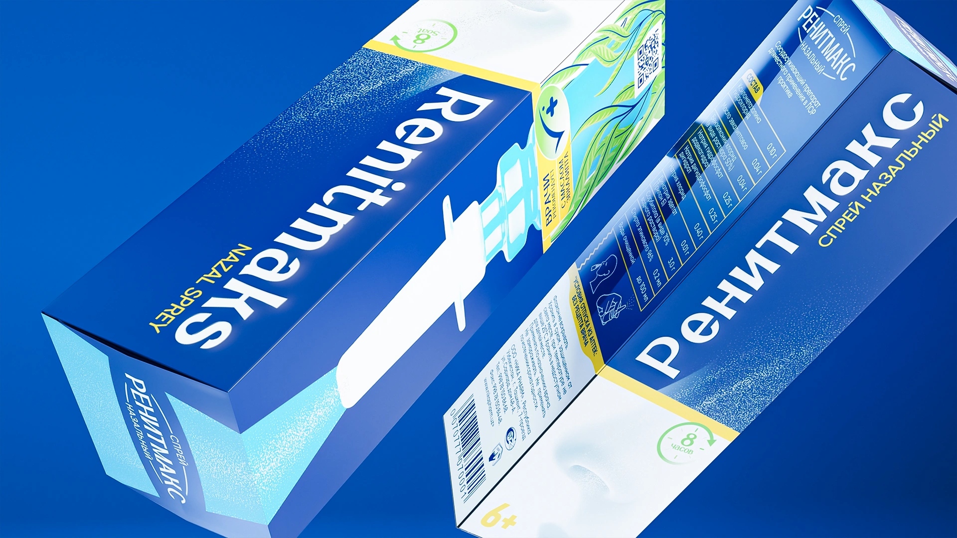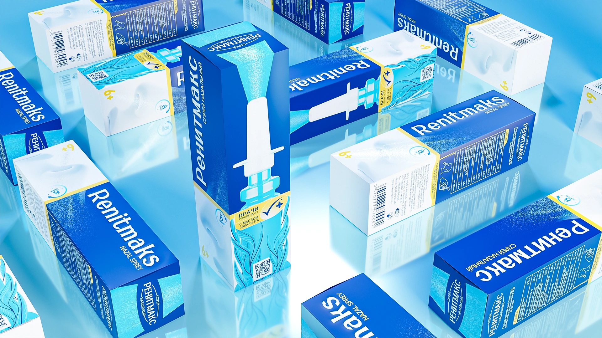 RenitMaks became a visual benchmark for clarity, purity, and contemporary pharmaceutical design Primary Color: Deep medical blue, symbolizing air, freshness, and respiratory ease. Visual Composition: Centered product image surrounded by eucalyptus leaves — a metaphor for natural relief and gentle action. Typography: Vertical and structured for easy readability on pharmacy shelves. Line Differentiation: The RenitMaks Kids range uses soft pink and blue tones, introducing warmth, care, and child-friendly associations. Design Philosophy: “Less, but clear” — minimal visual noise, maximum meaning.