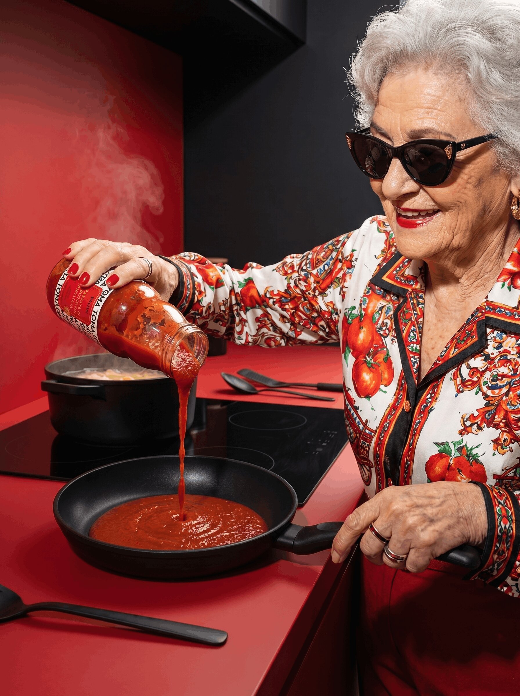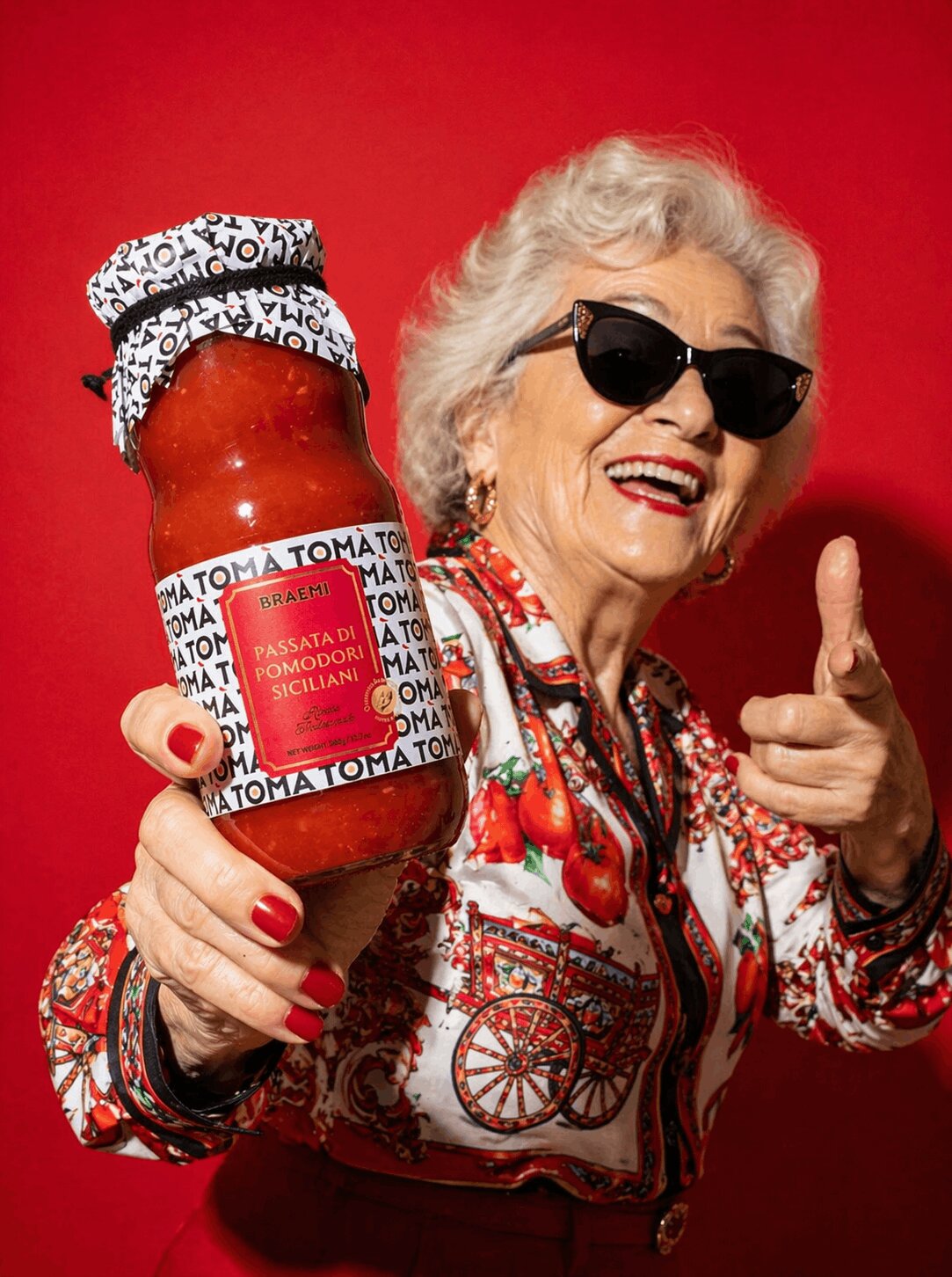 On the other, it informs the brand’s visual direction. The idea of “your mum” is reinterpreted through the figure of the grandmother transformed into a bold and unexpected character. Styled in a vibrant Sicilian shirt and portrayed with a confident, almost iconic attitude, she becomes a “pop grandmother”: a symbol of authenticity translated into a contemporary visual language.
