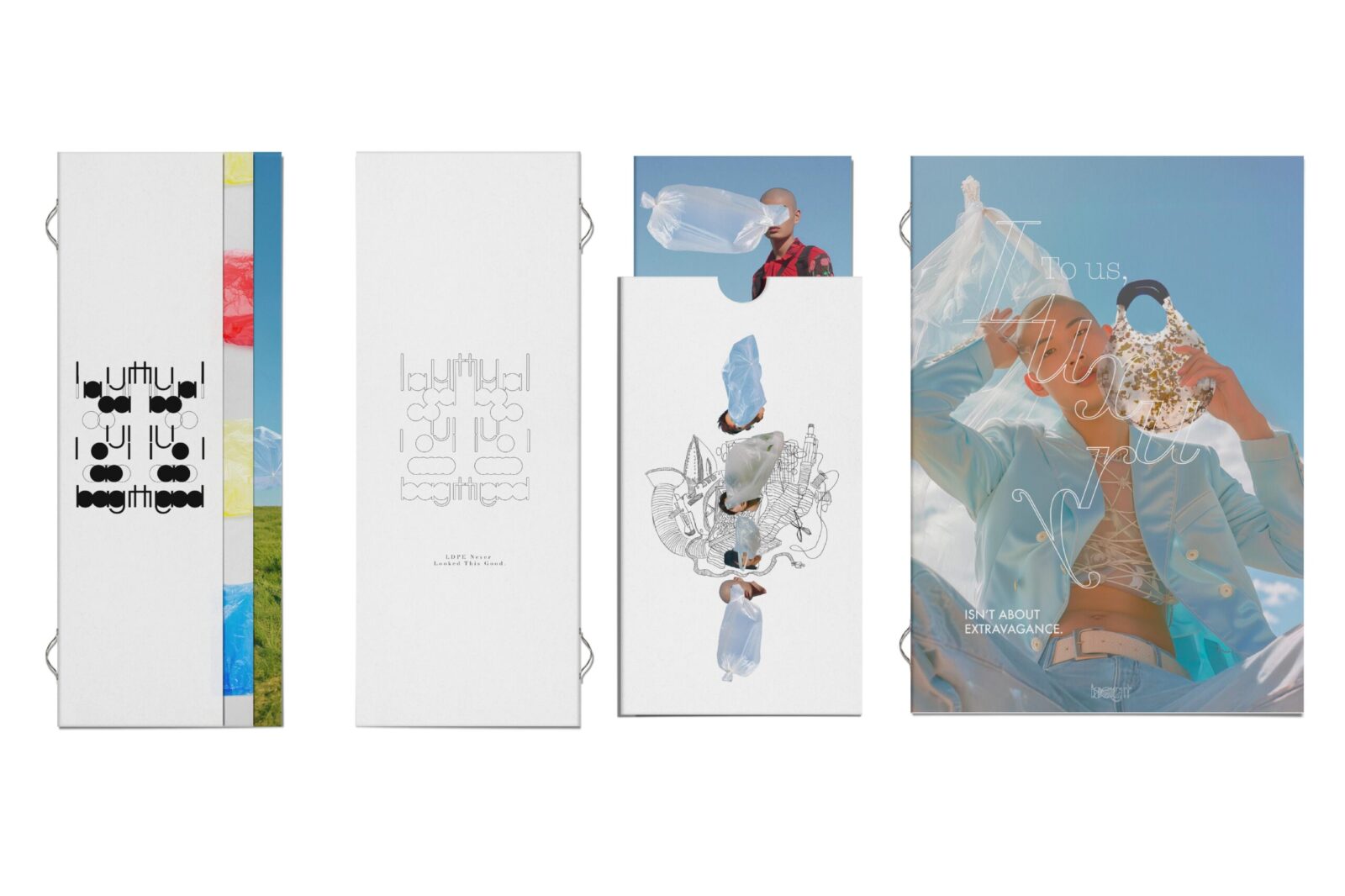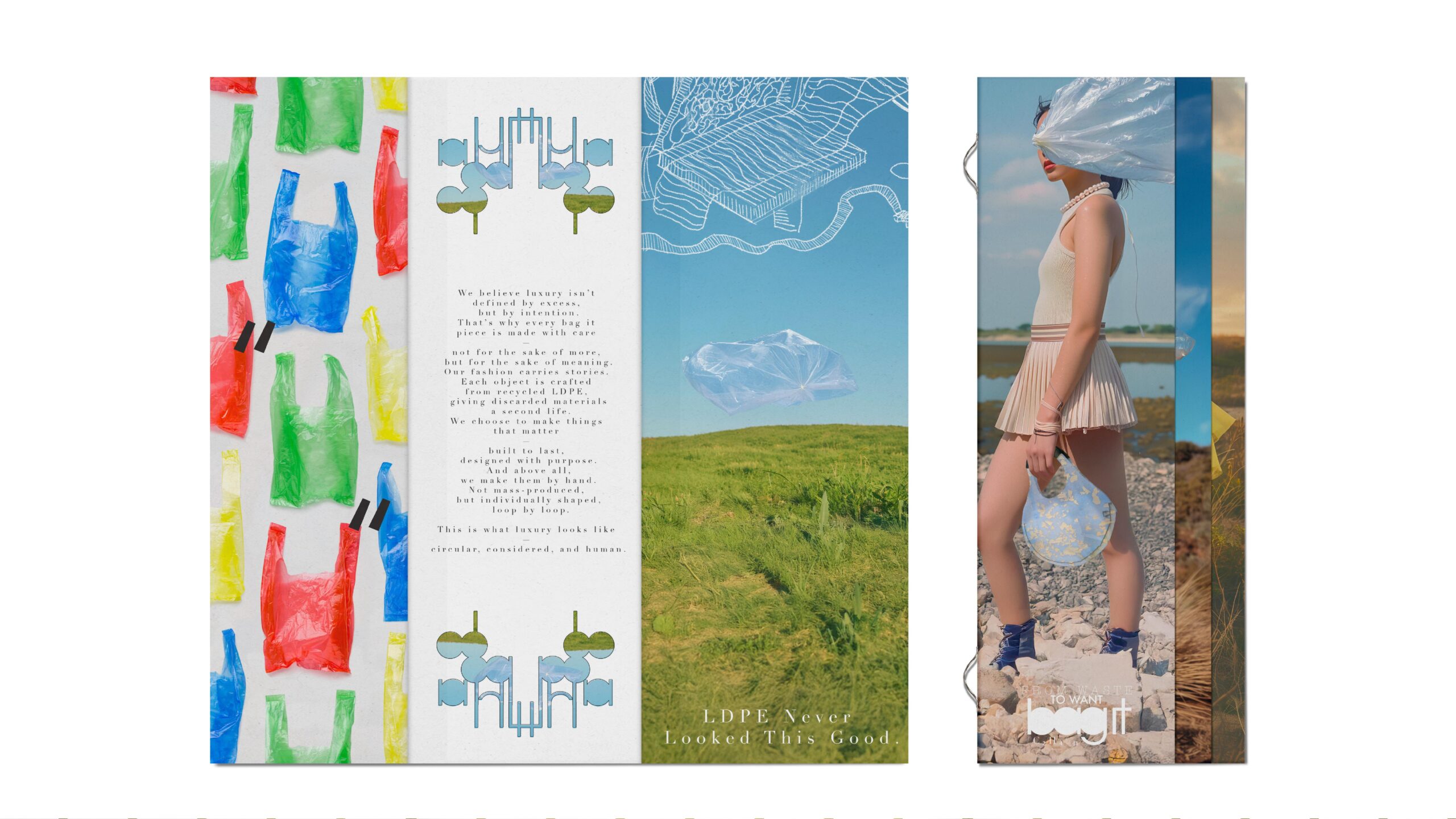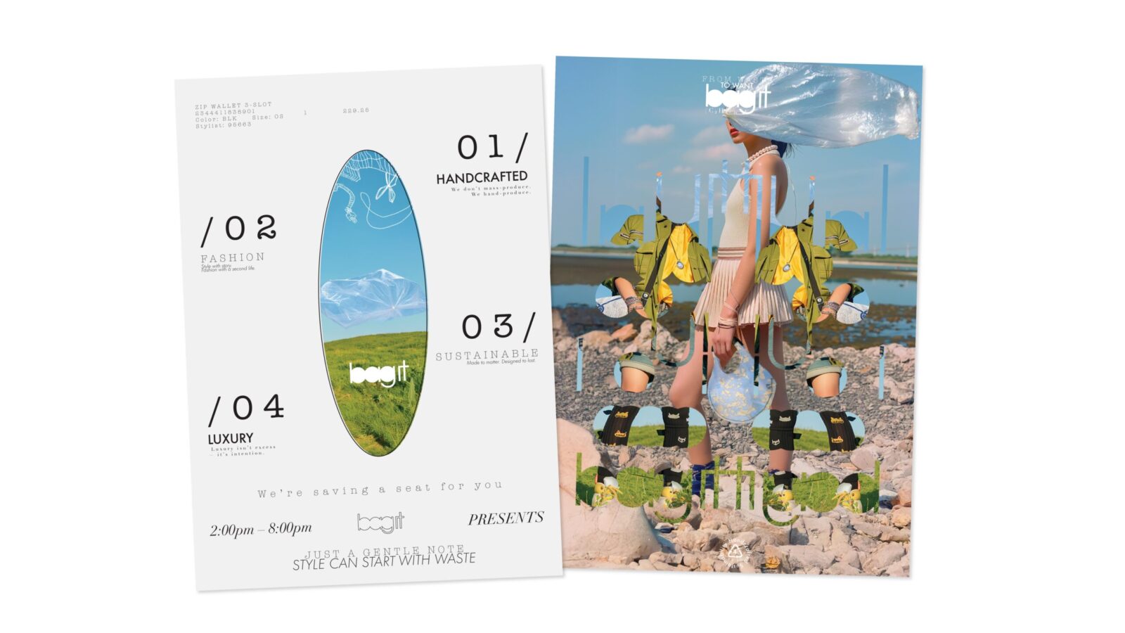 I led the branding direction for the project and titled it bag it. The name plays on the idea of both “owning” the bag and reclaiming the disposable plastic bag as something valuable. One of our primary goals was to shift the perception of these objects: instead of being seen as disposable, we wanted them to be cherished. Therefore, we deliberately framed the products as luxury goods. Because in our philosophy, sustainability doesn’t succeed on function alone — it must also evoke emotional attachment and aesthetic longevity. As we put it: sustainability fails when beauty is short-lived.