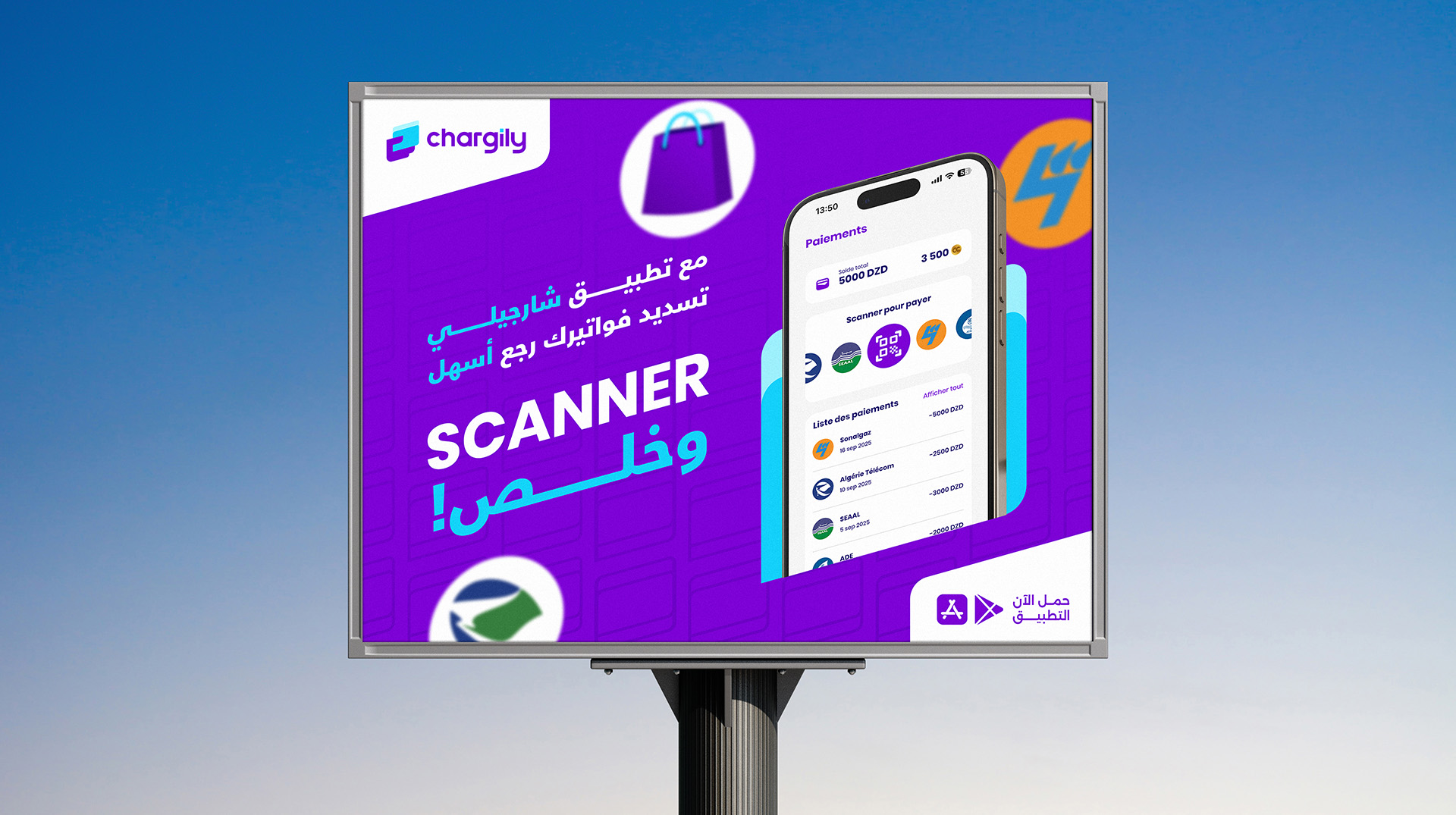 To bring this vision to life, I developed a complete visual ecosystem: a redesigned logo, a refined color palette, a clean and contemporary typographic system, and a set of dynamic patterns embodying movement and digital connectivity. These elements extend cohesively across all touchpoints, from marketing and advertising materials to digital interfaces, signage, and physical supports. The result is a transformed brand image that enhances user experience, strengthens trust, and positions Chargily as a forward-thinking fintech leader equipped to meet the demands of a rapidly evolving digital landscape.
