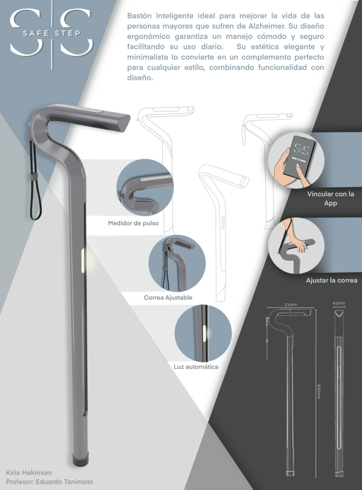 SafeStep is a smart cane specifically designed for older adults living with Alzheimer’s disease. This innovative device combines functionality, safety, and technology to provide users with greater autonomy while offering peace of mind to their families and caregivers.