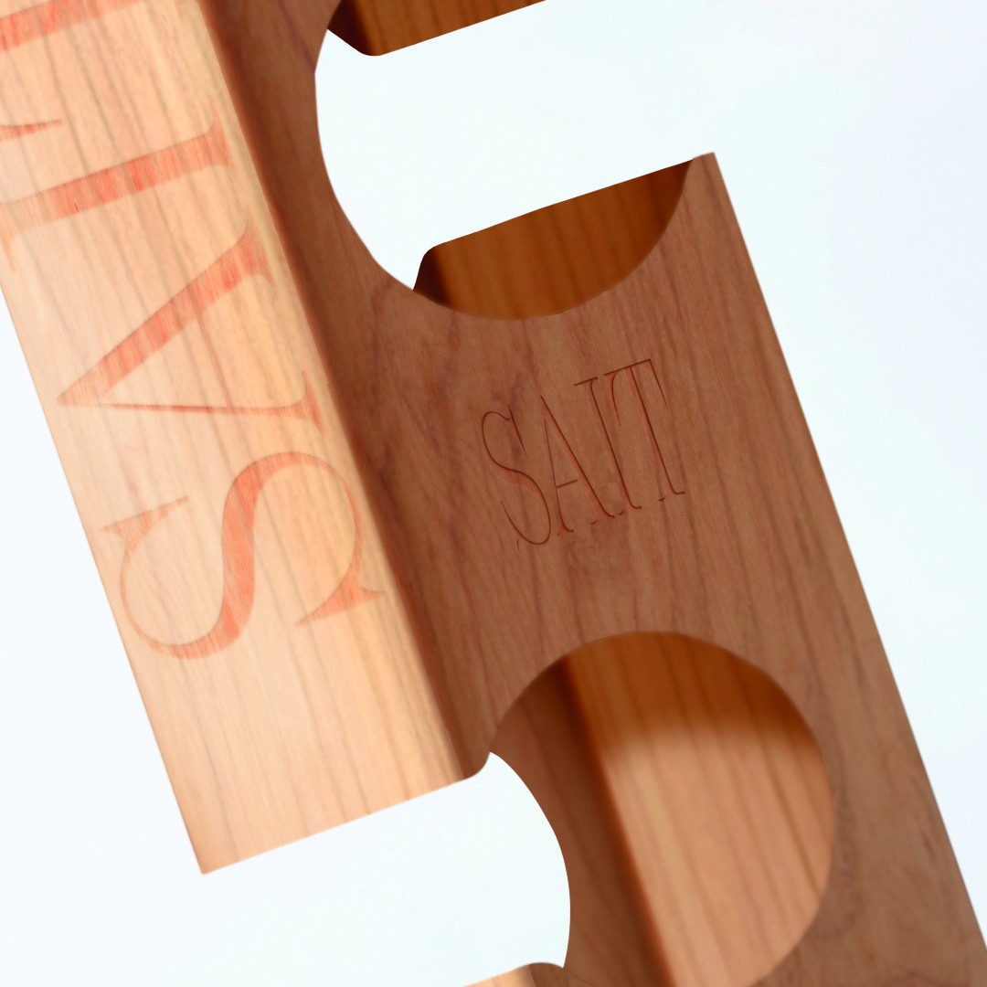 The case is simple but iconic and complies with circular economy criteria. It is made of recycled pine wood, which which allows for durability, so once it reaches the home, it becomes a bottle rack, giving it a second life.