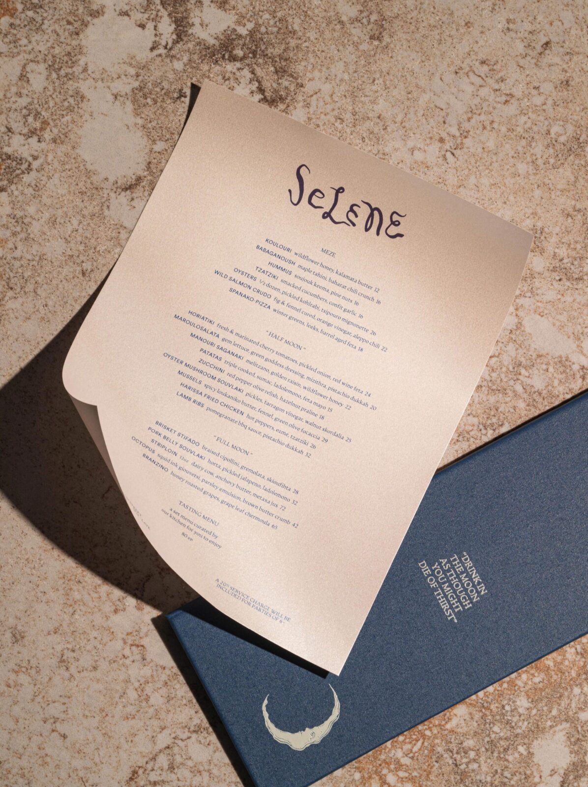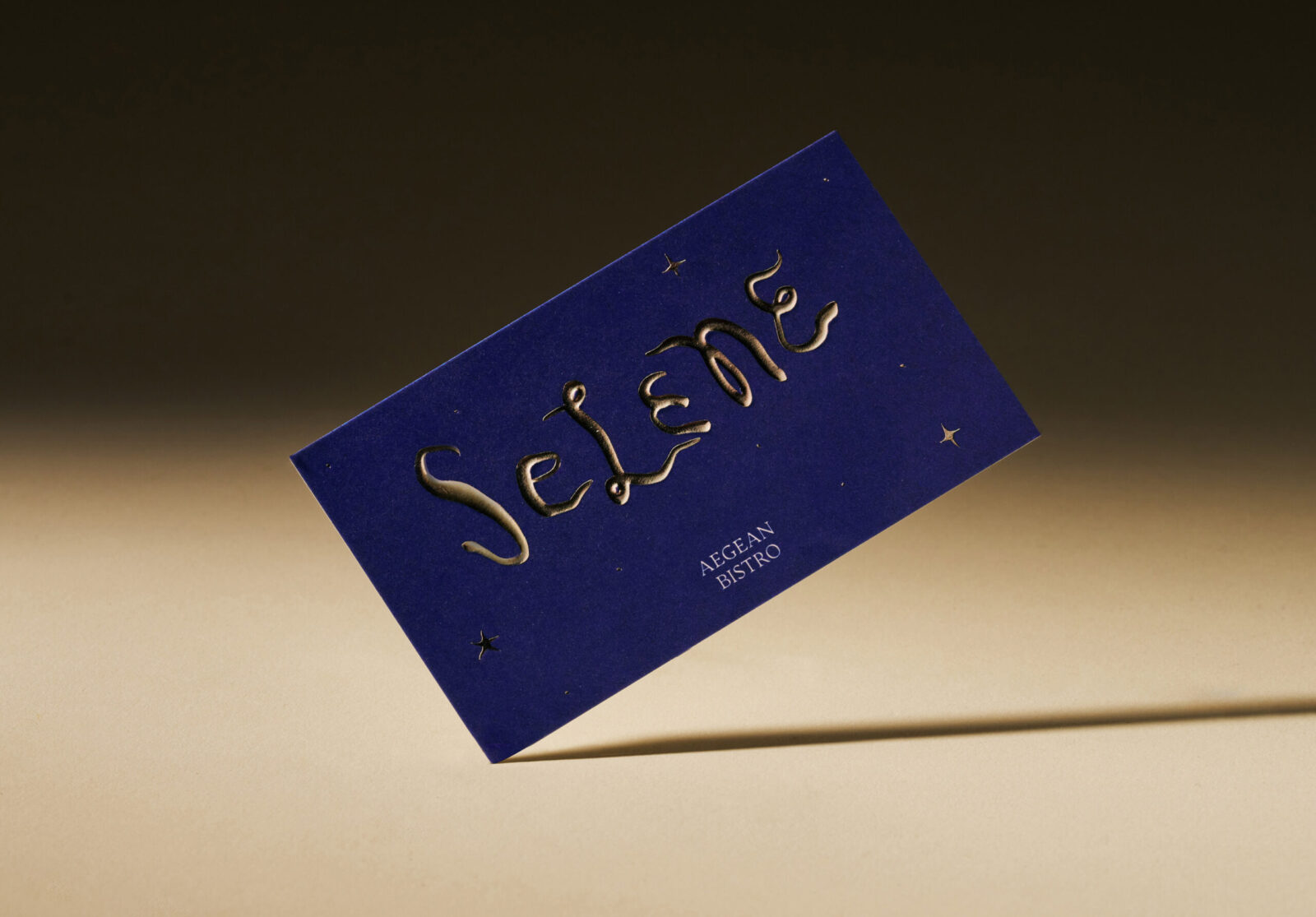 The colour palette is drawn from moonlight and the deep sea — not the bright blues of the Aegean, but richer, more luxurious tones. Deep navy anchors the identity, paired with pearlescent textures that shimmer like shells under shifting light. Silver accents catch and reflect the glow, adding a sense of depth and refinement. Embossed details and layered textures give menus, coasters, and printed materials a tactile quality, ensuring the brand feels as considered to the touch as it looks to the eye. The result is a visual and material language that feels atmospheric, elegant, and unmistakably Selene.