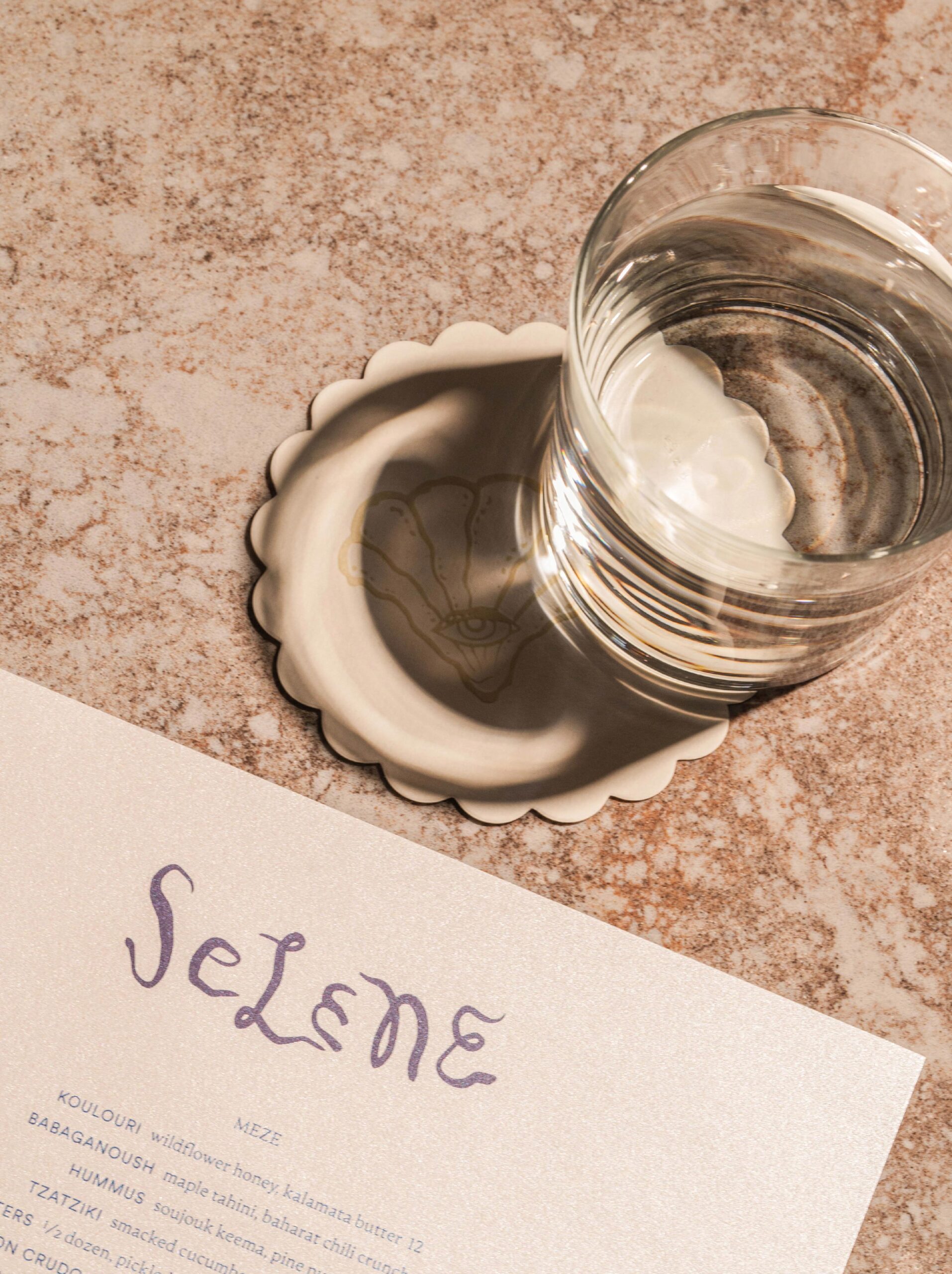 Coasters, edged in soft scallops, carry illustrations of eyes, pearls, and shells. Referencing the evil eye and the sea’s watchful presence, they add another layer of symbolic meaning. These motifs appear across the restaurant, subtle but deliberate, reinforcing the brand language. Matchbooks, cut in the shape of the moon, reveal the night sky. When lit, each flame sparks like a star — a small but intentional cue that adds to the layered narrative.