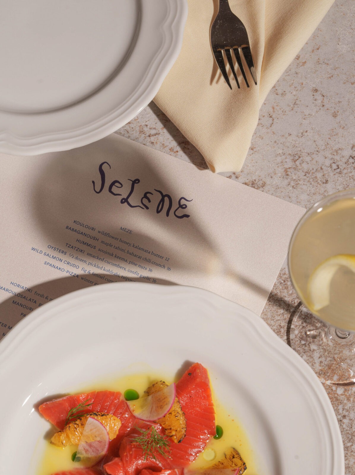 The restaurant’s handwritten logotype, inspired by the brushwork of Greek artist Alekos Fassianos, is central to the brand identity. Its wave-like lines extend into physical touchpoints: silver napkin rings carry the mark, catching light like jewellery and turning a logo into a tactile, almost personal object. Small details like these are constantly photographed, collected, and even pocketed by guests — part of the charm of Selene’s experience.