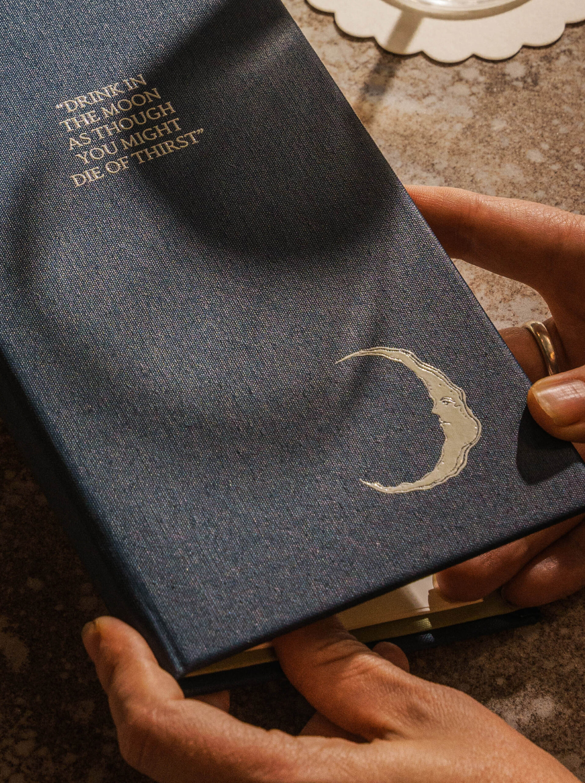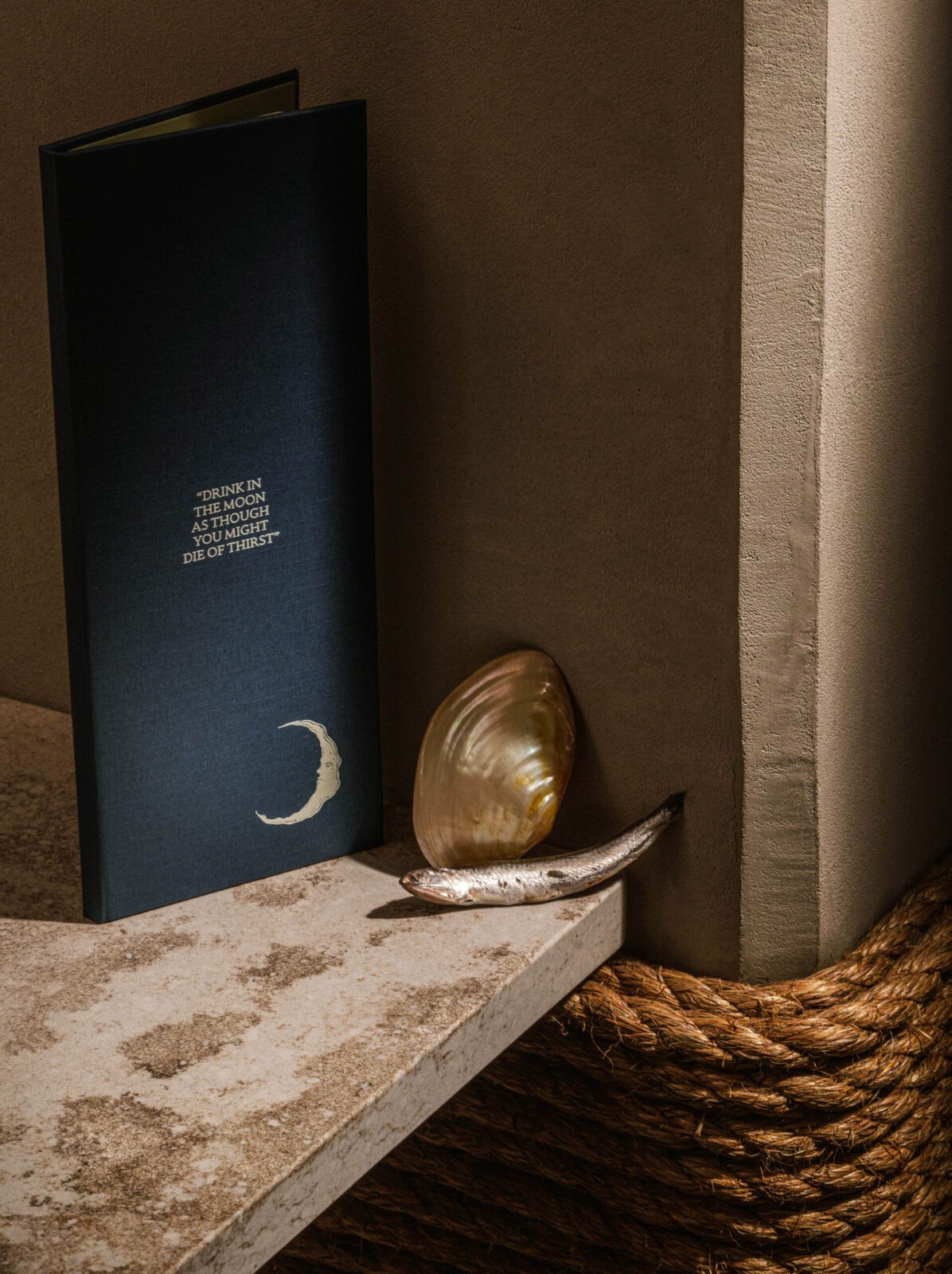 Menus are printed in midnight blue, with pearlescent paper revealed inside, shimmering like shells under light. They open with the line Drink the moon as though you might die of thirst — an invitation that sets the mood before a dish arrives. The combination of deep colour and subtle shimmer reinforces the brand’s themes of sea, tide, and lunar pull.