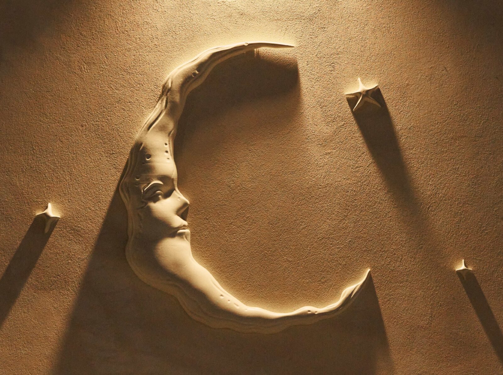A large moon sculpture marks the building, a surreal yet understated emblem. Its scale and permanence suggest something both ancient and modern, setting the tone for what’s inside: a restaurant that operates with its own rhythm, anchored by myth but expressed through design. To the left of the door, an illuminated pearl serves as another beacon, nodding to the world of the sea and its sense of quiet magic.