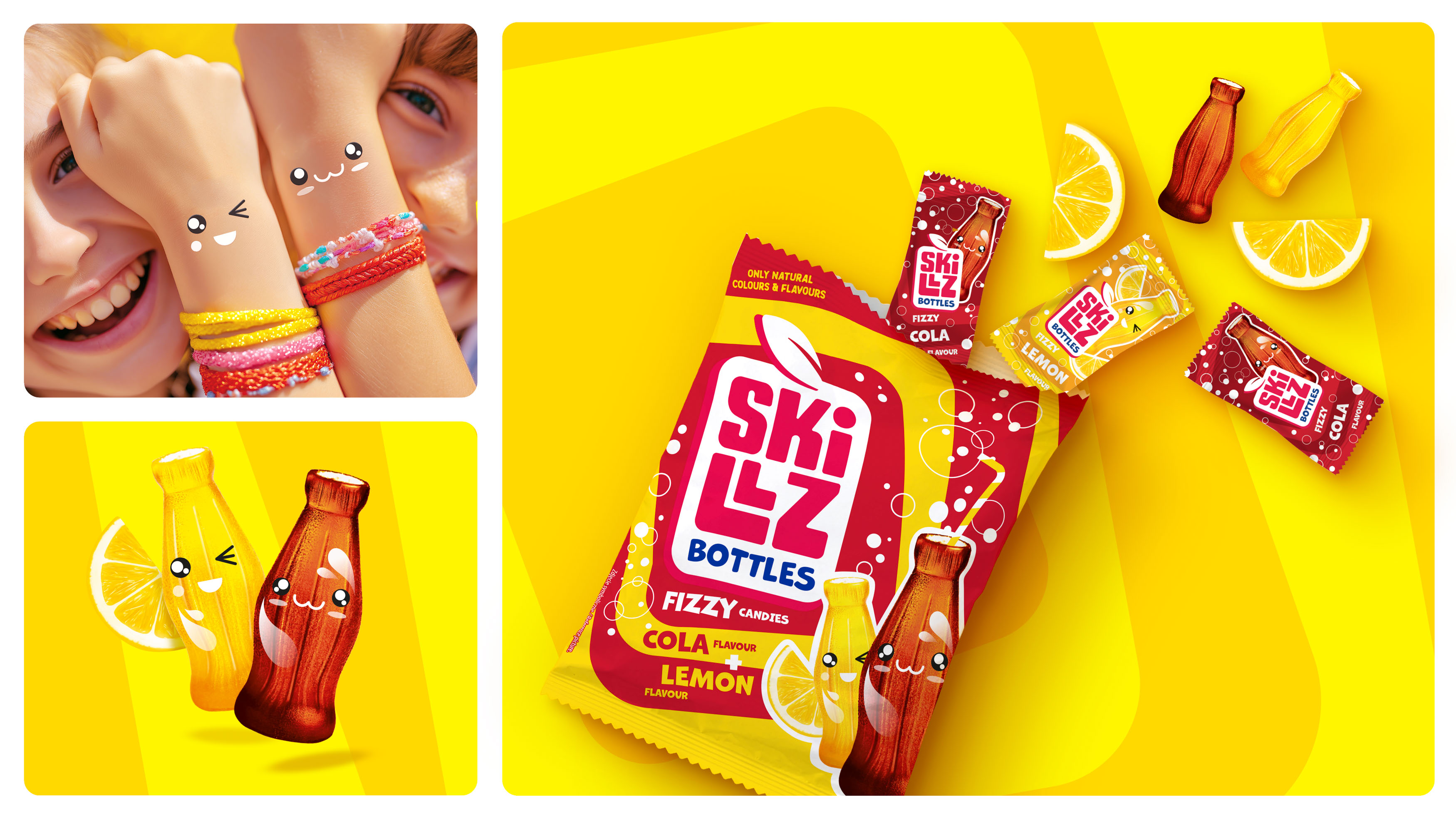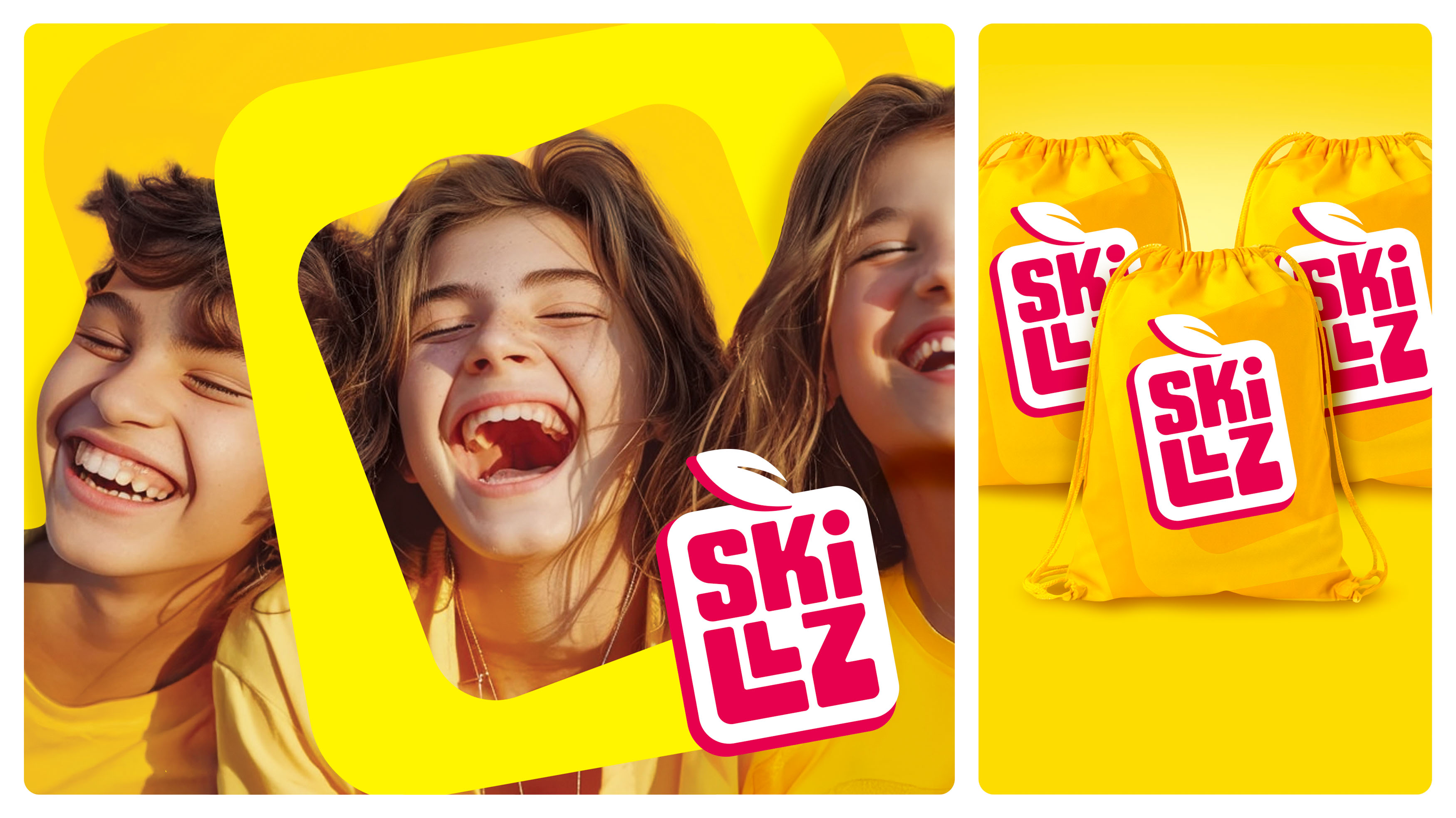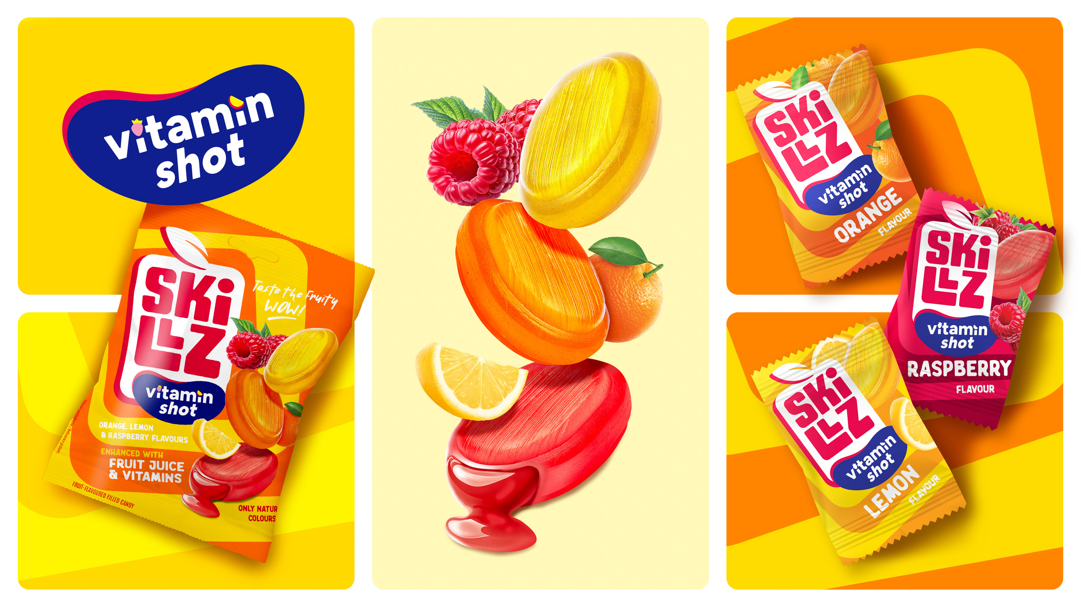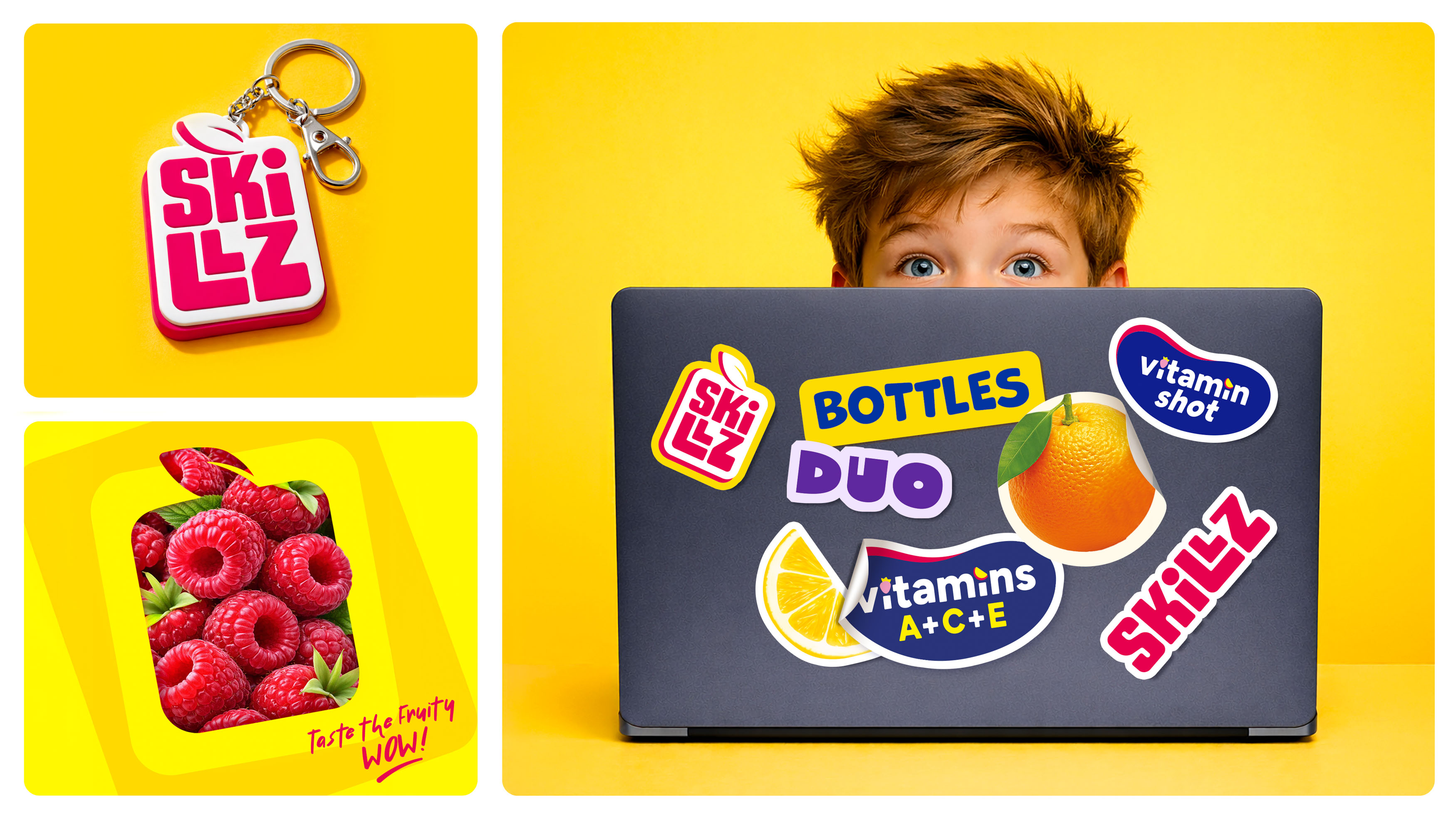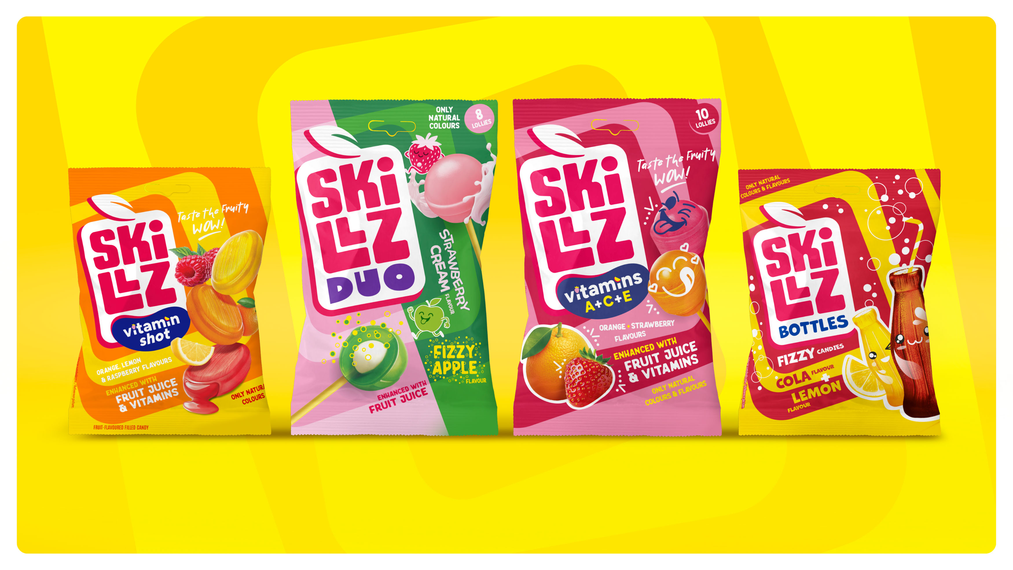 We designed SKILLZ as a strong umbrella brand that organizes the entire portfolio while enabling future growth. The visual identity is centered around a distinctive, geometric fruit-inspired logo that is bold, recognizable and expressive. Its structured form conveys strength and consistency, while handcrafted typography adds energy and a playful character. A vibrant yellow was introduced as a key strategic asset, enhancing visibility and reinforcing the red-and-white wordmark. Dynamic colours and patterns derived from the logo translate the intensity of fruit flavours into a unique visual language.