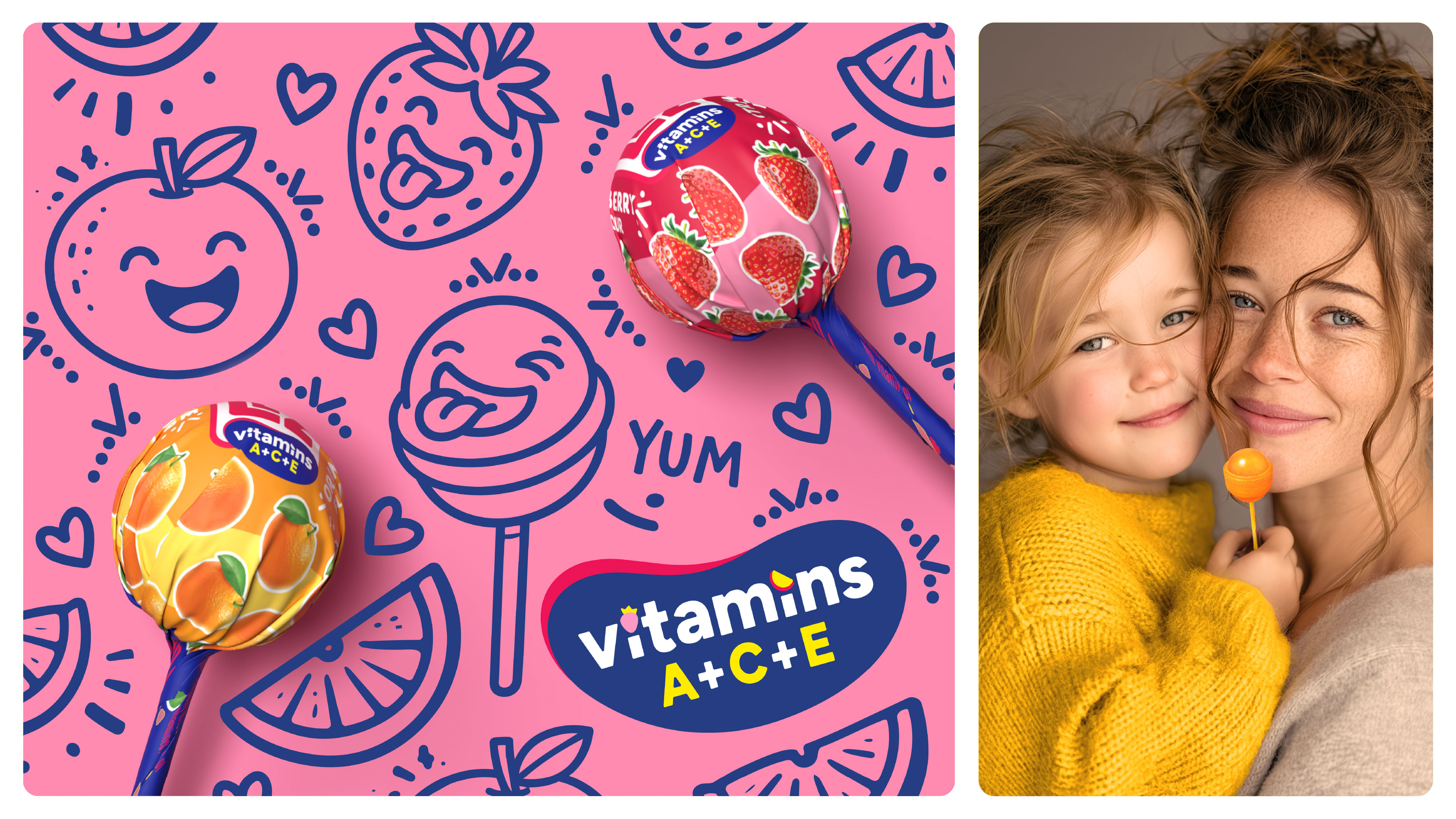 Beyond identity, the project included the creation of a clear portfolio architecture and sub-brand system. Product lines such as DUO, Bottles, Vitamin Shots and vitamin-enriched variants (A+C+E) were designed to be intuitive, scalable and easy to navigate. The first range combines classic sugar-based sweets with added vitamins and real fruit juices, offering a balance between indulgence and emerging consumer demand for more conscious choices.