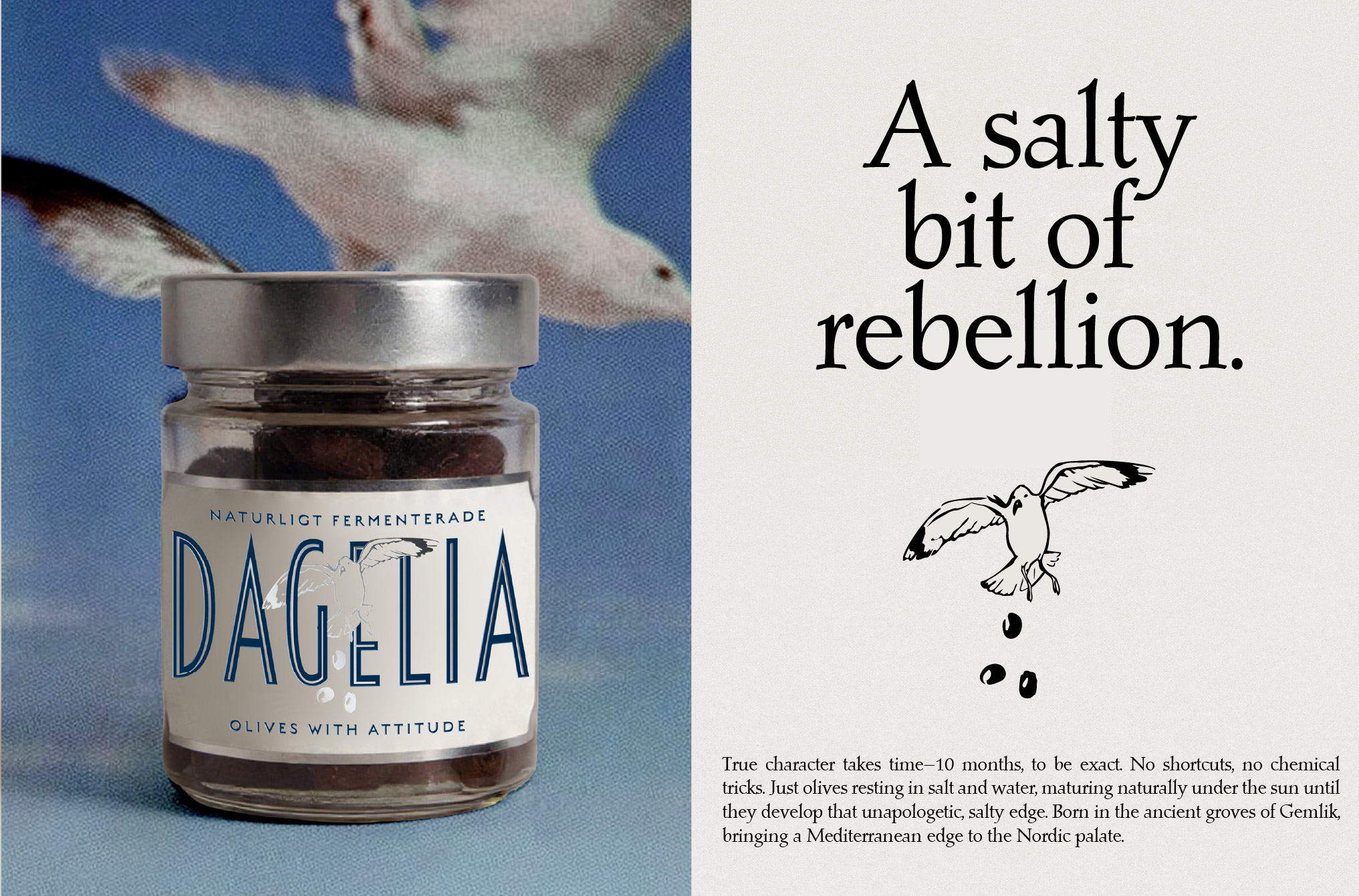 Every touchpoint is designed to hold this duality: Mediterranean richness expressed through Nordic restraint; humor embedded within elegance; tradition reframed through contemporary minimalism. The result is a brand that does not try to fit in, but instead redefines its surroundings through presence alone. It feels timeless in its simplicity, yet quietly rebellious in its refusal to conform, positioning the Gemlik olive not just as a product on a shelf, but as a small cultural disruption wrapped in design clarity.