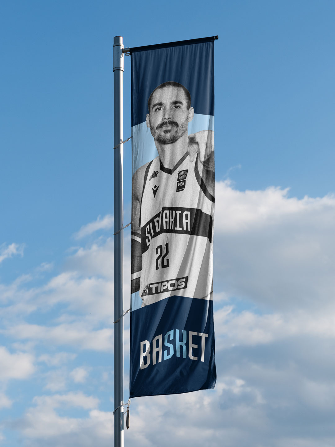 “We supported the visual with an upward arrow. In combination with the letters SK in the word basket, it points to Slovakia. This is in line with the main idea of aiming high. In terms of design, we wanted to work with the colour blue, as it keeps appearing in Slovak basketball throughout time, but also in other sports such as football and hockey. We wanted to give the design energy, a modern urban street character and a visual language that would give the players, but also the whole of Slovak basketball, confidence,” explained Matej Špánik.