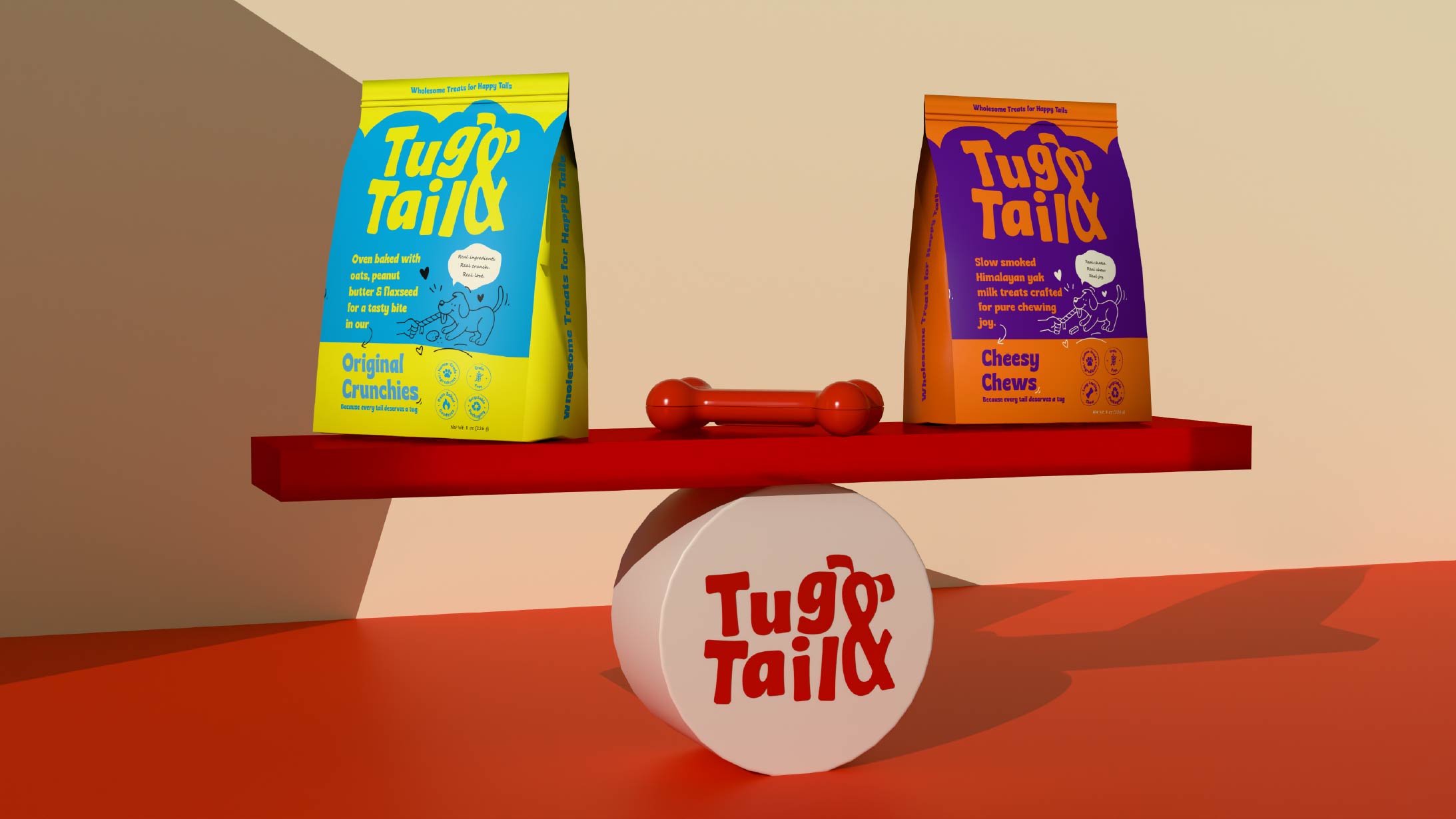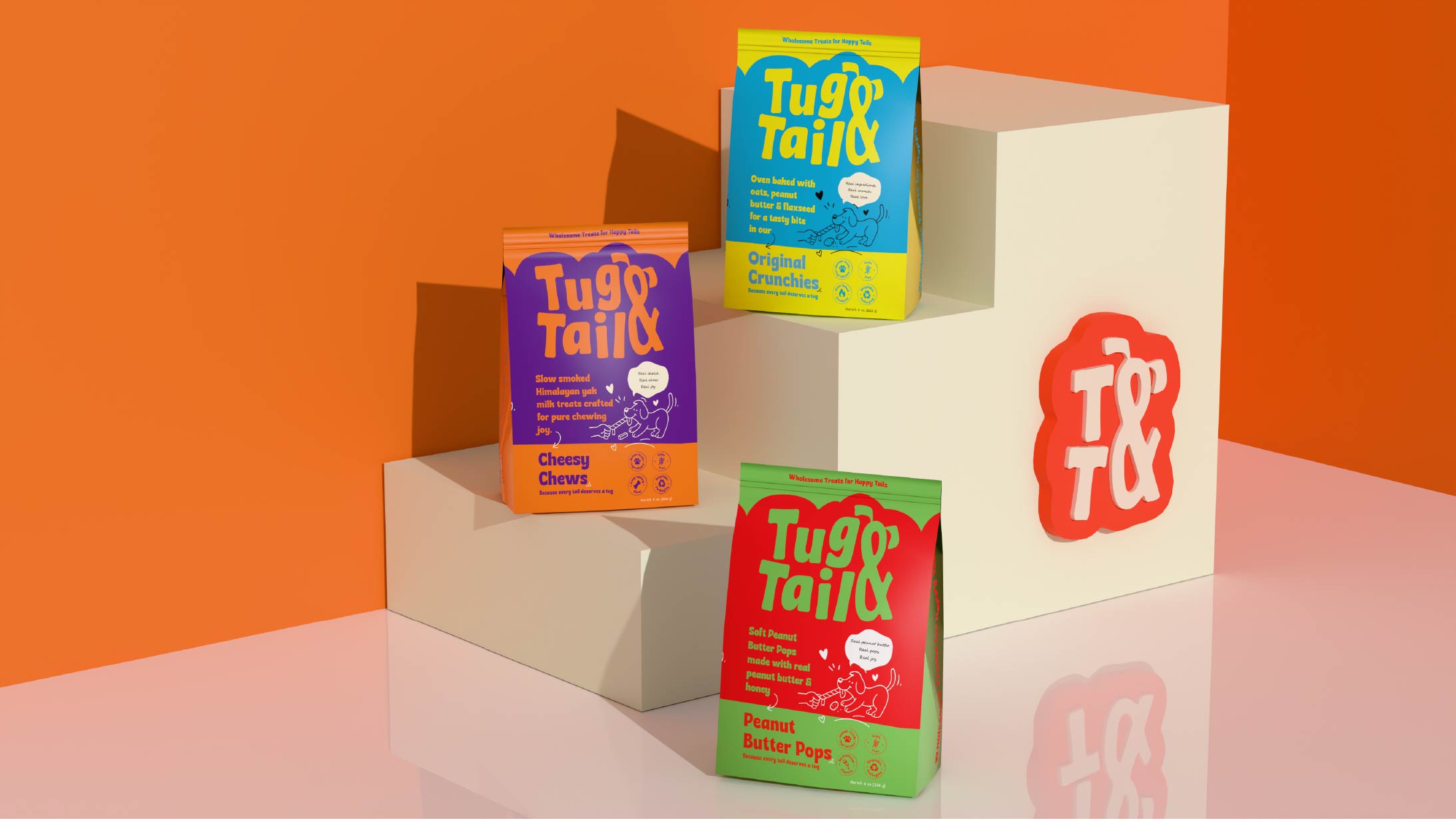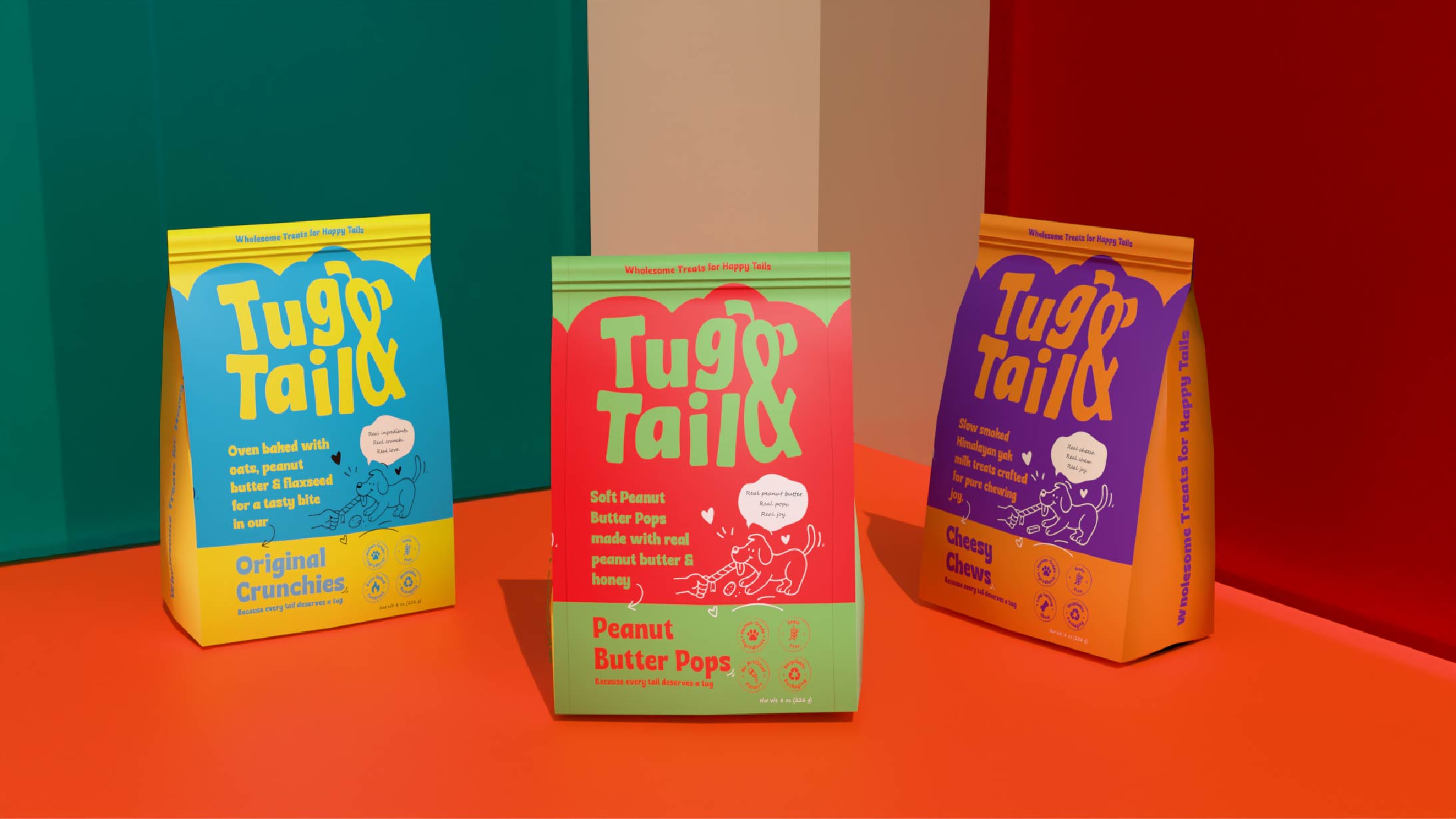 Every touchpoint — from strategy to identity to packaging — was intentionally designed to reflect Tug & Tail’s commitment to nutritious, trustworthy, and tail-waggingly good products for dogs. The result is a bold, lively, and emotionally engaging visual world that celebrates the happiness dogs bring into our lives and positions Tug & Tail as a brand pet parents can confidently choose, again and again.