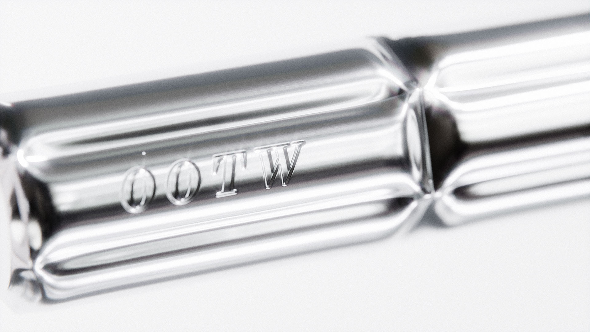 The sculptural aluminium casing features an inflated silhouette inspired by pressurised space equipment. At the same time, it quietly echoes the product’s own promise: a plumping effect. The form reflects the function.