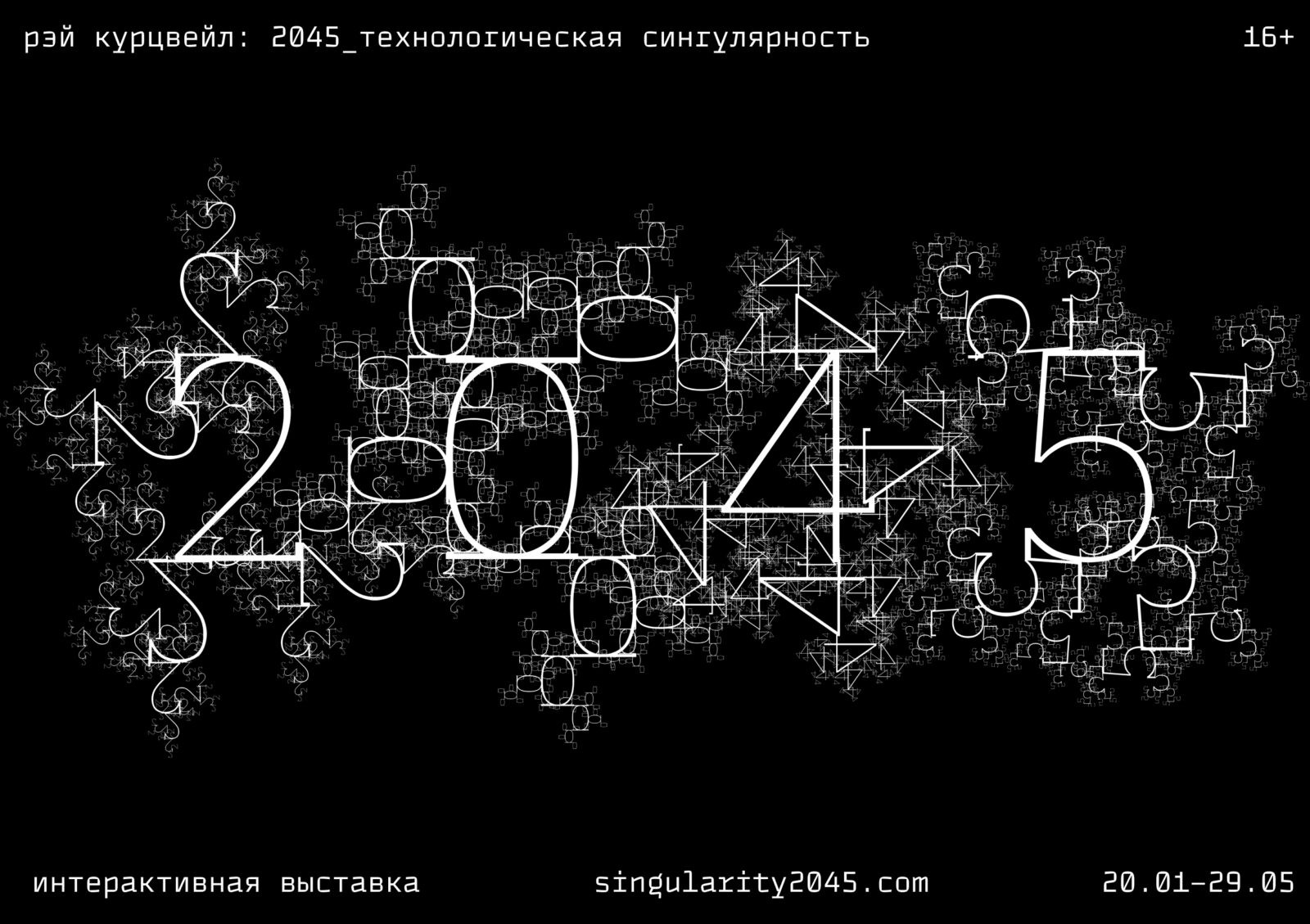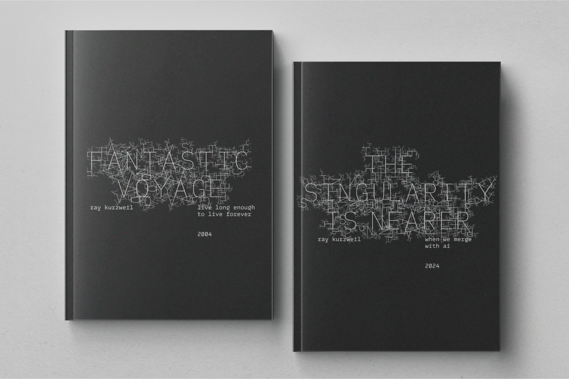 The key visual solution is a custom fractal typeface, algorithmically generated using a Processing script. The recursive, self‑similar structure of the font is designed to evoke Kurzweil’s “law of accelerating returns”—the idea that technological evolution follows an exponential trajectory, with each generation of technology building upon and accelerating the previous one. The fractal typographic aesthetic echoes the concept of a singularity as both infinitely complex and infinitely scalable. Each glyph replicates a smaller version of itself, visually implying endless recursive growth—a metaphor for how AGI could begin redesigning and rewriting its own intelligence in recursive loops.