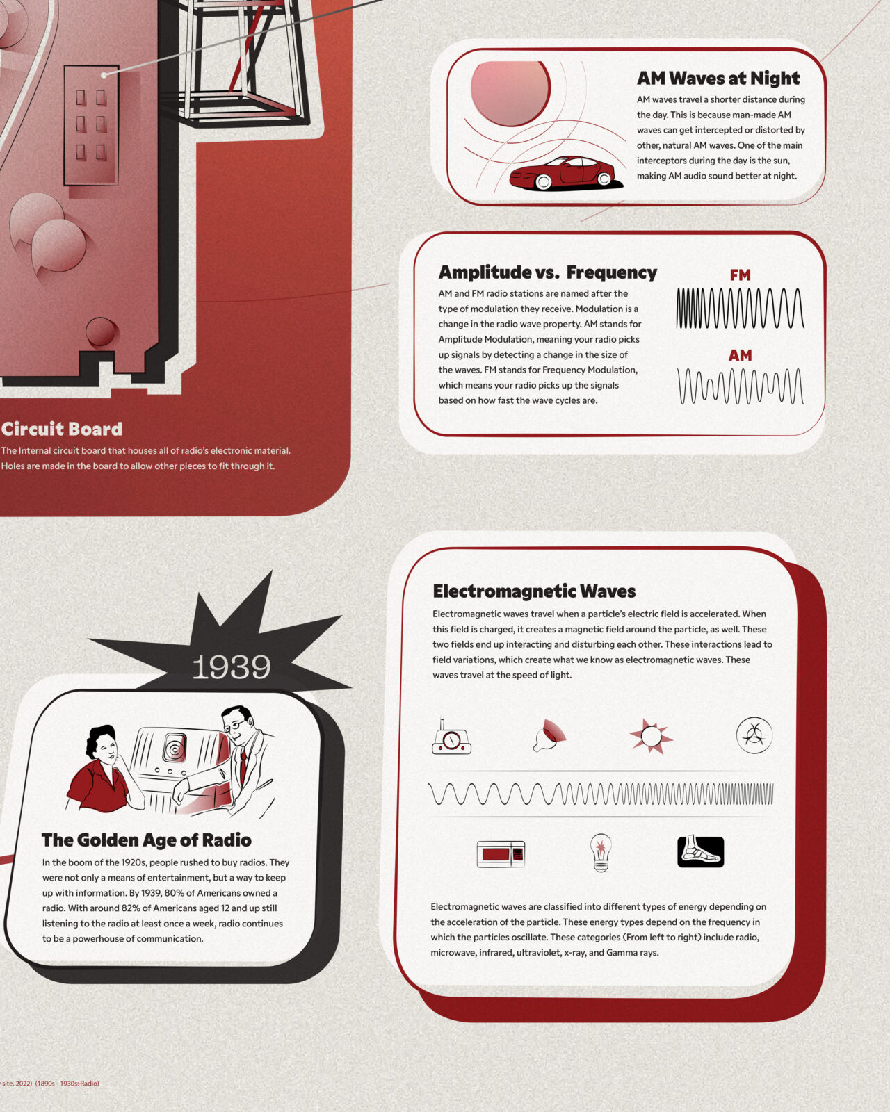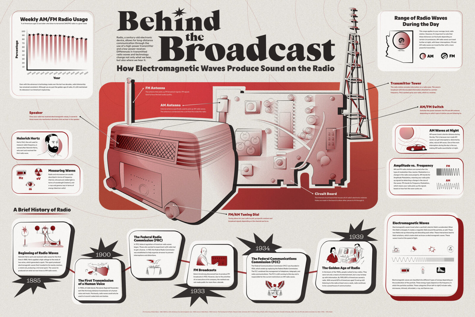 Radio, a century-old electronic device, allows for long-distance communication through the use of a high-power transmitter and a low-power receiver. Differences in transmitted radio waves and technology change not only what we hear, but also where we hear it. Alexis’s work examines how electromagnetic waves work by condensing large, complex data sets into a viewer-friendly information graphic that unfolds like a visual story. The purpose is to make an extensive body of data into a visual system that is easy to navigate for any reader/viewer. The final intent of this project is a printed poster that educates the viewer while holding their attention.