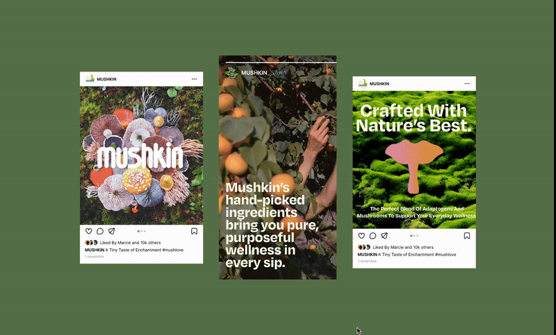 The naming, Mushkin, hints at both the adaptogenic roots—drawing softly from the world of mushrooms and botanicals—and the brand’s playful charm. The word feels friendly which becomes part of the drink’s identity. Each flavor is represented not by flashy illustrations or cluttered graphics, but by minimal, symbolic marks: simple shapes, subtle textures, and a single bold accent color that communicates its mood and taste profile. This approach keeps the packaging clean and modern while still allowing each can to feel alive, expressive, and memorable.