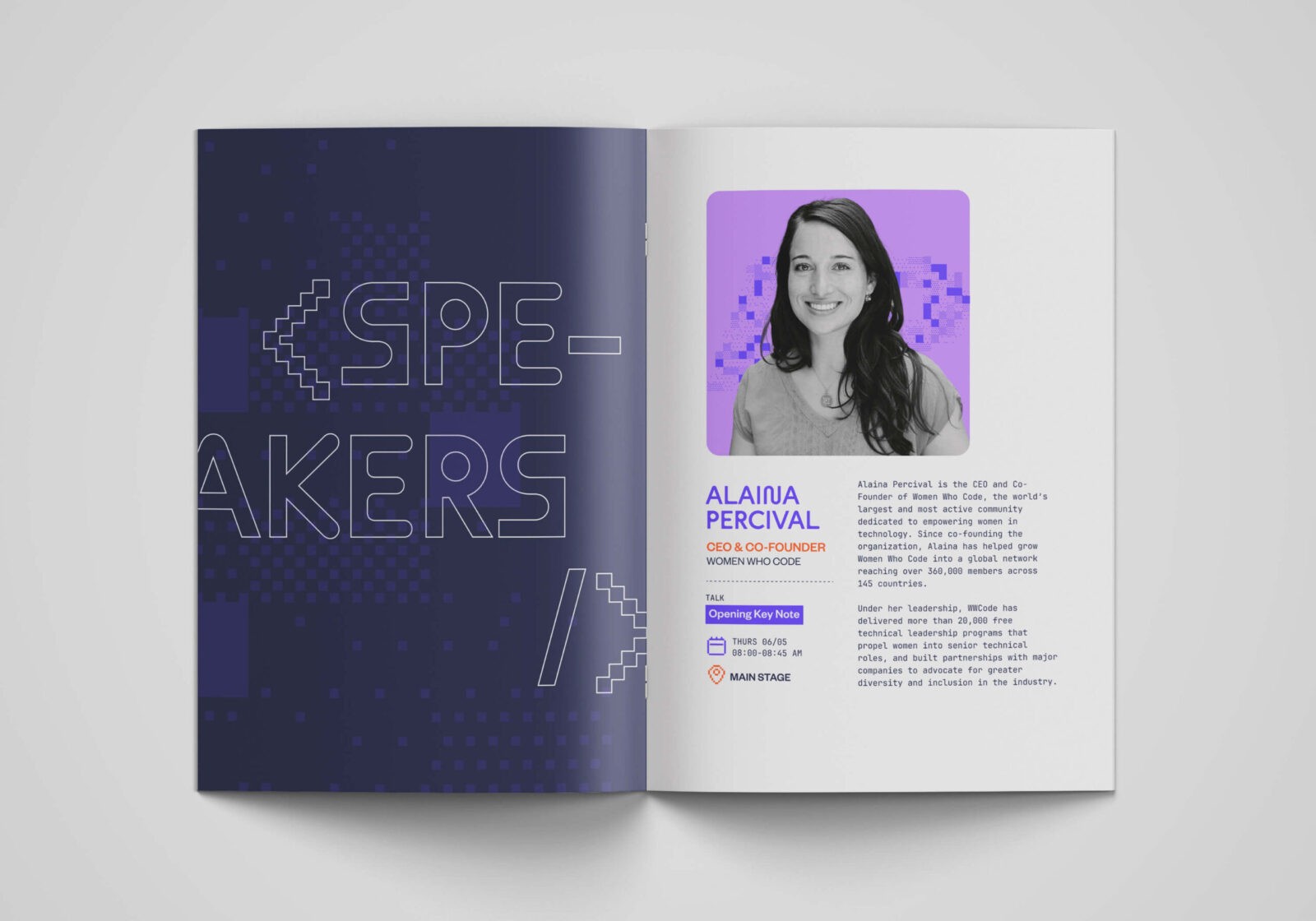 Color selection played an essential role in achieving this tone. Bold purples and oranges were chosen to convey strength, energy, and ambition, while a softer lavender was introduced to balance intensity with approachability. The palette communicates empowerment without relying on expected “tech neutrals,” giving the conference a modern, welcoming, and inclusive feel.