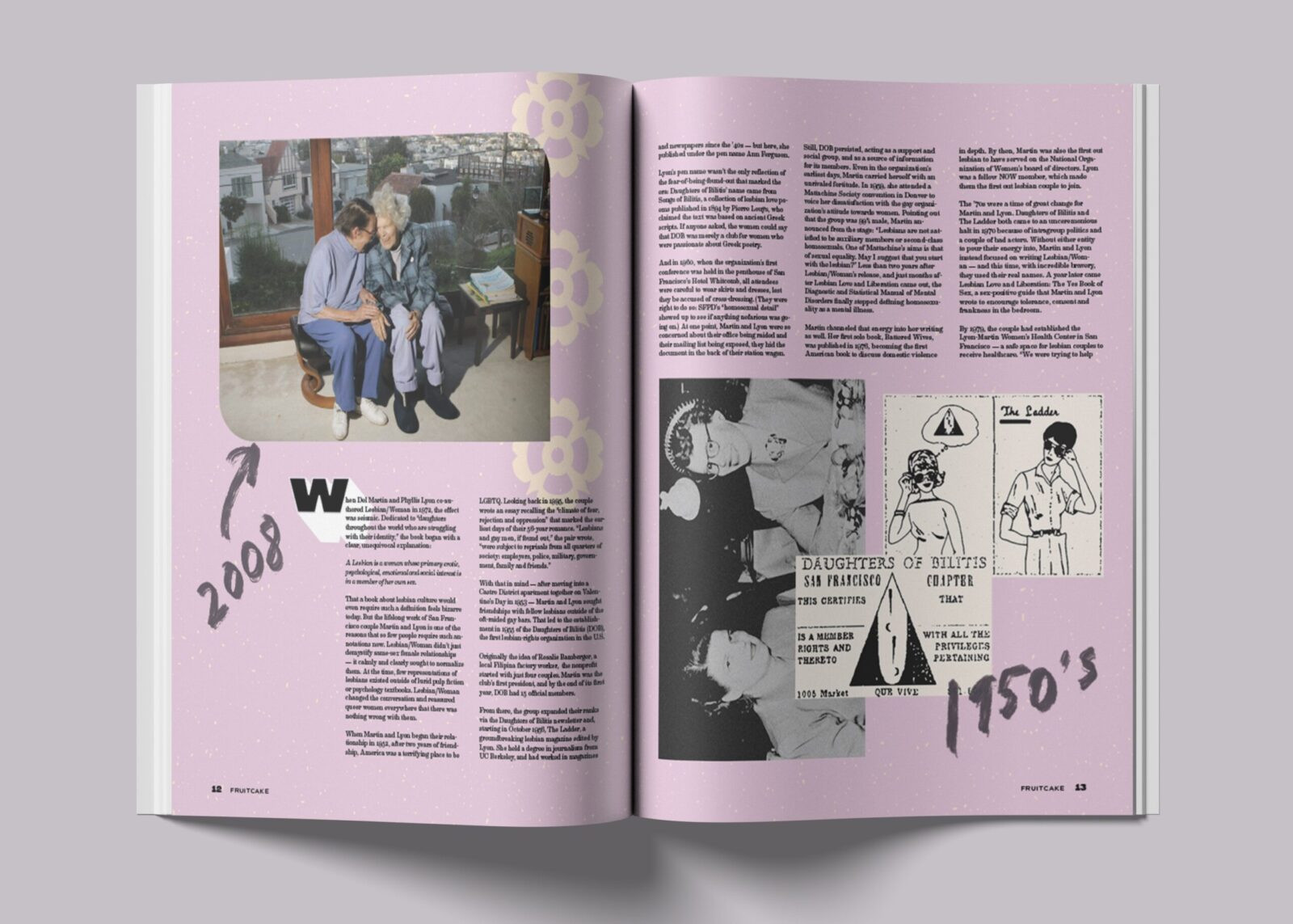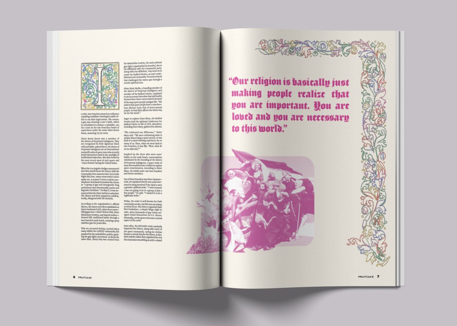 At its core, Fruitcake is more than a magazine. It is a gathering, a time capsule, a quiet act of resistance. It honors lives that might otherwise be forgotten. It invites readers to connect to a lineage of queer experience, to recognize themselves in the stories, and to feel seen as part of a continuum. For me, as a designer and as someone who values visibility, identity, and care, Fruitcake was an opportunity to use design as a vessel for empathy, history, and collective remembering.