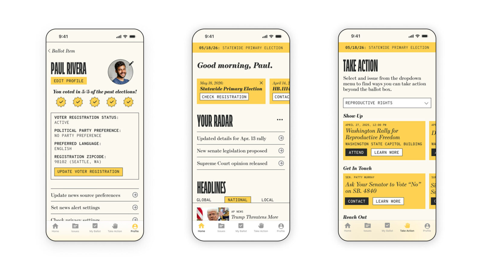 In the final design, bold condensed headings and an italic serif for body text work together to create a sense of credibility and weight. A clean, uncluttered dashboard gives users immediate access to what they need, including voting guides, relevant news, and practical steps they can take. The overall feel is functional, steady, and trustworthy. Beacon becomes more than a utility. It is a tool for reclaiming civic agency and a quiet companion inside a very loud political landscape.