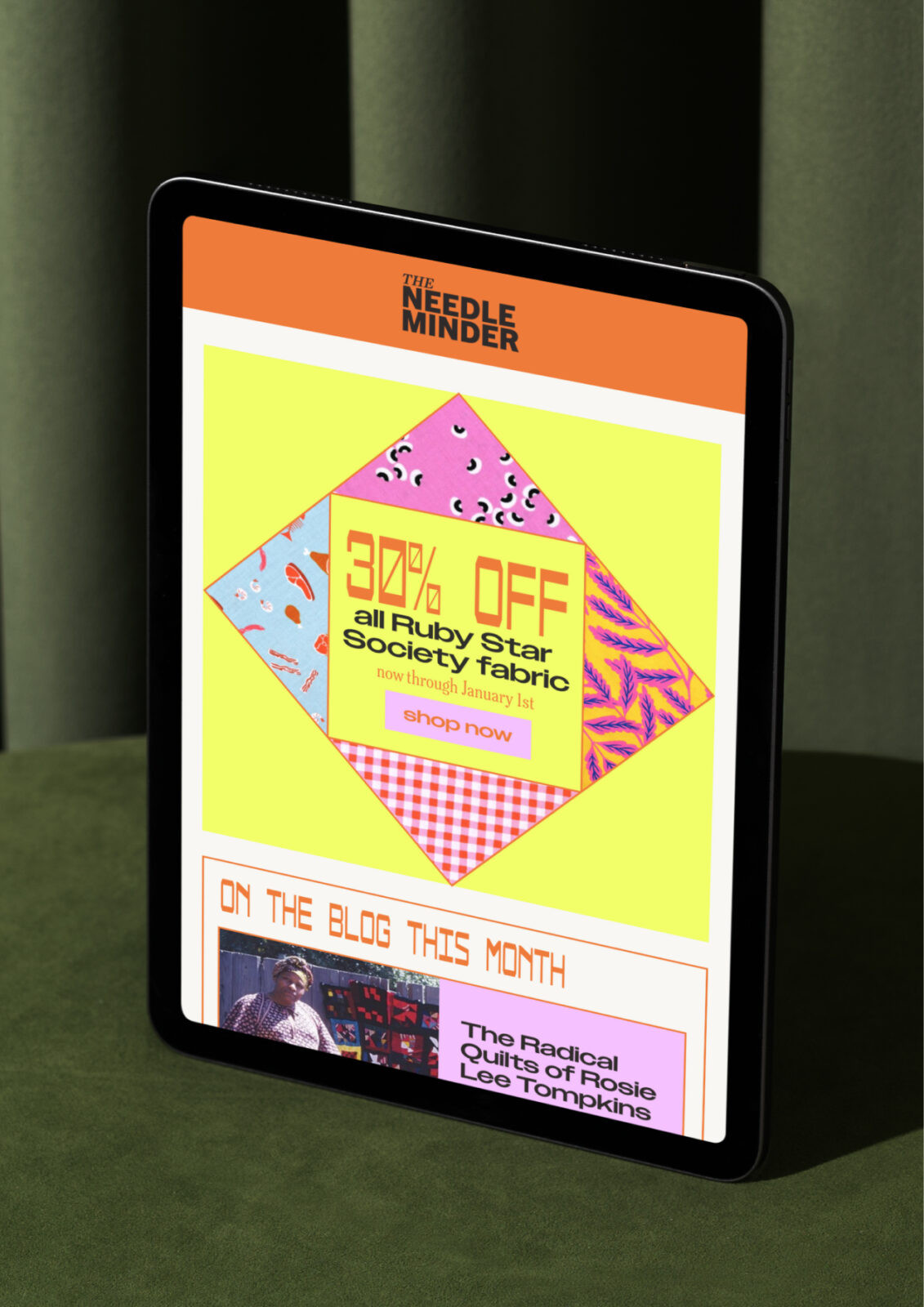 The site design uses repetition, texture, and pattern to mimic the feeling of assembling a quilt. The homepage becomes a patchwork of imagery and typography. Every section is treated as a tile within a larger composition, which creates a sense of movement and discovery as the user scrolls. Photography reinforces the tension between handmade objects and digital styling. Tools and materials are presented in bright, expressive scenes that position them as creative instruments rather than simple supplies.
