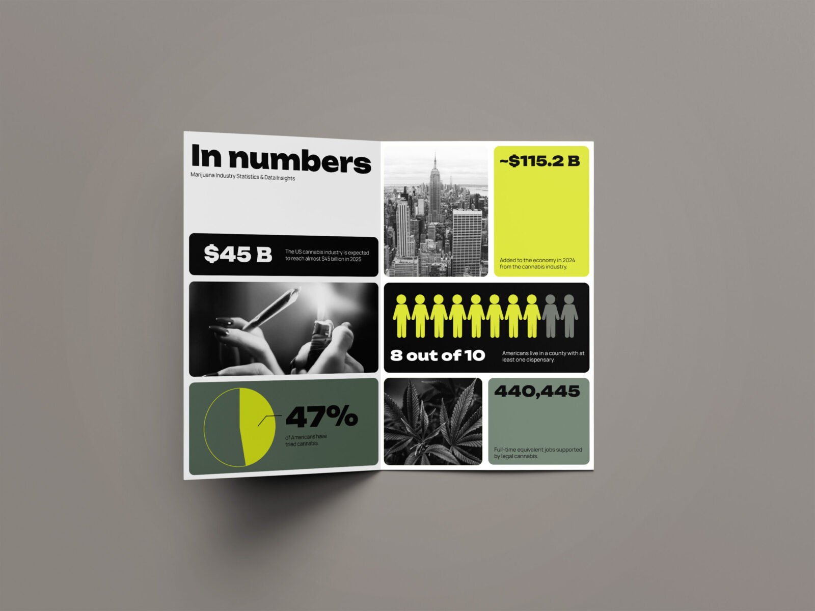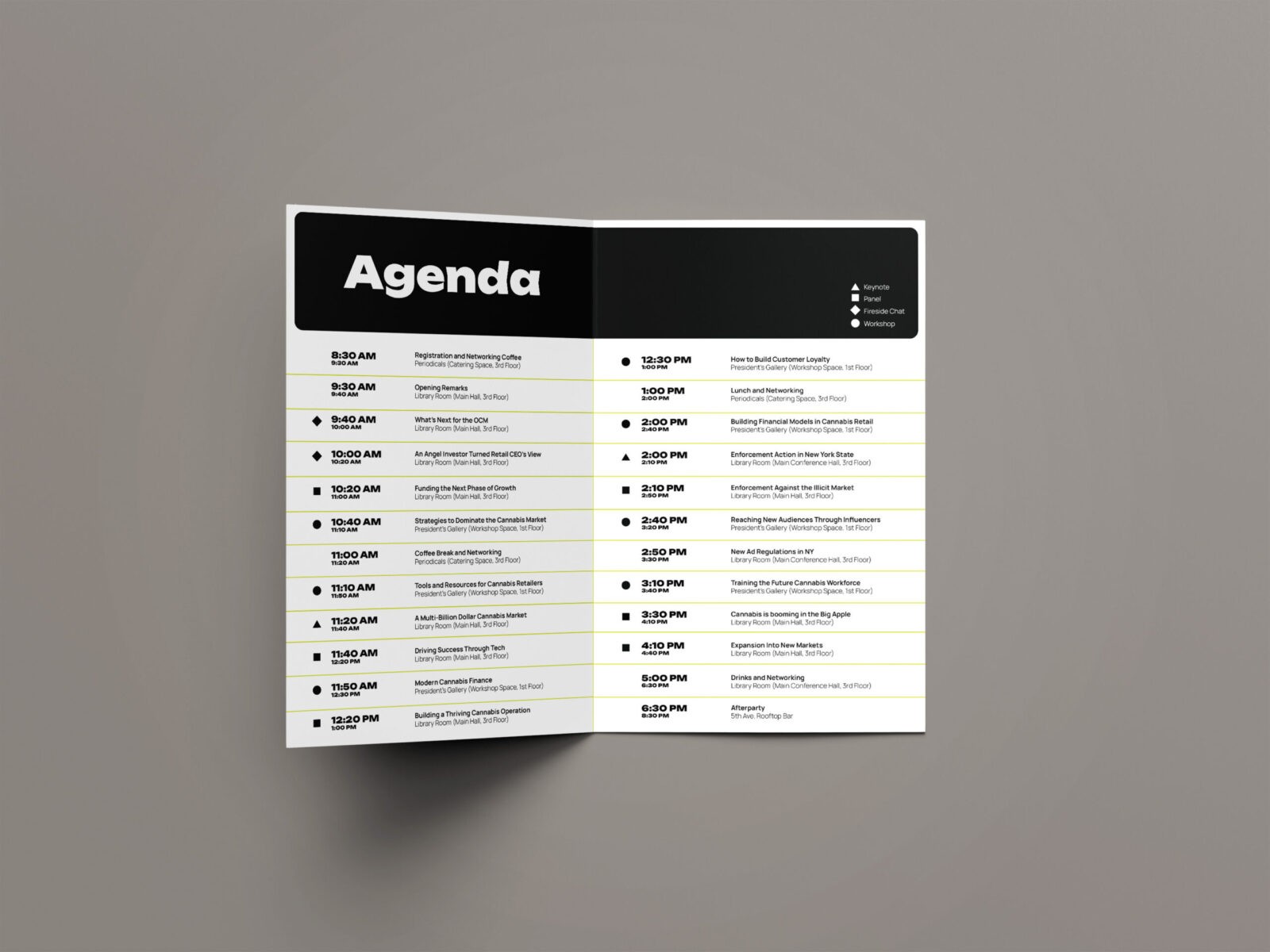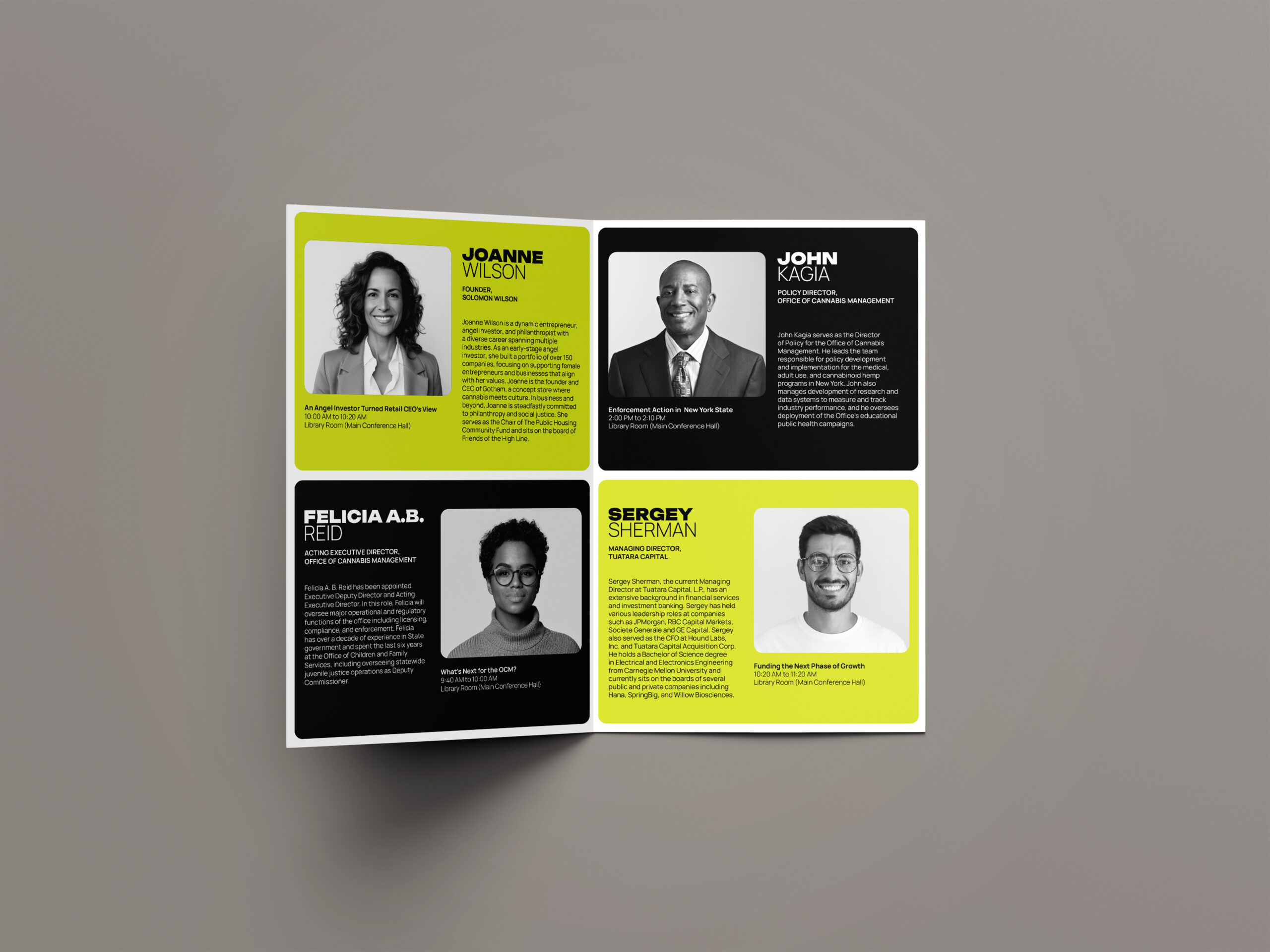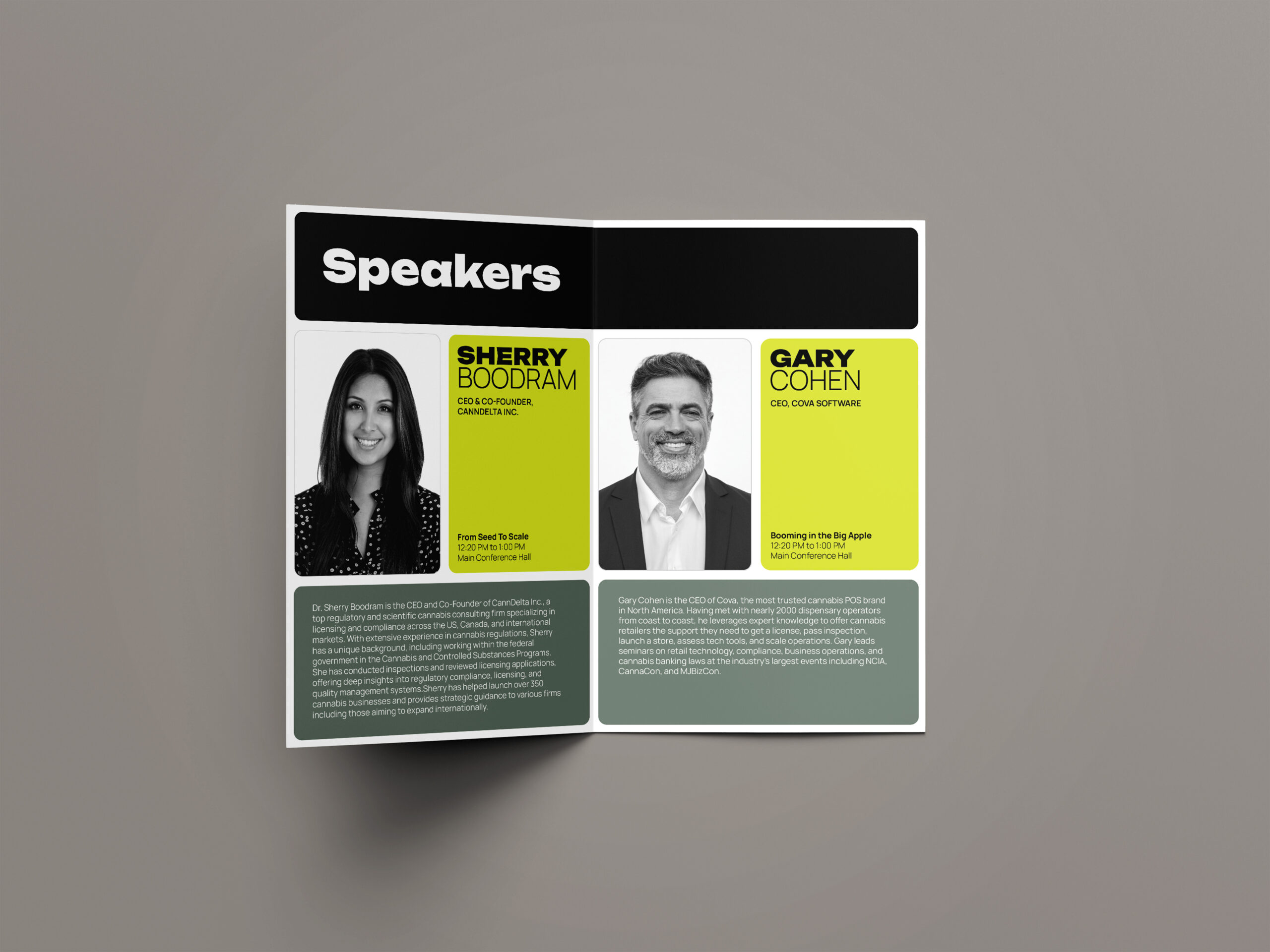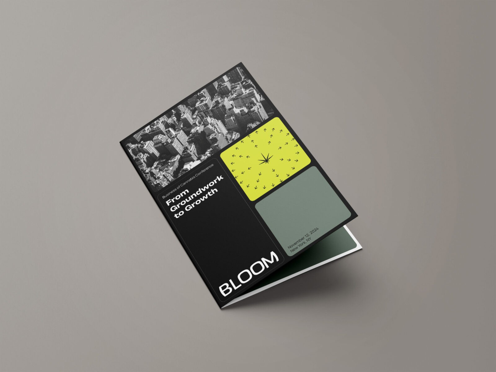 The visual identity reflects this elevated perspective with a system that is clean and mature. Utilizing a grid, the design emphasizes clarity and rationality, grounding the conference in professionalism while still creating space for energy and momentum. The palette of black, grey, and muted green establishes a serious, modern tone. A volt accent introduces a sense of momentum and distinction. This balance helps communicate Bloom’s role as both a credible authority and forward-looking. A key graphic element created for the system features a cannabis flower with arrows radiating outward in all directions. This visual functions as a metaphor for expansion symbolizing how the cannabis market continues to grow, diversify, and push into new territories. The result is a system that feels intentional and is capable of adapting to a wide range of needs.