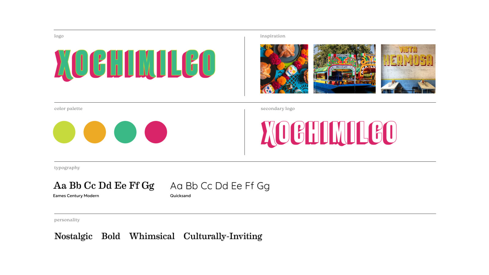 Xochimilco’s brand personality is best described as nostalgic, bold, whimsical, and culturally inviting. Whether someone has visited or lived in Mexico City or is simply a fan of Mexican culture, the brand offers an experience that transports its audience to the streets of Mexico City through flavor.