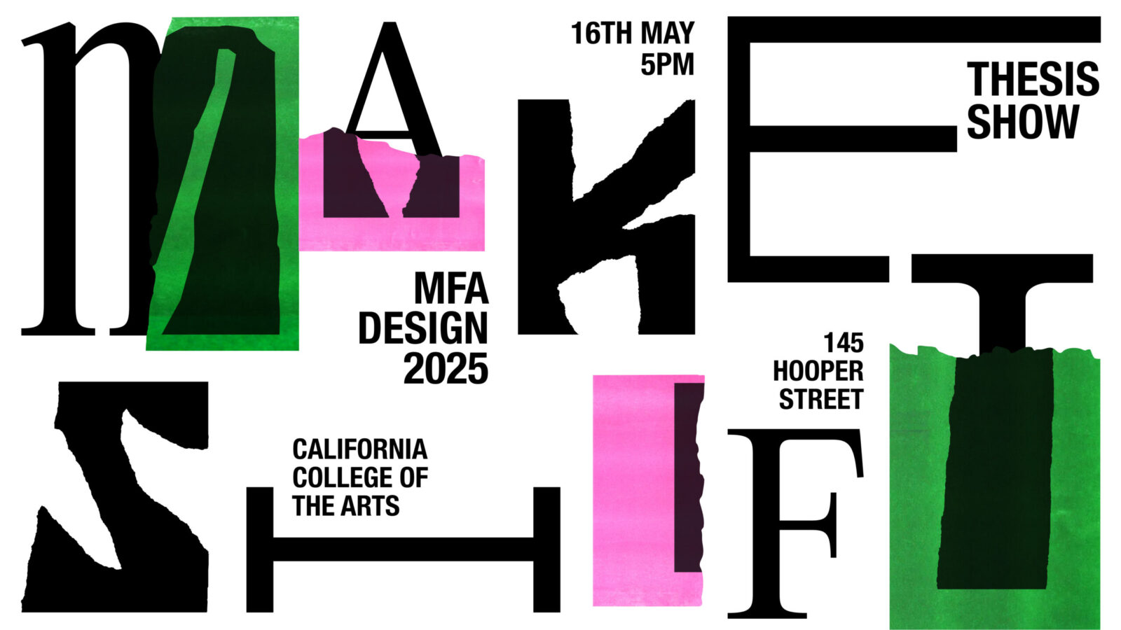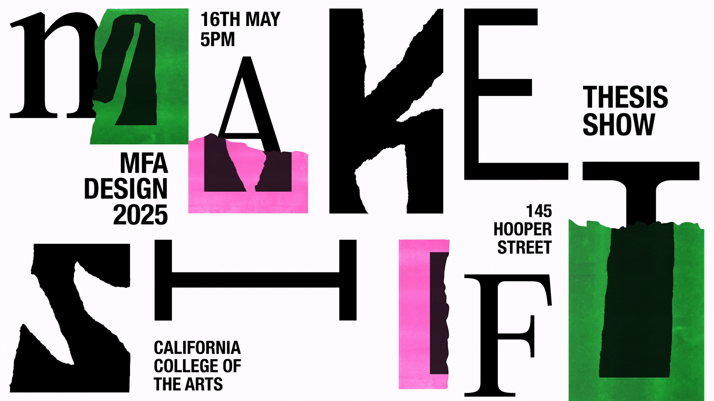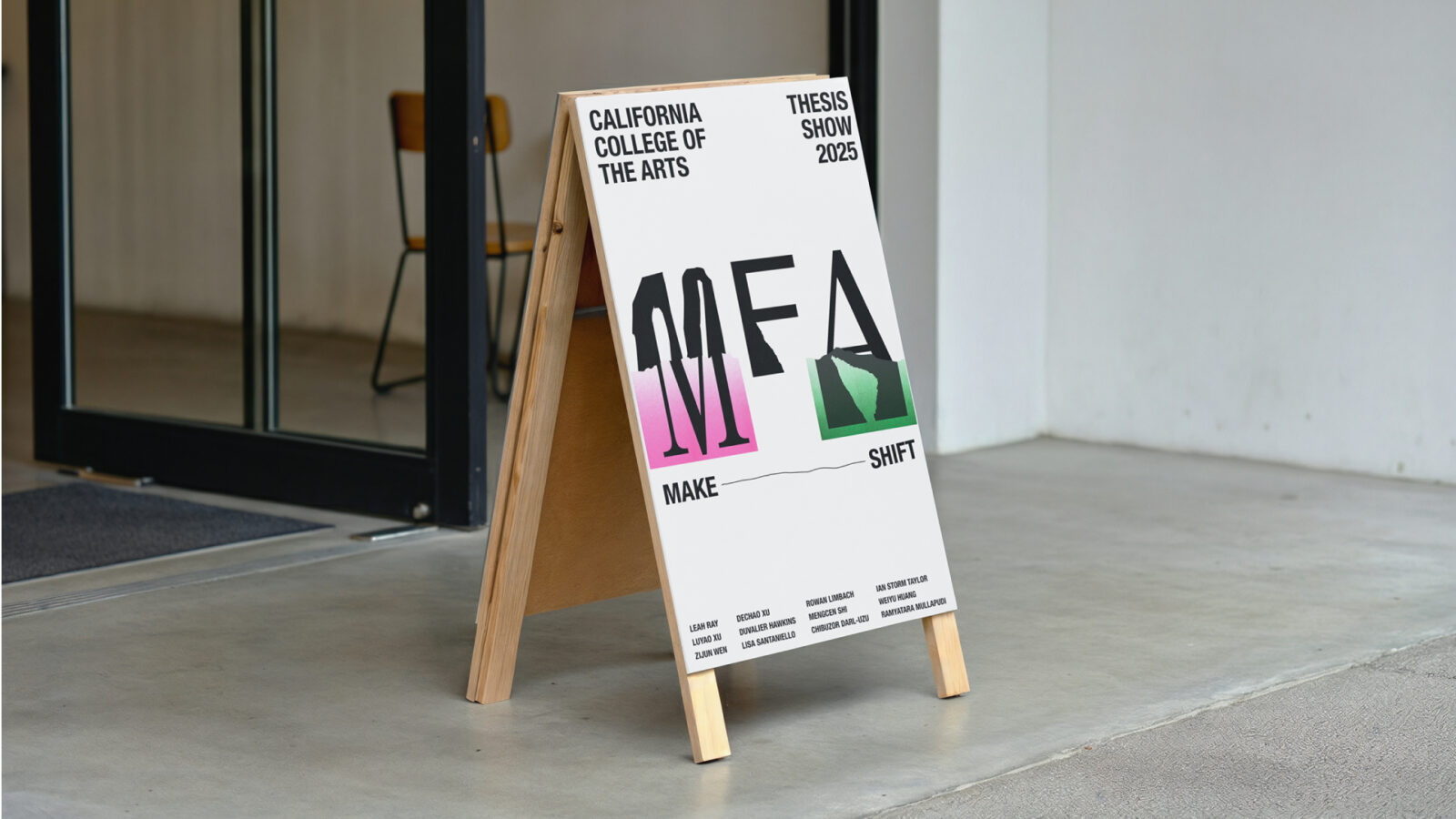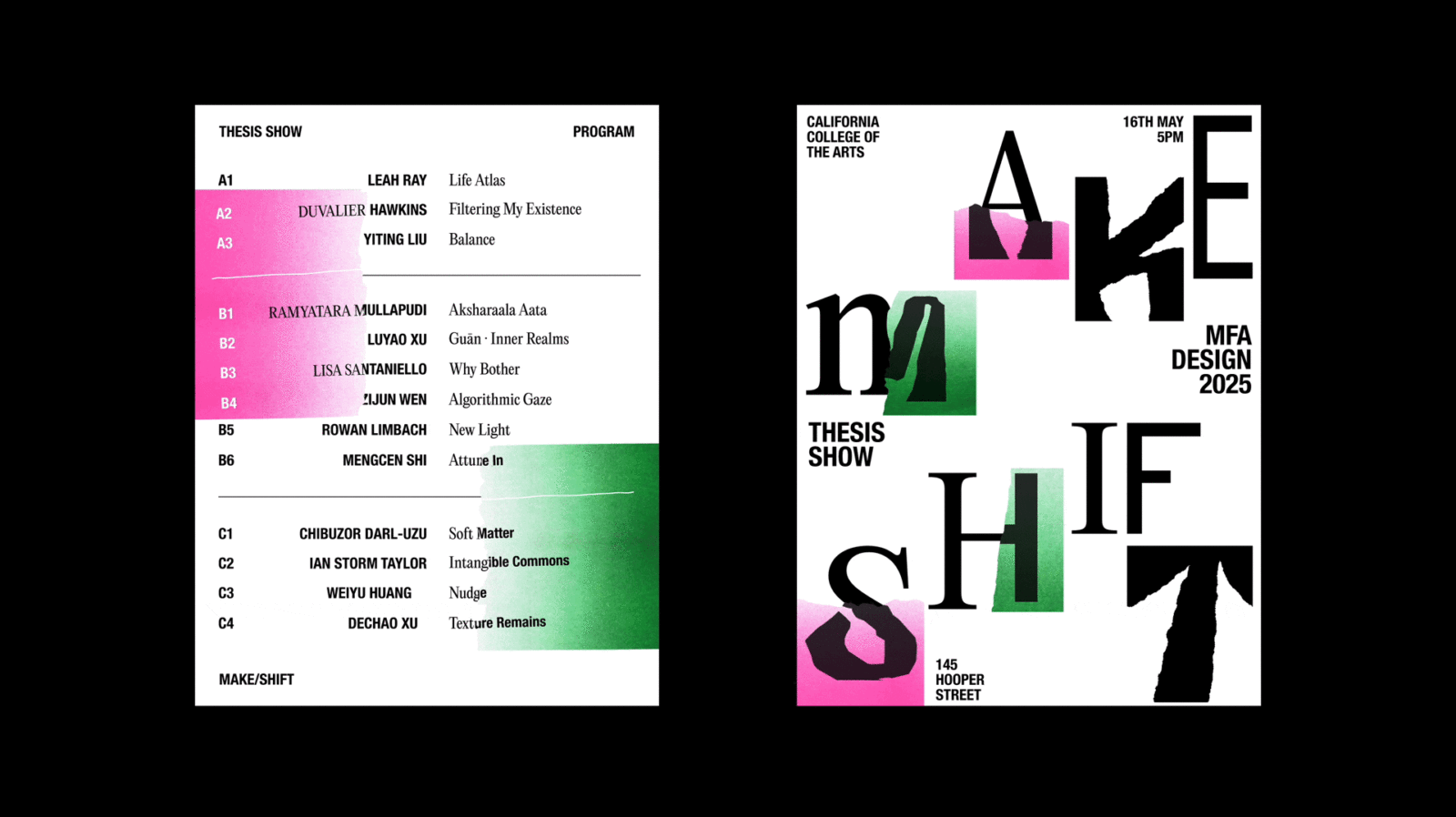 Make/Shift is the 2025 California College of the Arts MFA Design Thesis Exhibition. Its identity draws from the duality of its name: to make and to shift. At once generative and transitional, it reflects how design students respond to changing worlds while shaping new ones.