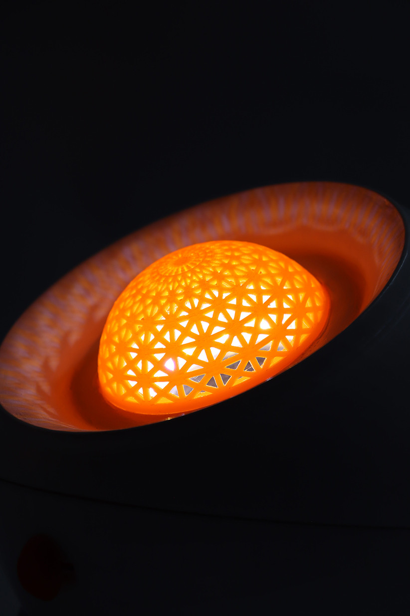 The object’s geometry is based on a hemispherical shape, intentionally designed to project light radially and generate an immersive and ambient atmosphere. The upper dome of the speaker is perforated with a carefully crafted pattern that allows beams of light to escape in defined directions, casting elegant and dynamic shadows that enrich the visual presence of the device in any space. These perforations are not only functional but also contribute to the aesthetic identity of Eclissi, making it a sculptural element even when not in use.