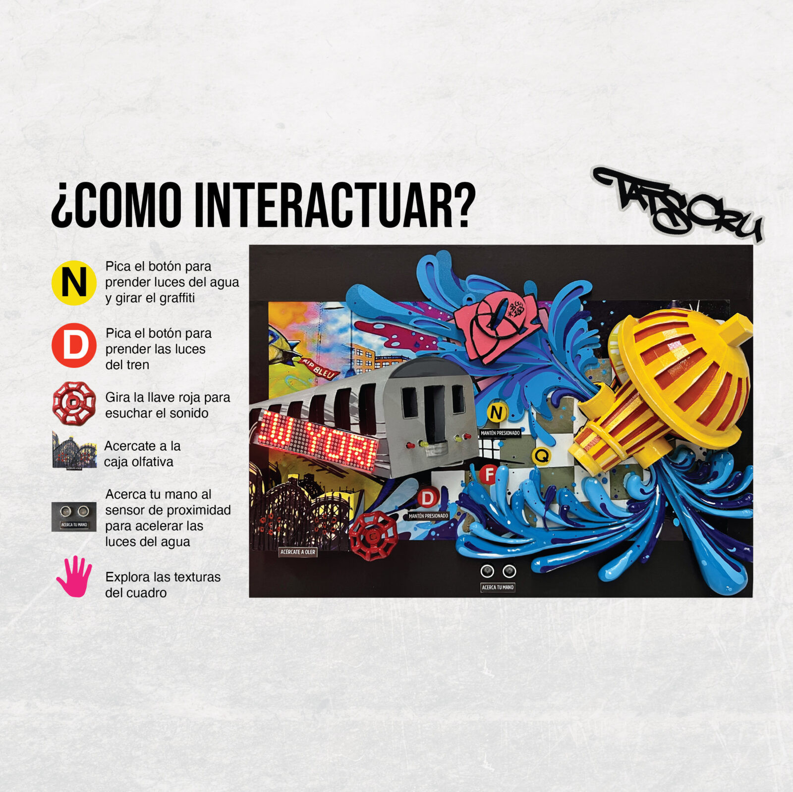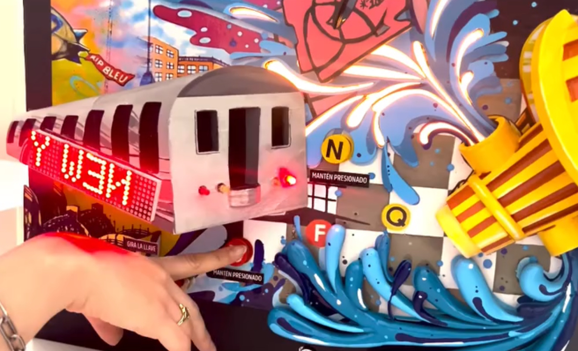 The creative process integrated various technologies: 3D printing in filament and resin, Arduino-activated sensors, LED lights, servomotors, a scent box, video mapping, and augmented reality. Iconic New York elements—like the rat, hot dog, subway train, and fire hydrant—were transformed into animated characters within a visual-urban narrative that enhances noise, movement, and disorder as expressive tools.
