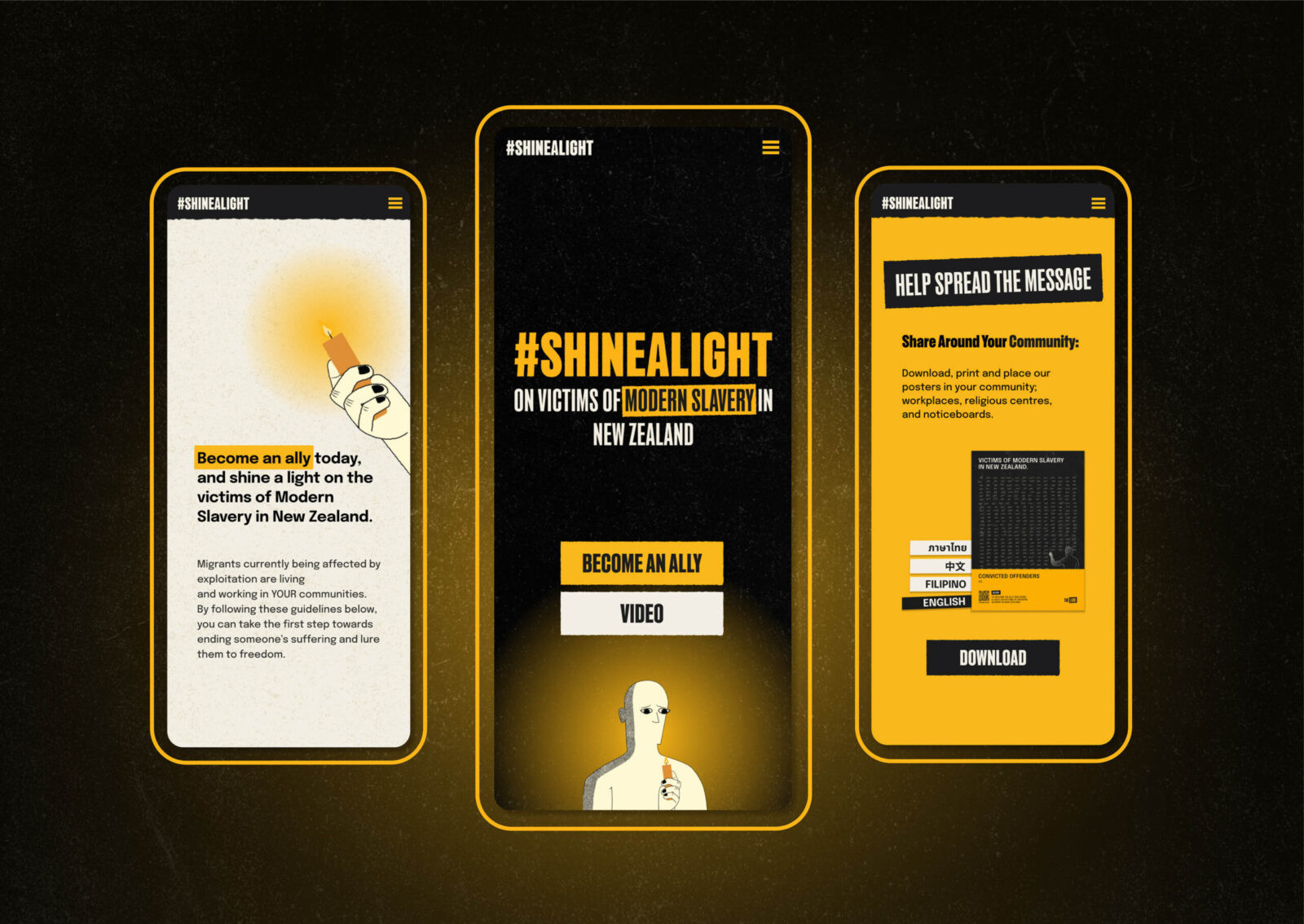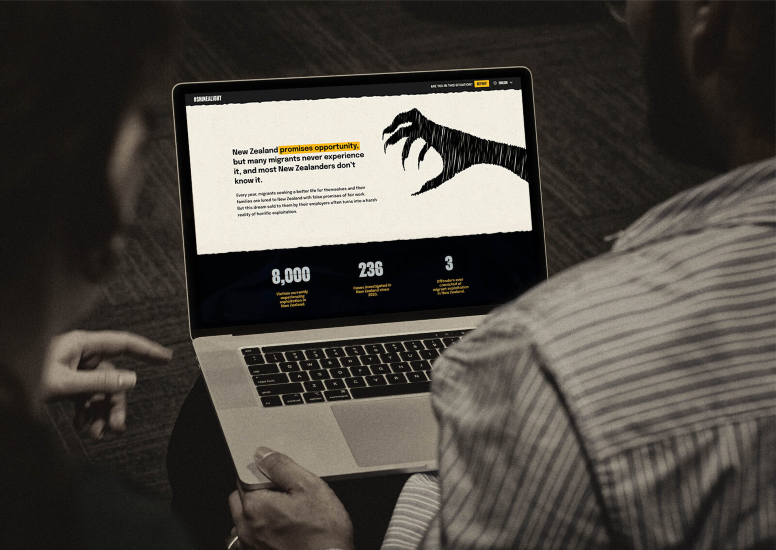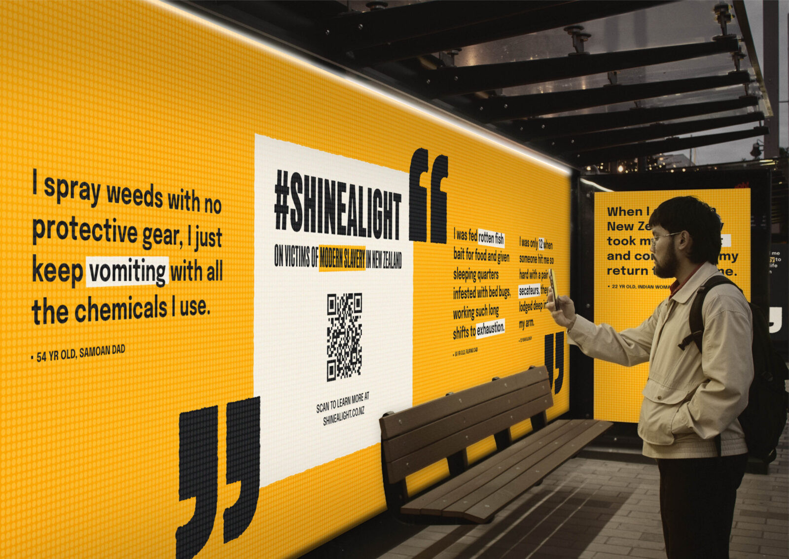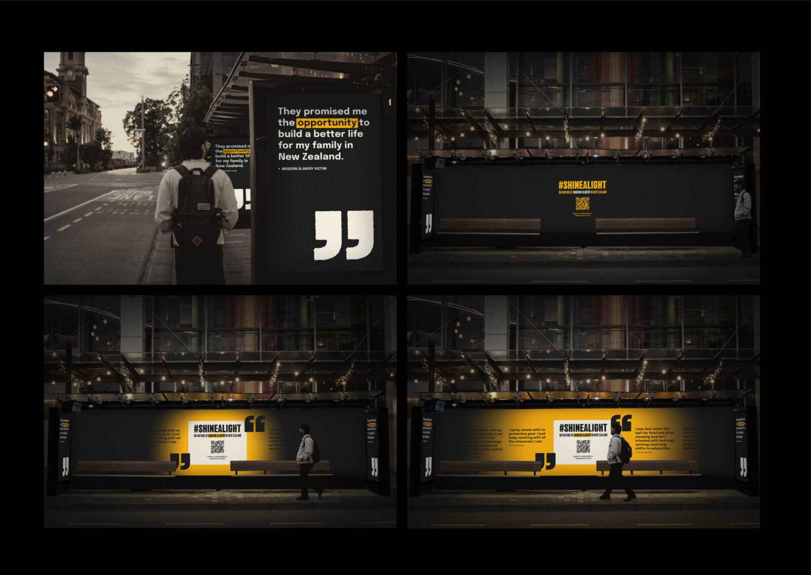 #SHINEALIGHT uncovers the hidden reality of modern slavery in Aotearoa, exposing the widespread exploitation of vulnerable migrants and challenging the individuals who exploit them. Through a compelling campaign video supported by powerful out-of-home (OOH) advertising, a dedicated website and social media, we chose to spotlight the harrowing victim stories and hard-hitting statistics that shocked our users. Our visual world leveraged contrasts of light and dark, symbolising the truth and the lie, revealing the shared experience of exploited migrants who were sold a dream but ultimately found themselves trapped by deceitful employers. Through messaging that speaks loudly to successful migrants who have found opportunity in Aotearoa, this campaign inspires those who may be closest to the victims to become allies by teaching them actionable steps to help victims report their employers.