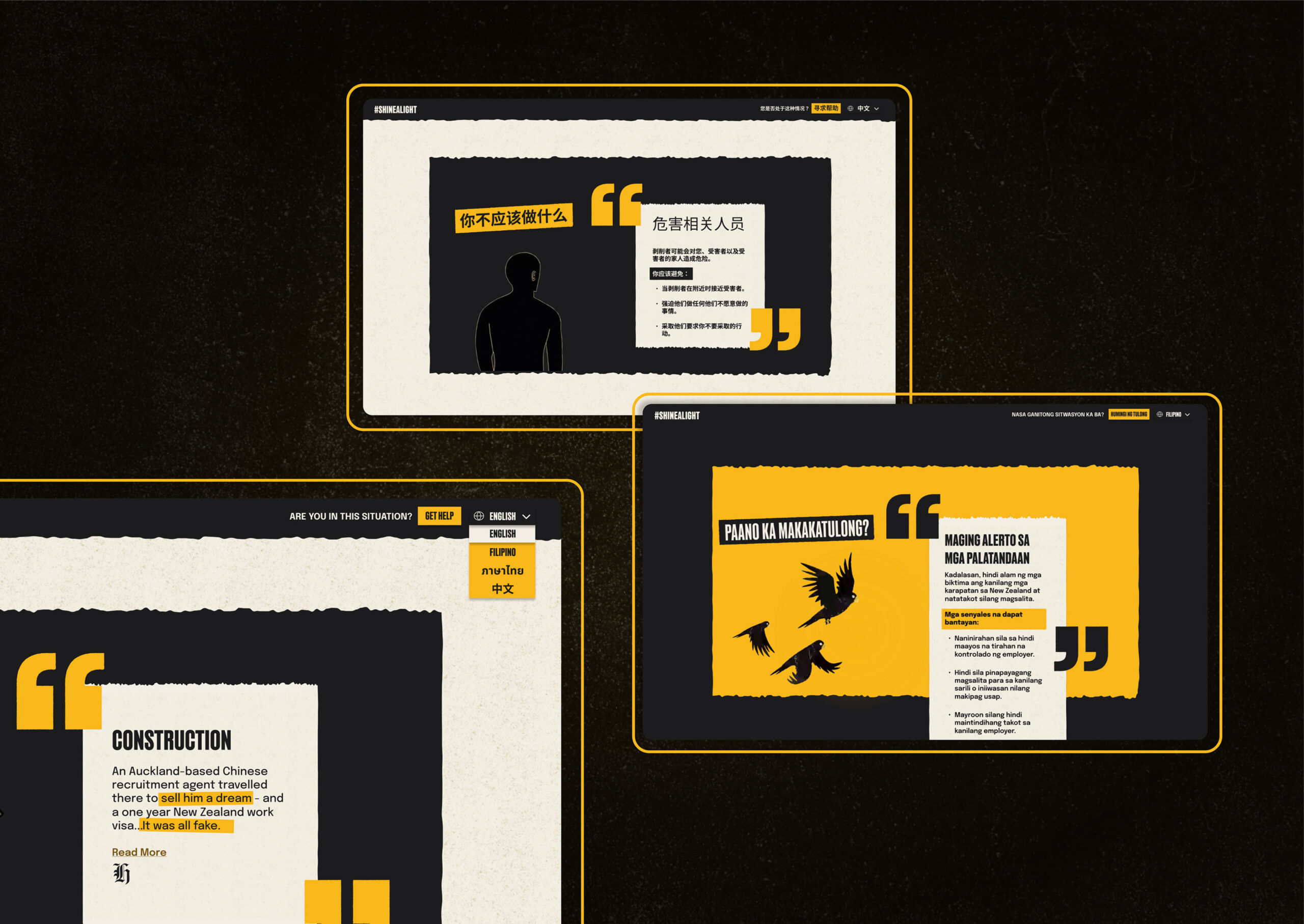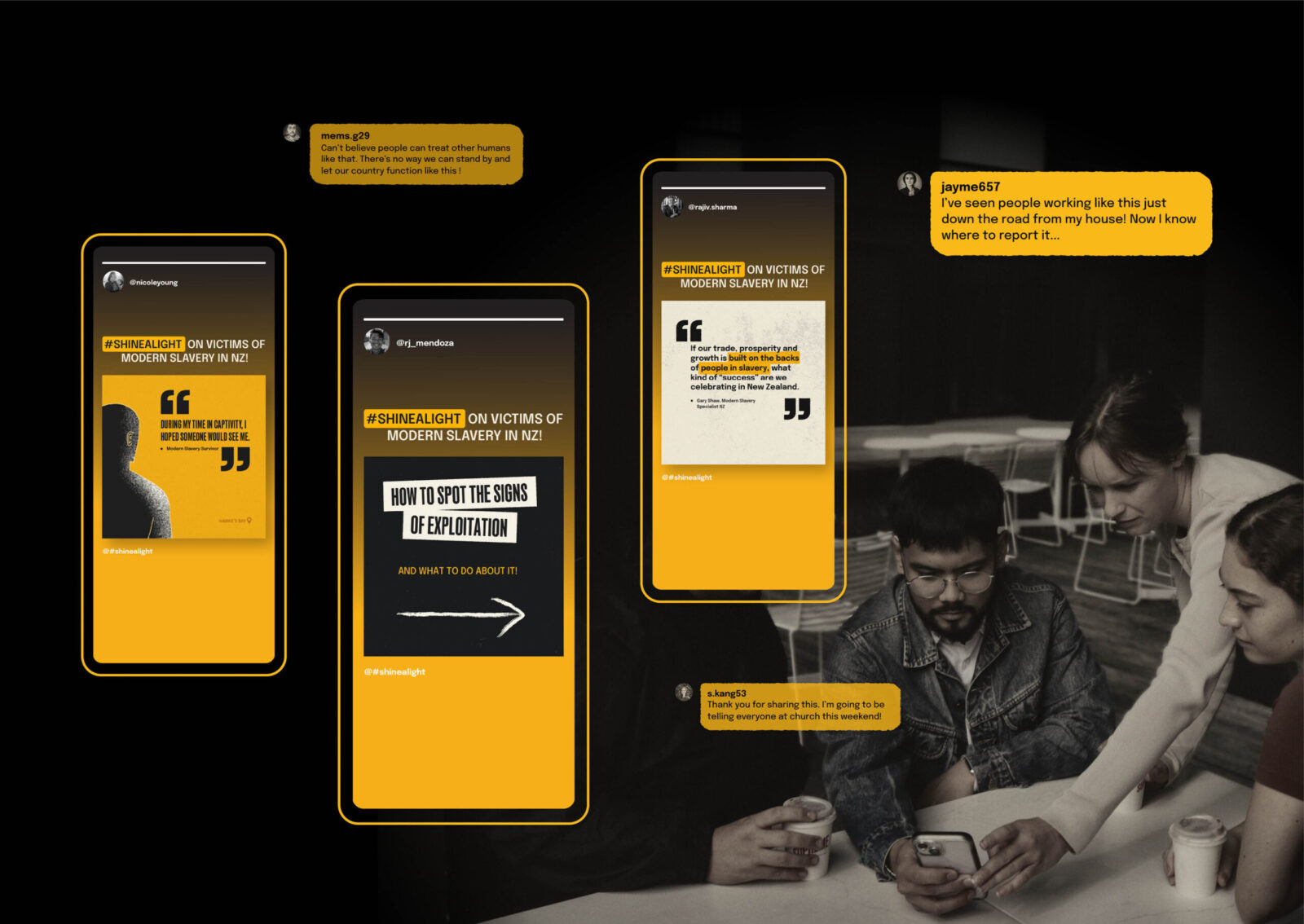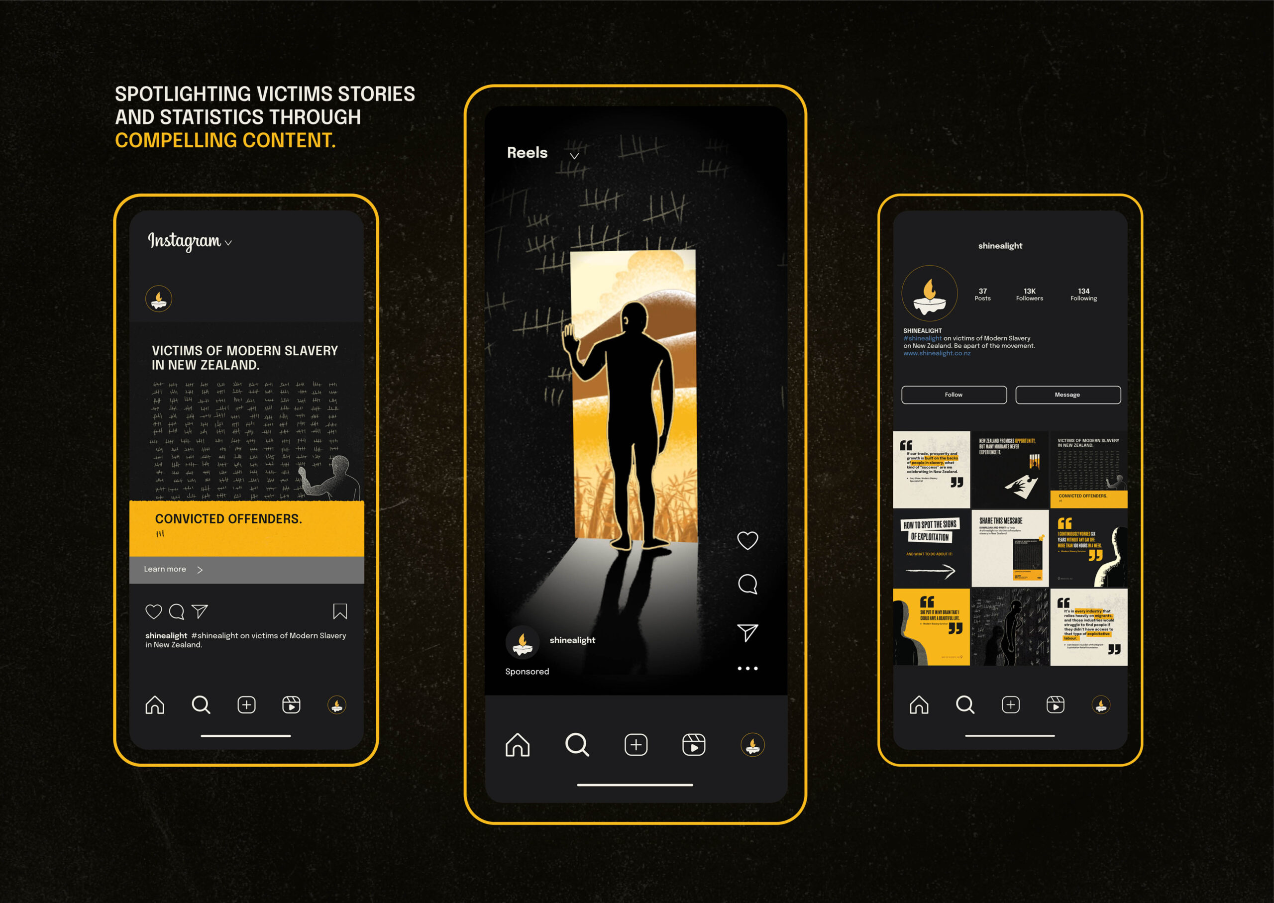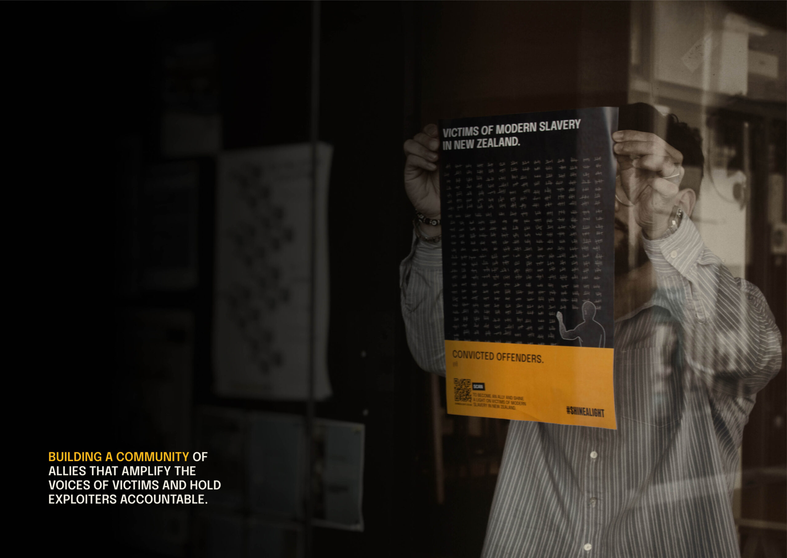 #SHINEALIGHT uncovers the hidden reality of modern slavery in Aotearoa, exposing the widespread exploitation of vulnerable migrants and challenging the individuals who exploit them. Through a compelling campaign video supported by powerful out-of-home (OOH) advertising, a dedicated website and social media, we chose to spotlight the harrowing victim stories and hard-hitting statistics that shocked our users. Our visual world leveraged contrasts of light and dark, symbolising the truth and the lie, revealing the shared experience of exploited migrants who were sold a dream but ultimately found themselves trapped by deceitful employers. Through messaging that speaks loudly to successful migrants who have found opportunity in Aotearoa, this campaign inspires those who may be closest to the victims to become allies by teaching them actionable steps to help victims report their employers.