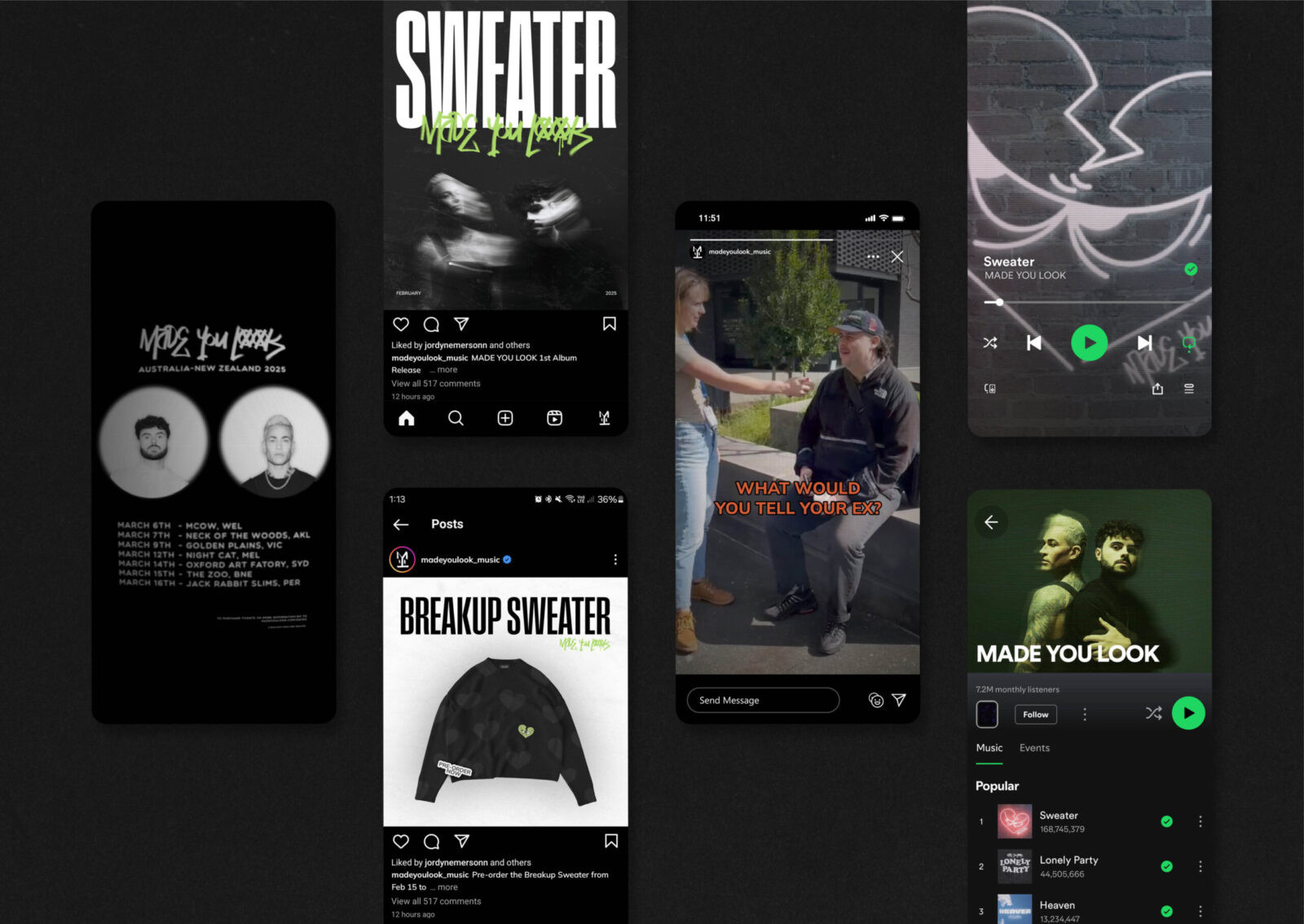 Made You Look is a newly debuted duo under Sony Music Entertainment New Zealand. Consisting of drummer and producer Shelton Woolright and vocalist and producer Alex Thompson, the pair have a meaningful history they are ready to share on an international scale. They launched with four singles just before festival season, which is a time of fierce competition. To break through the noise, the challenge was to establish a fresh and bold brand identity that introduced the band and sustained interest throughout their career. Targeting young adults who value relatability, fun, and music, the project aimed to create a lasting visual presence and grow a global audience.
