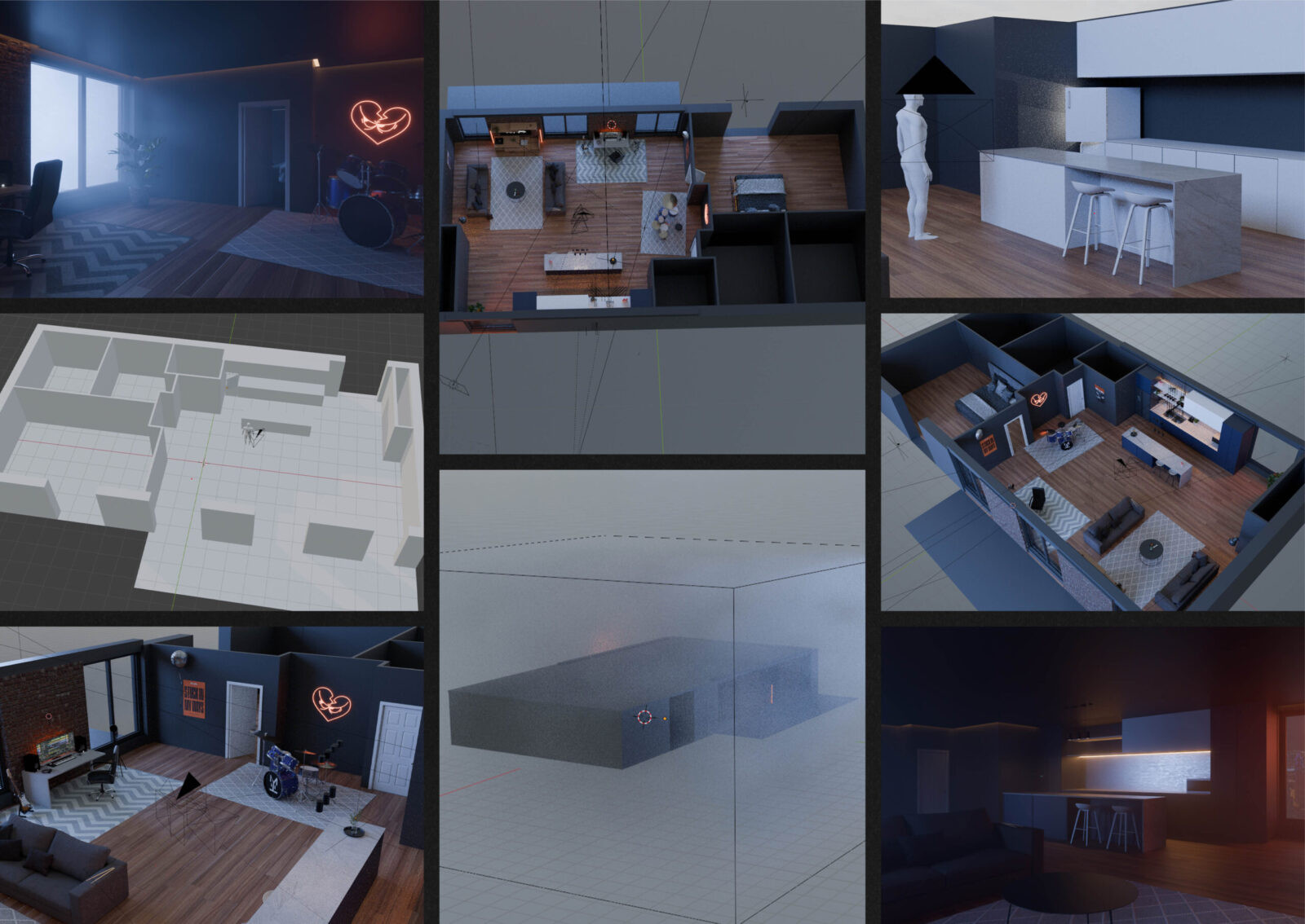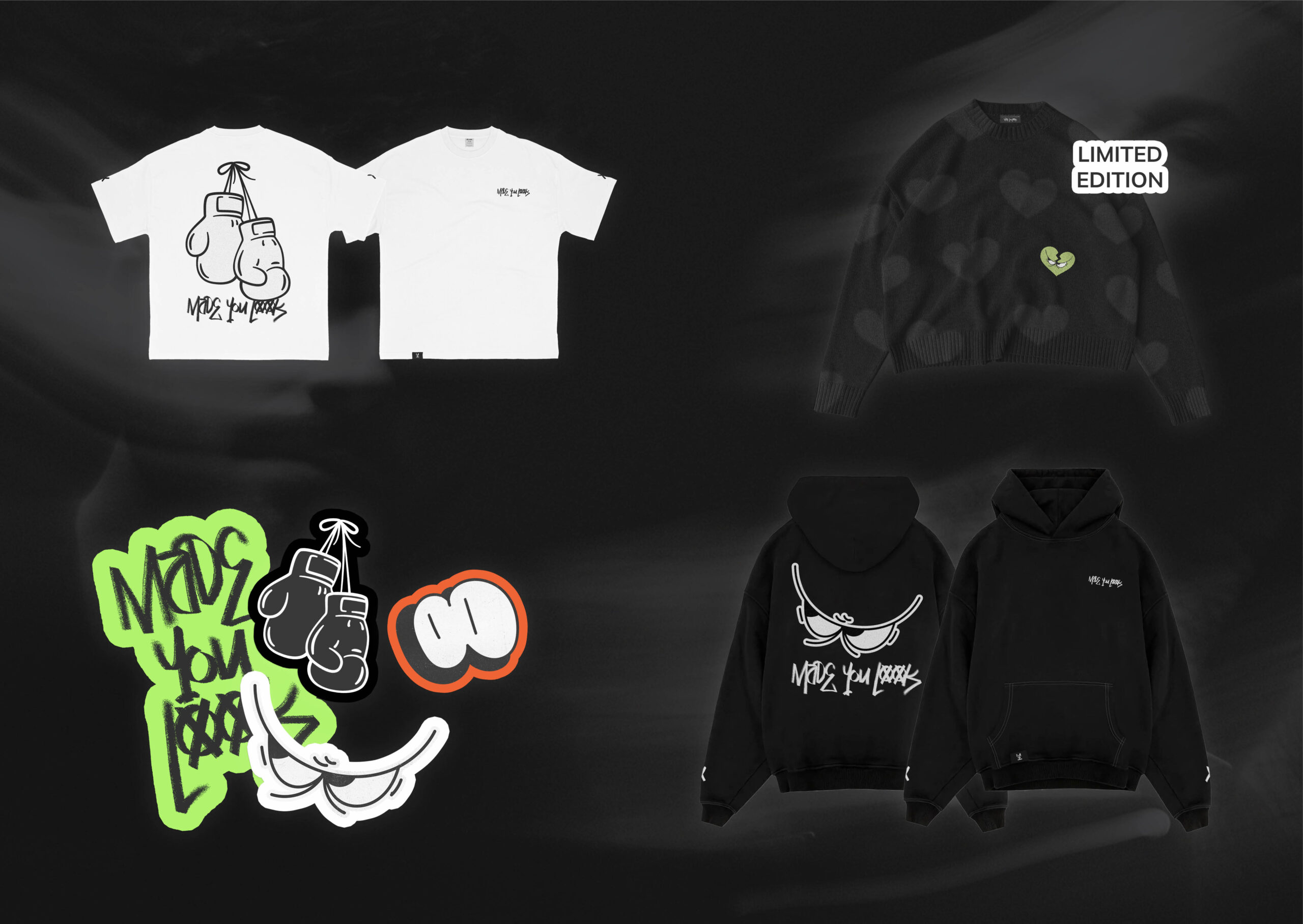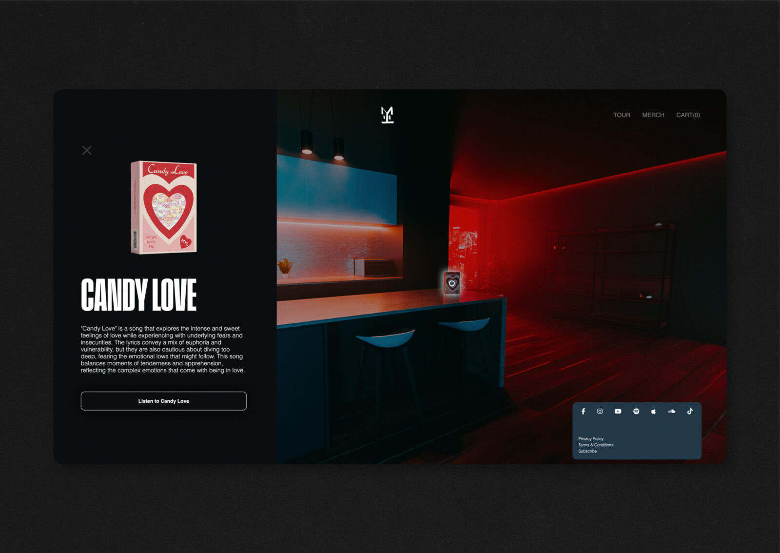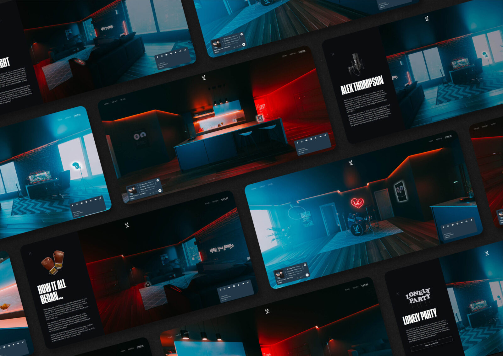 The core idea was to build a digital experience that drew fans into the world of Made You Look. This included a fully interactive 3D studio apartment featuring hidden items that tell their story, promote their discography, and link to other pages. Every object in the space revealed a part of the band’s identity, like the boxing gloves which shared the story of how the pair met. The more users explored, the more they uncovered, encouraging repeat visits as content was updated. The website experience was supported by a campaign that included visualisers, merchandise, street posters, and social media reels. The design focused on building a strong visual identity that matched the band’s edgy aesthetic. A moody colour palette with vibrant glows helped create an atmosphere that reflected the tone of their music. This extended into the lighting, which gave the space a cinematic feel, with each corner styled to reflect the Made You Look brand.