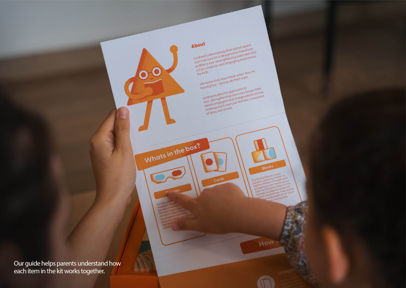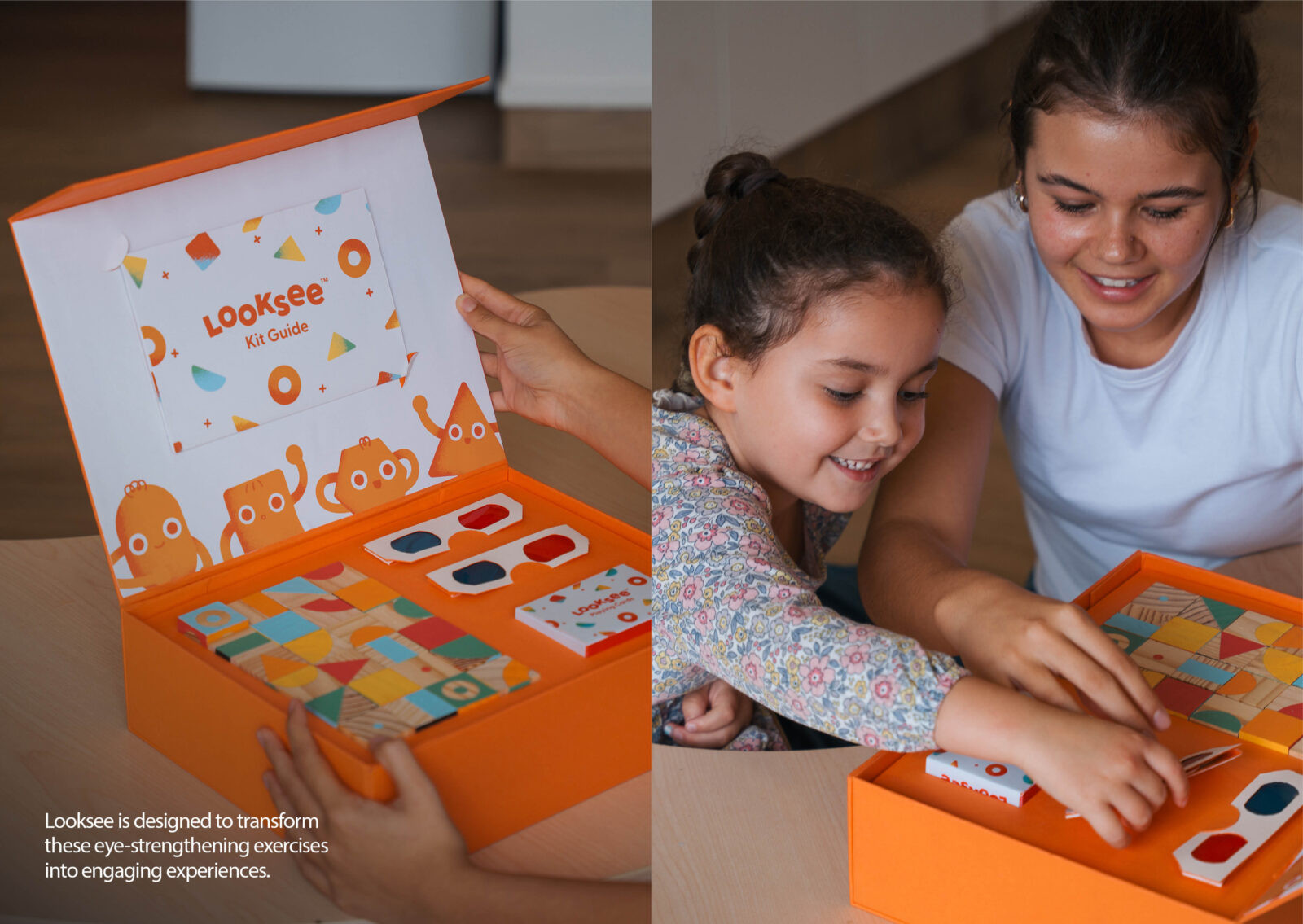 Looksee has the potential to improve the experience of vision therapy for young children significantly. Turning treatment into play reduces resistance and builds more consistent routines, encouraging positive behavioural change. Parents shift from enforcers to partners, strengthening their bond with their child through shared moments. Socially, Looksee helps normalise eye care, easing the stress and stigma often linked to treatment. It offers a non-digital, low-cost alternative that is easy to use, share, and access globally. Its thoughtful physical design, paired with storytelling and creative engagement, redefines treatment as something joyful and empowering. Though still in its early stages, Looksee has been well-received by clinicians and families, showing strong potential for wider adoption through orthoptists and online channels.