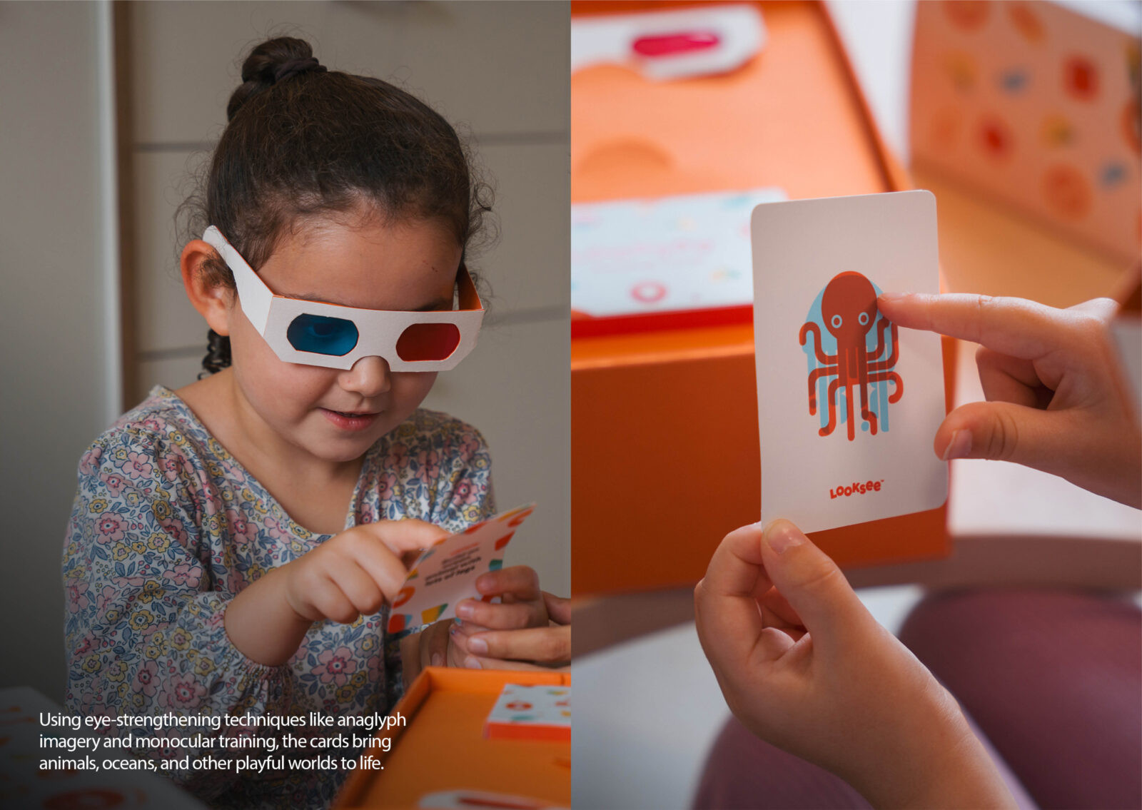 Looksee’s design execution is tactile, playful, and technically precise. It uses bold colours, simplified shapes, and thematic illustrations (animals, space, and fantastical worlds) to stimulate engagement and visual development. The red/blue glasses, sized for young children, work seamlessly with anaglyph prompt cards to isolate each eye, enhancing visual therapy through dynamic imagery.